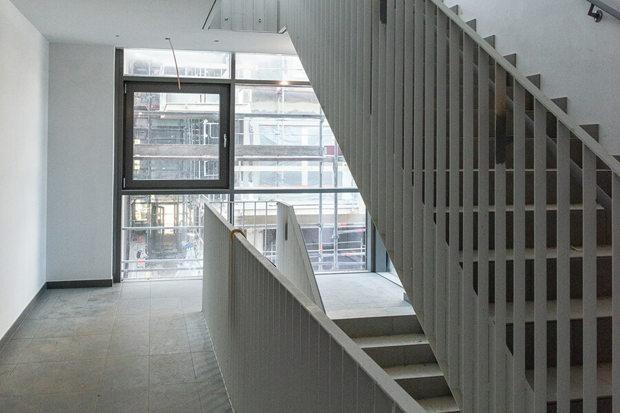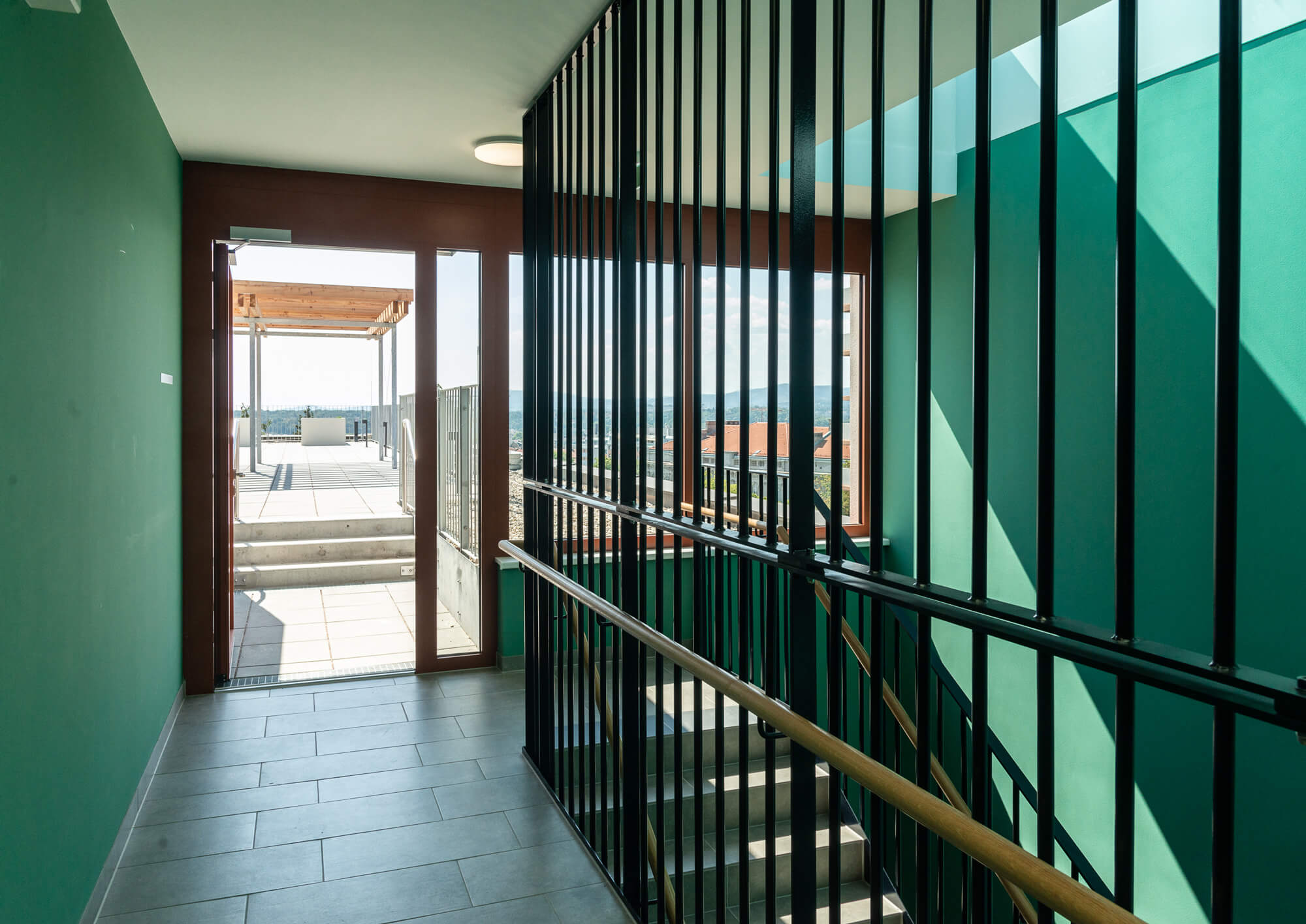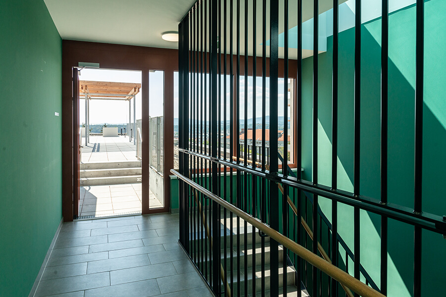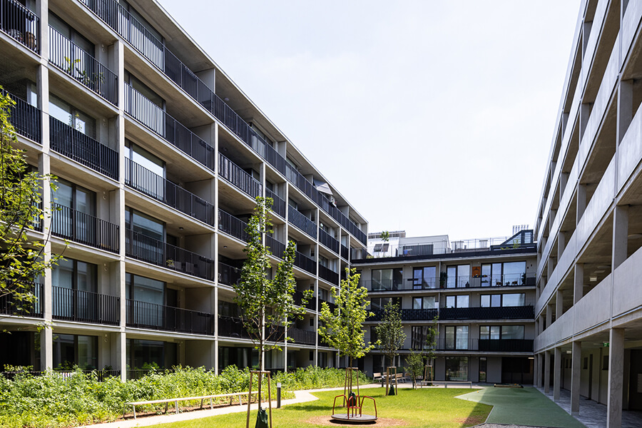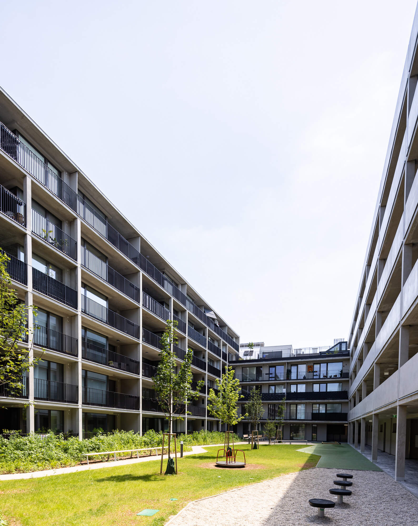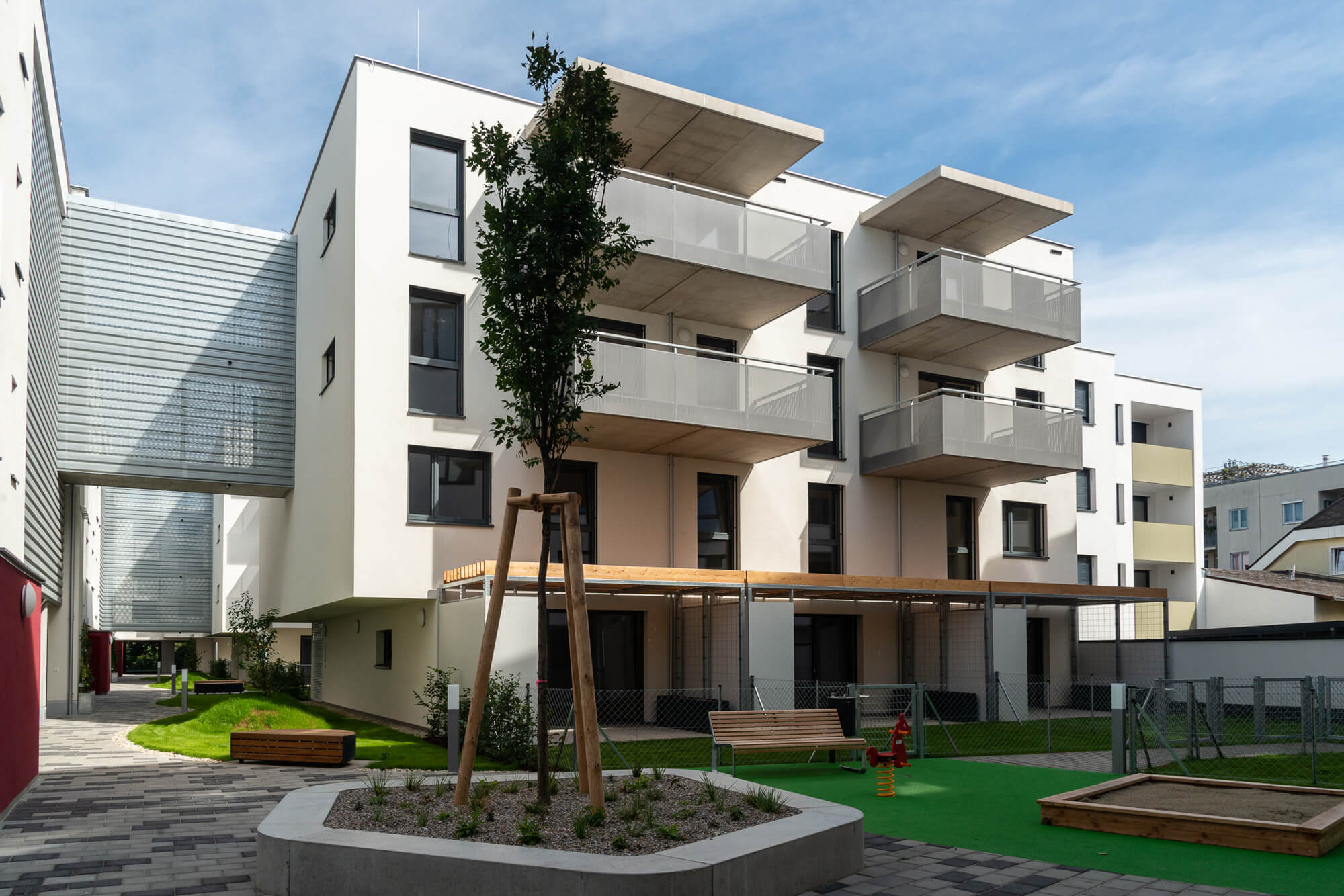 Ab dem Erdgeschoß werden die freifinanzierten Wohnungen in vier Stiegenhäuser aufgeteilt. Zwischen den Stiegen befinden sich Eigengärten, Spielplätze, Sitzmöglichkeiten sowie Fahrradabstellflächen.