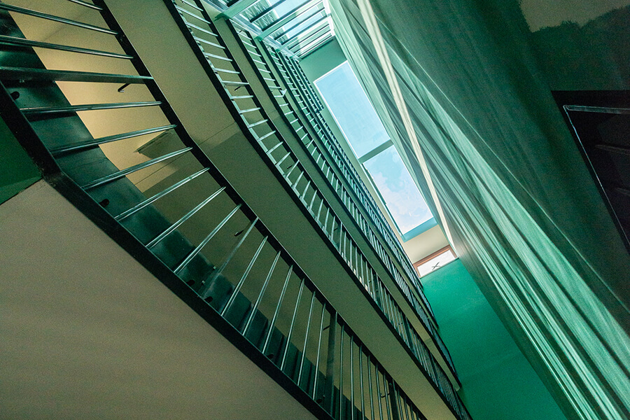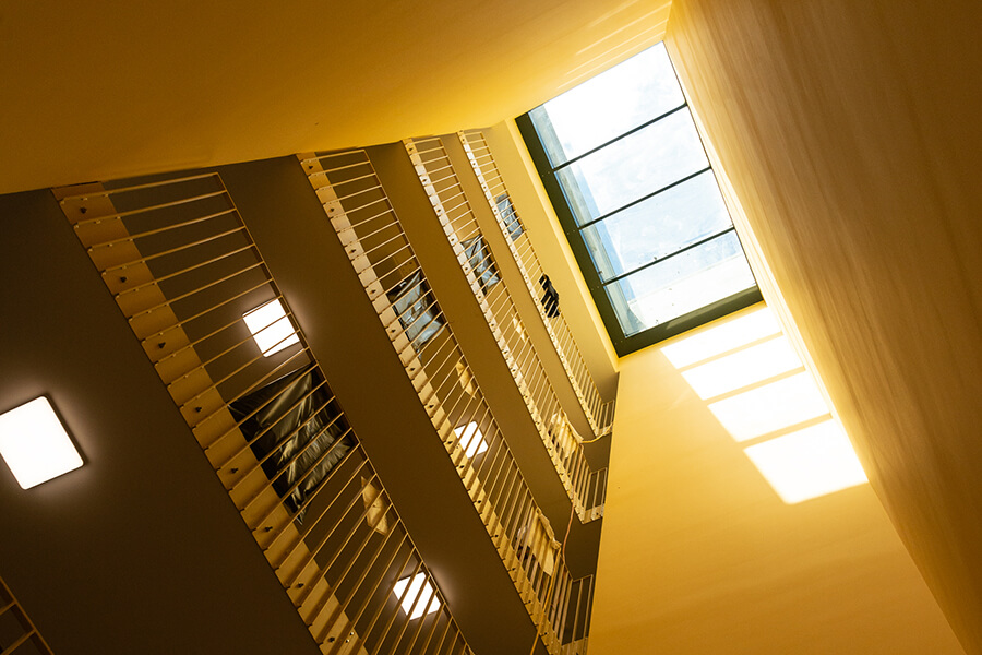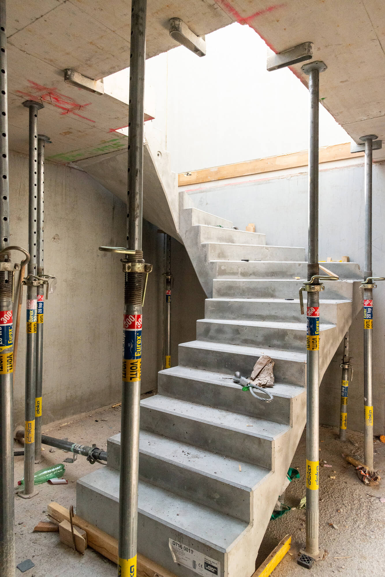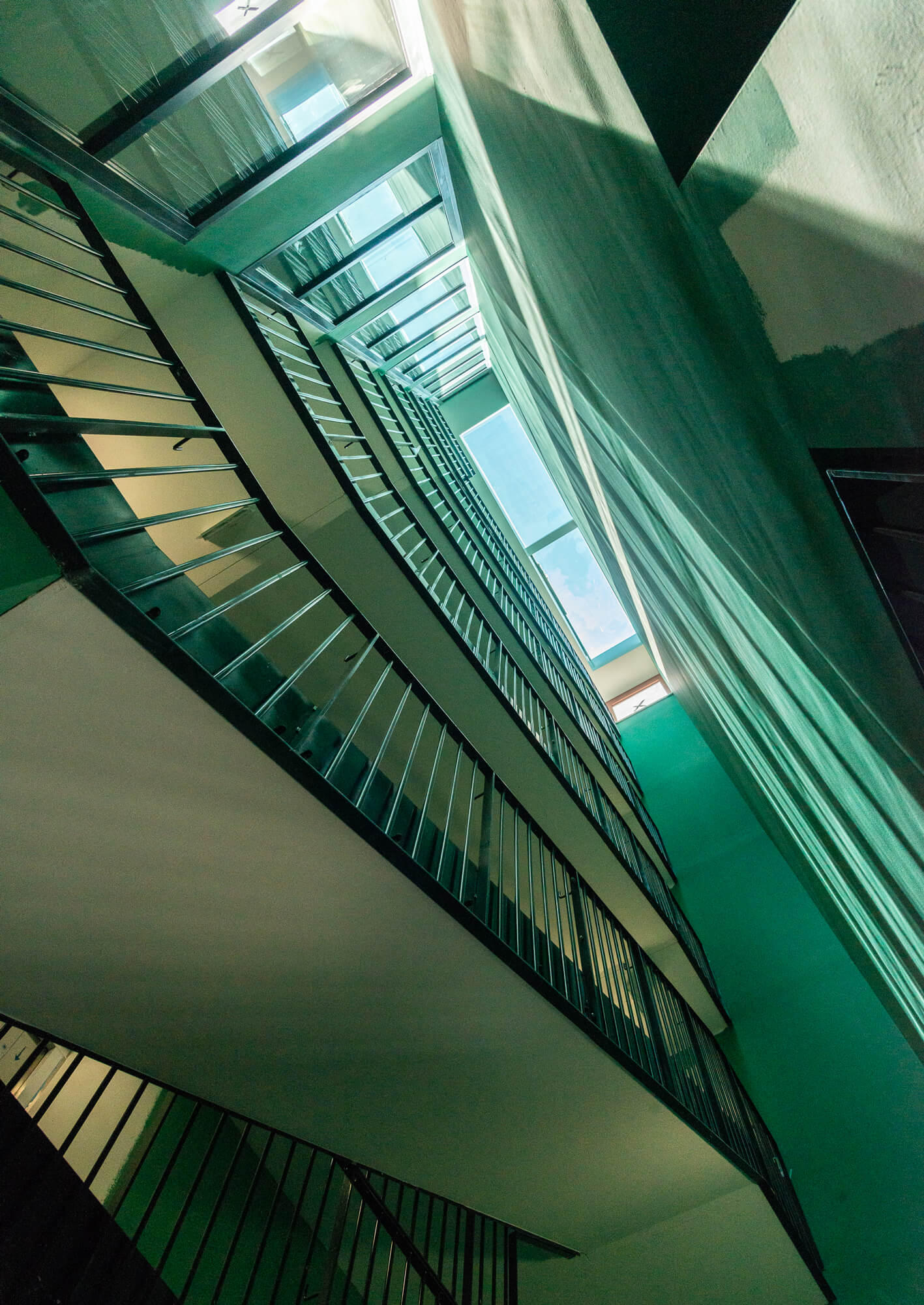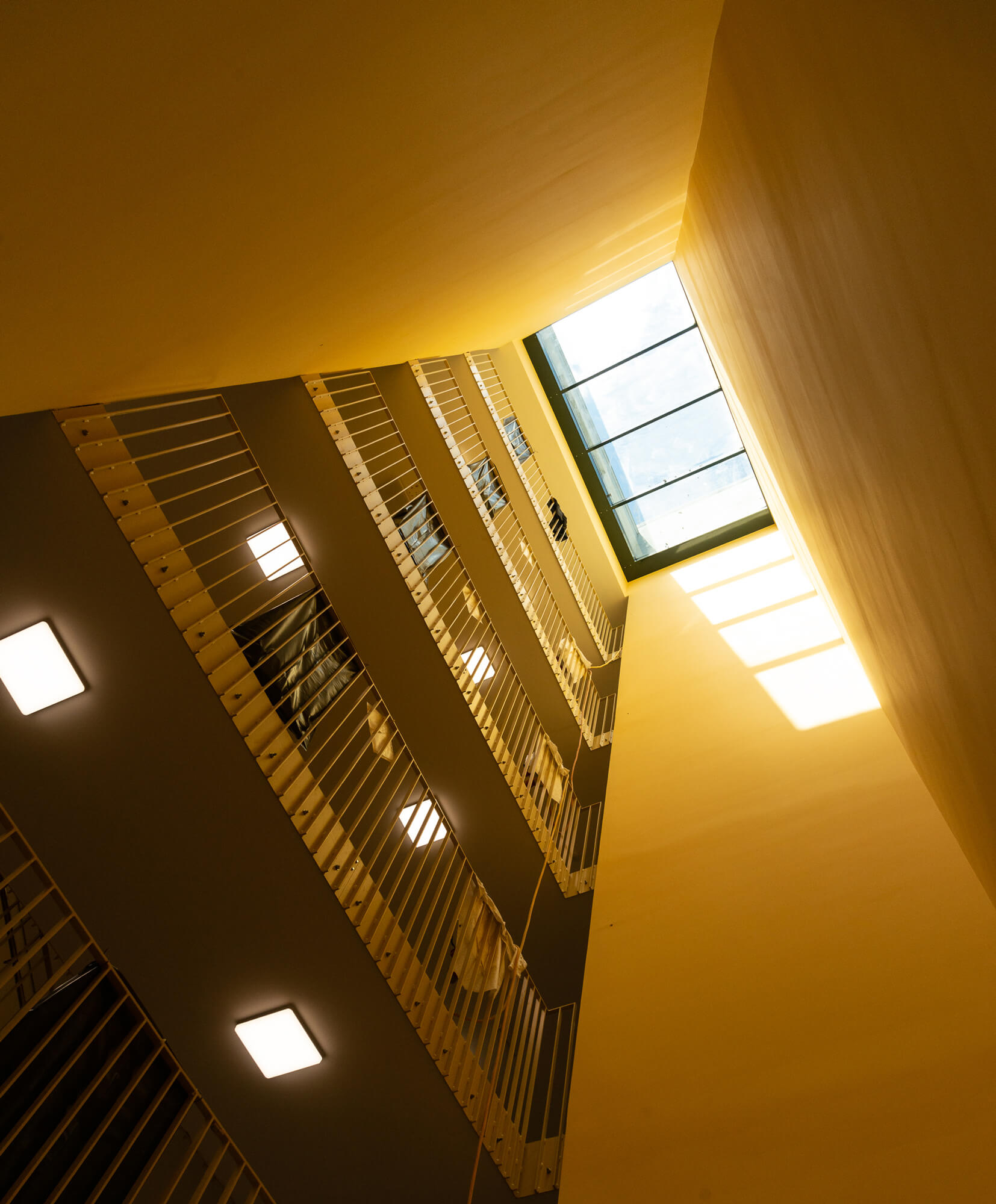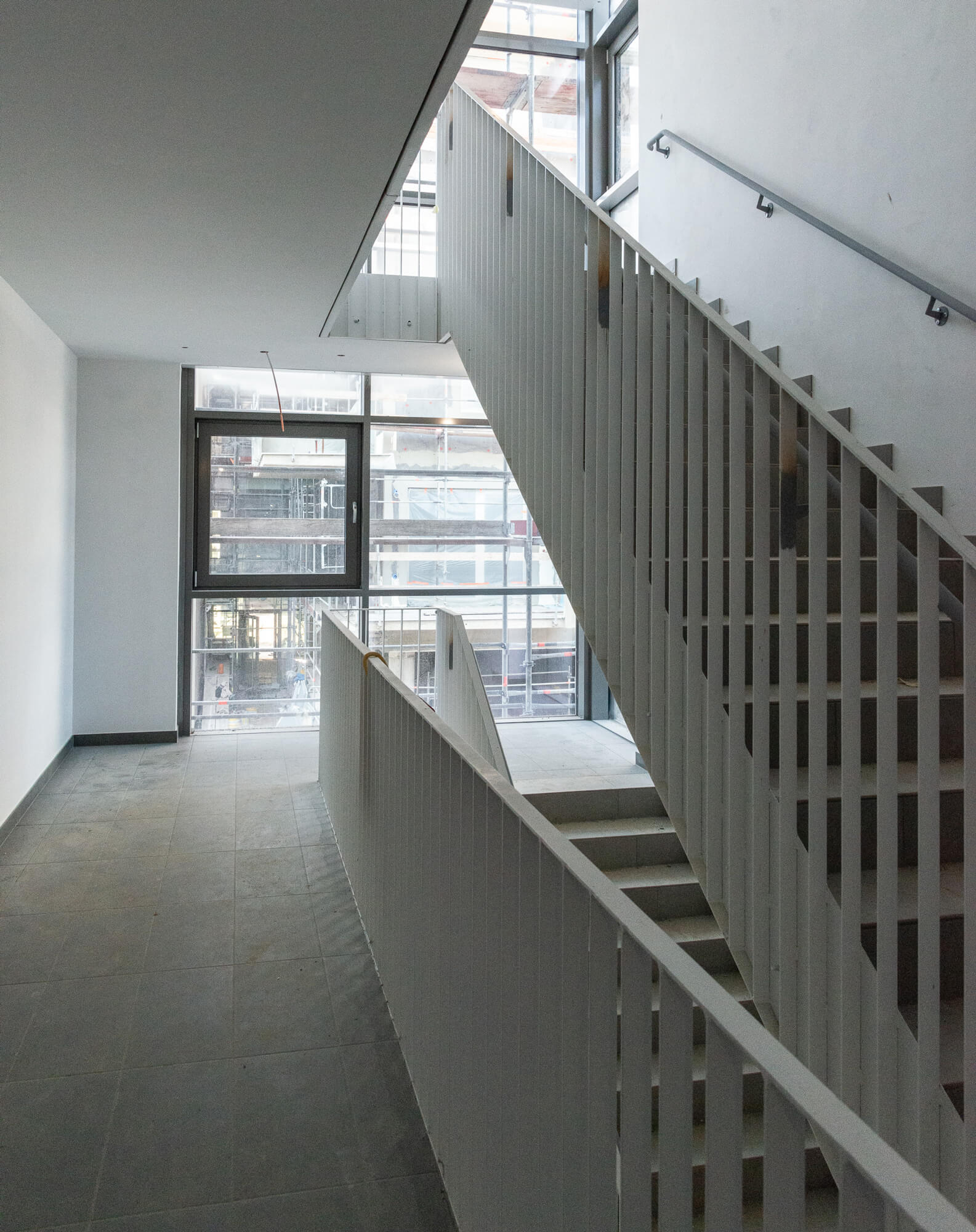 Ab dem Erdgeschoß werden die freifinanzierten Wohnungen in vier Stiegenhäuser aufgeteilt. Zwischen den Stiegen befinden sich Eigengärten, Spielplätze, Sitzmöglichkeiten sowie Fahrradabstellflächen.