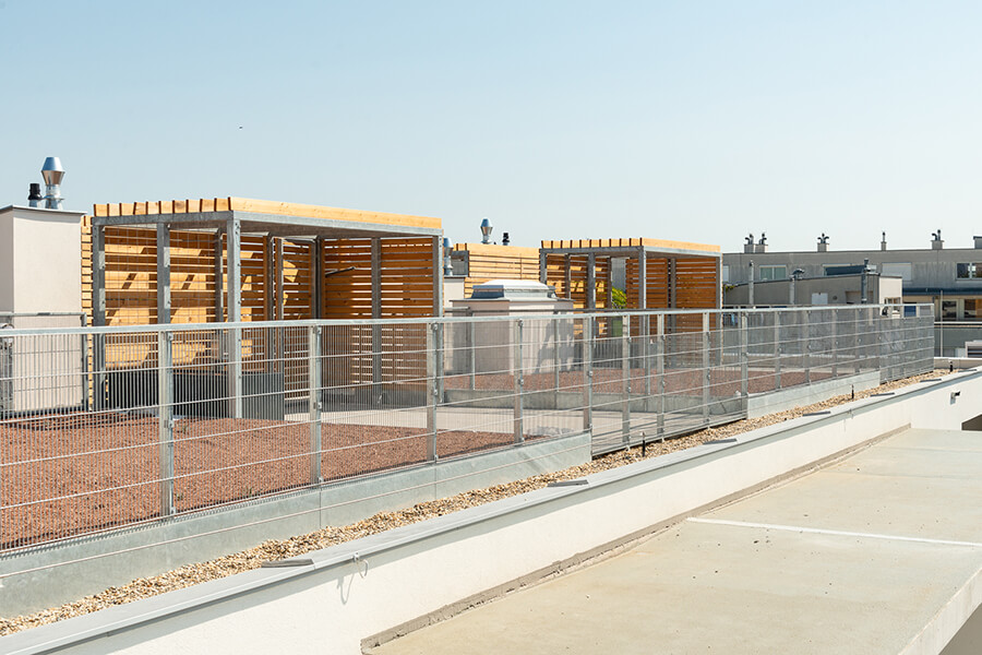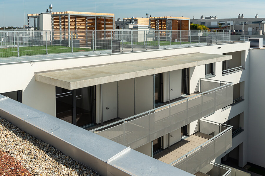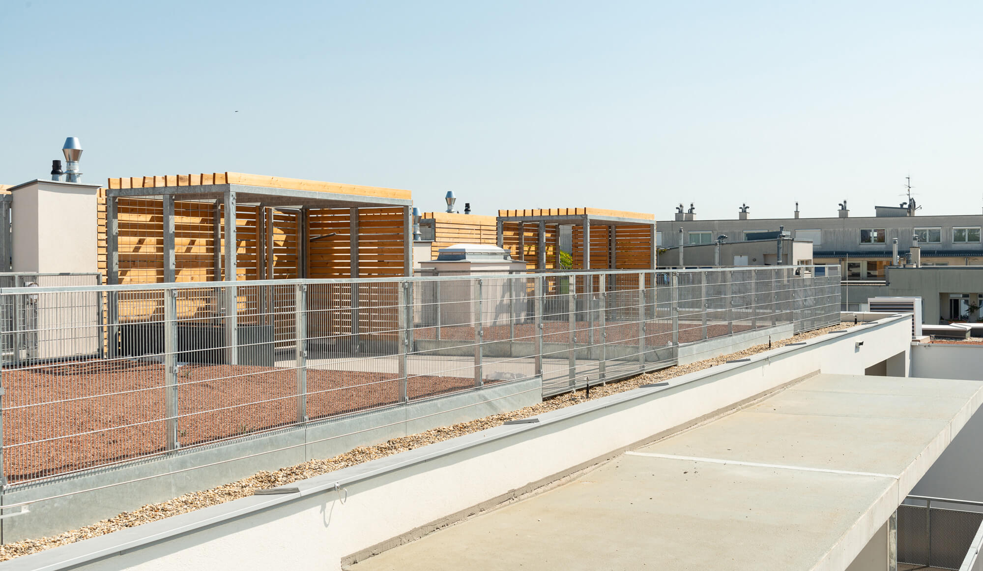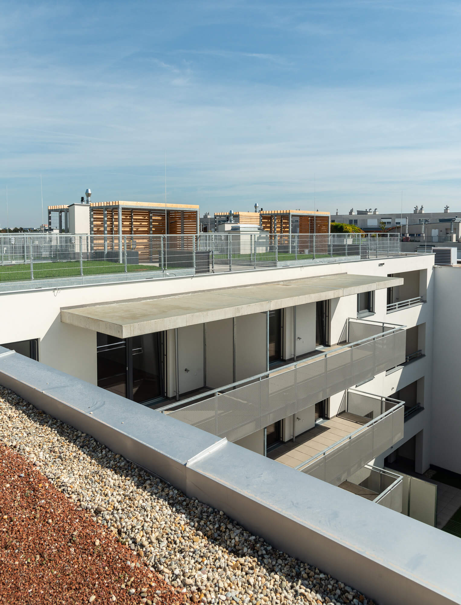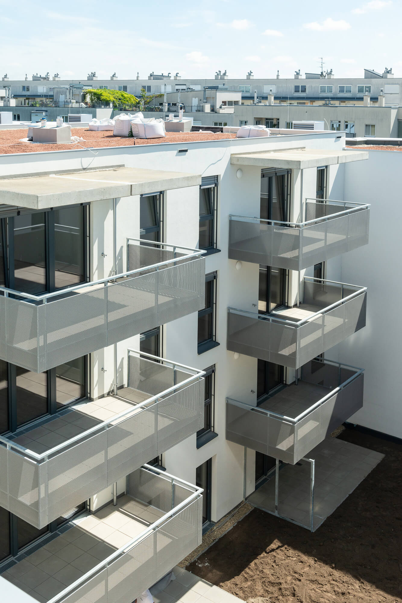 Weiters verfügen alle Wohneinheiten über Freiflächen wie Terrassen, Balkone und Loggien. Auf den niedrigen Seitentrakten befinden sich Dachterrassen, die von den Mietern genutzt werden können.