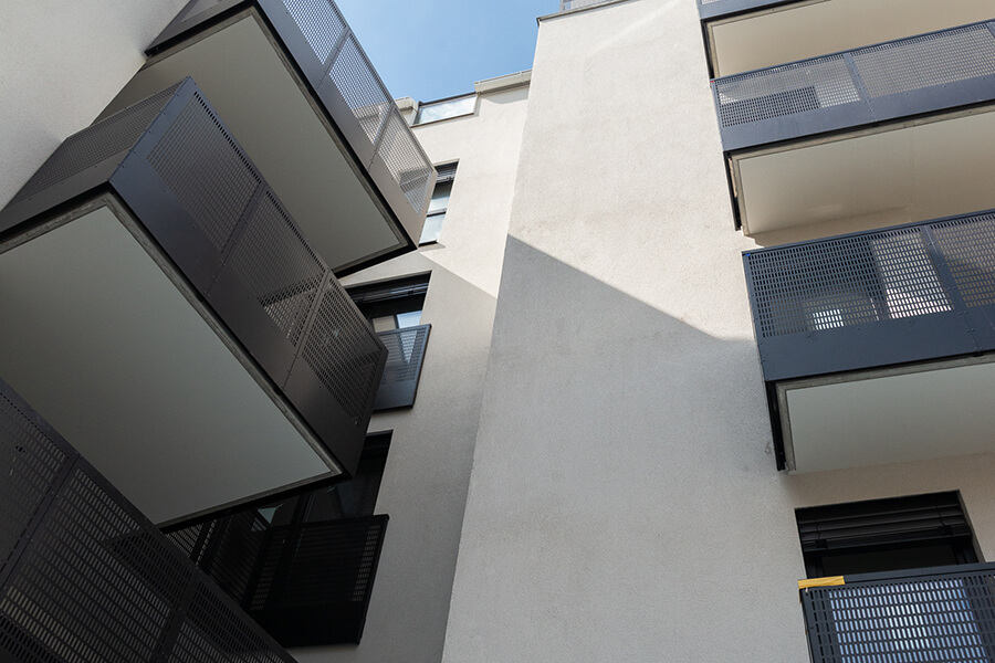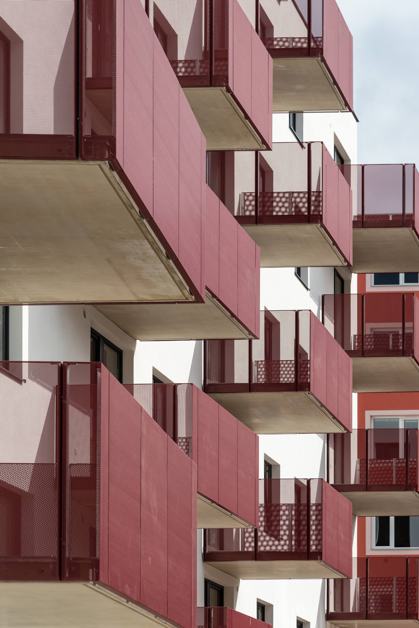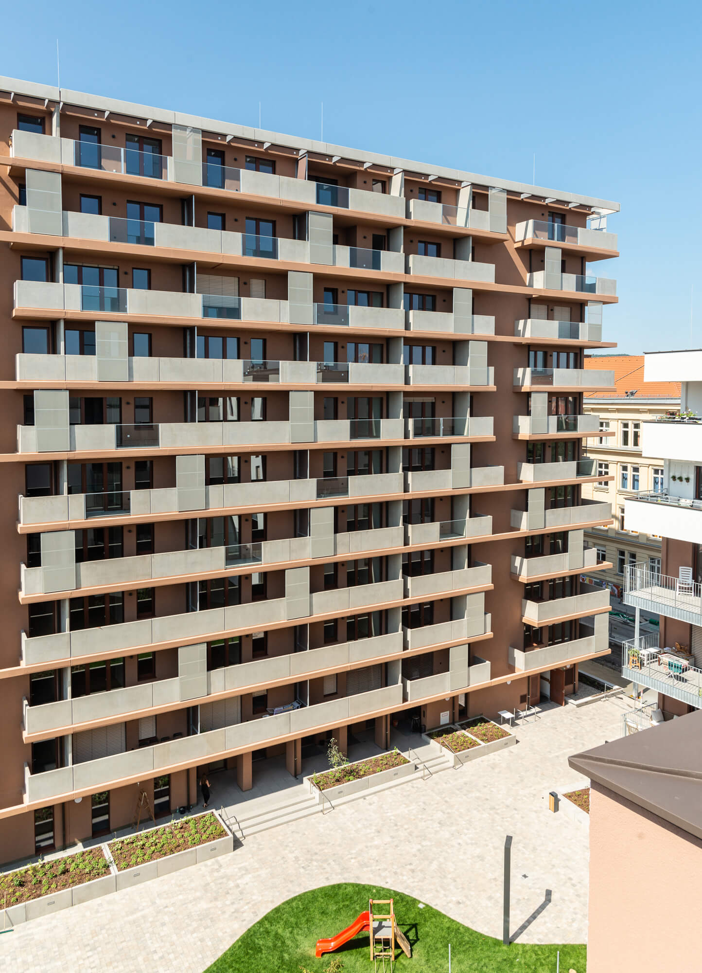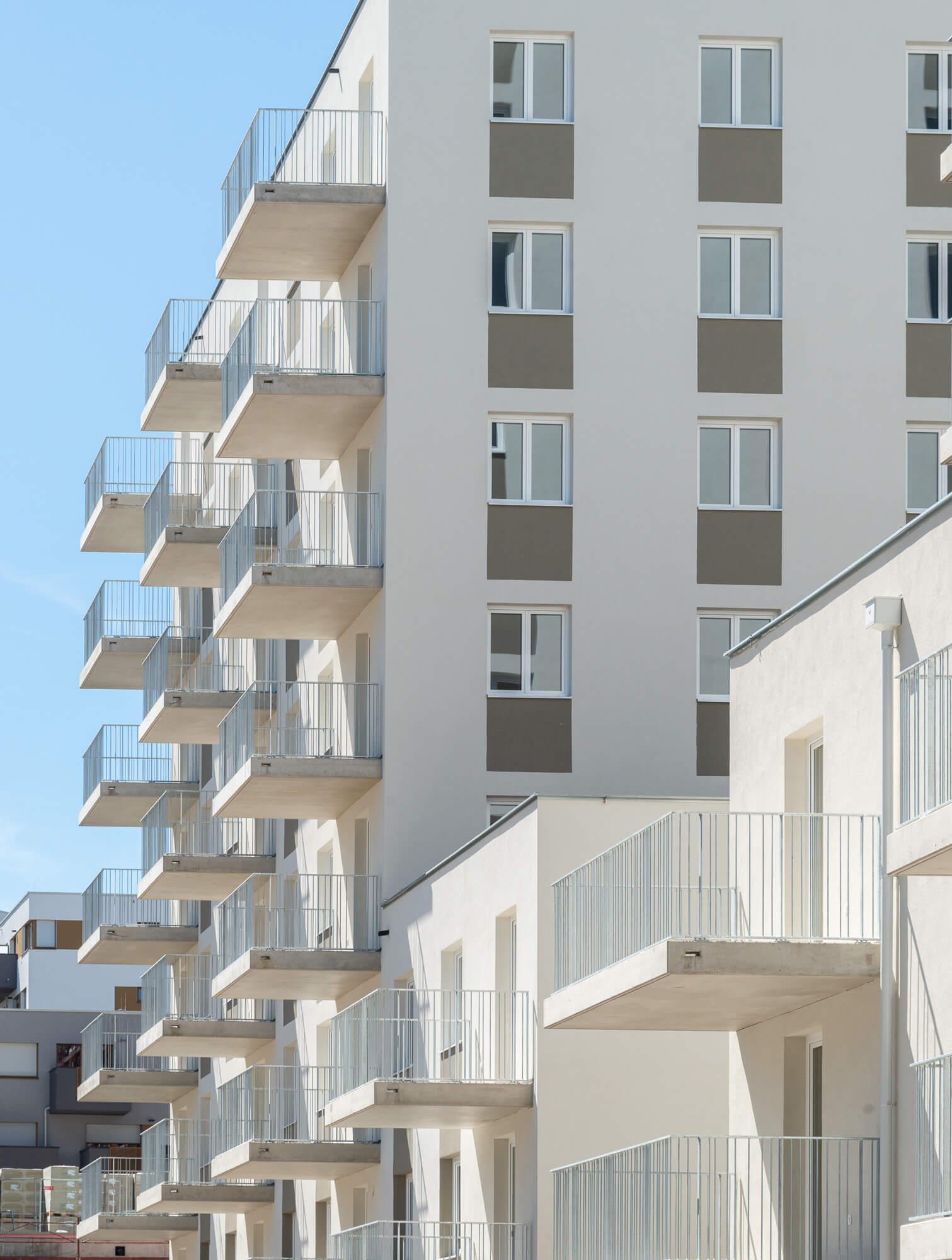 Weiters verfügen alle Wohneinheiten über Freiflächen wie Terrassen, Balkone und Loggien. Auf den niedrigen Seitentrakten befinden sich Dachterrassen, die von den Mietern genutzt werden können.