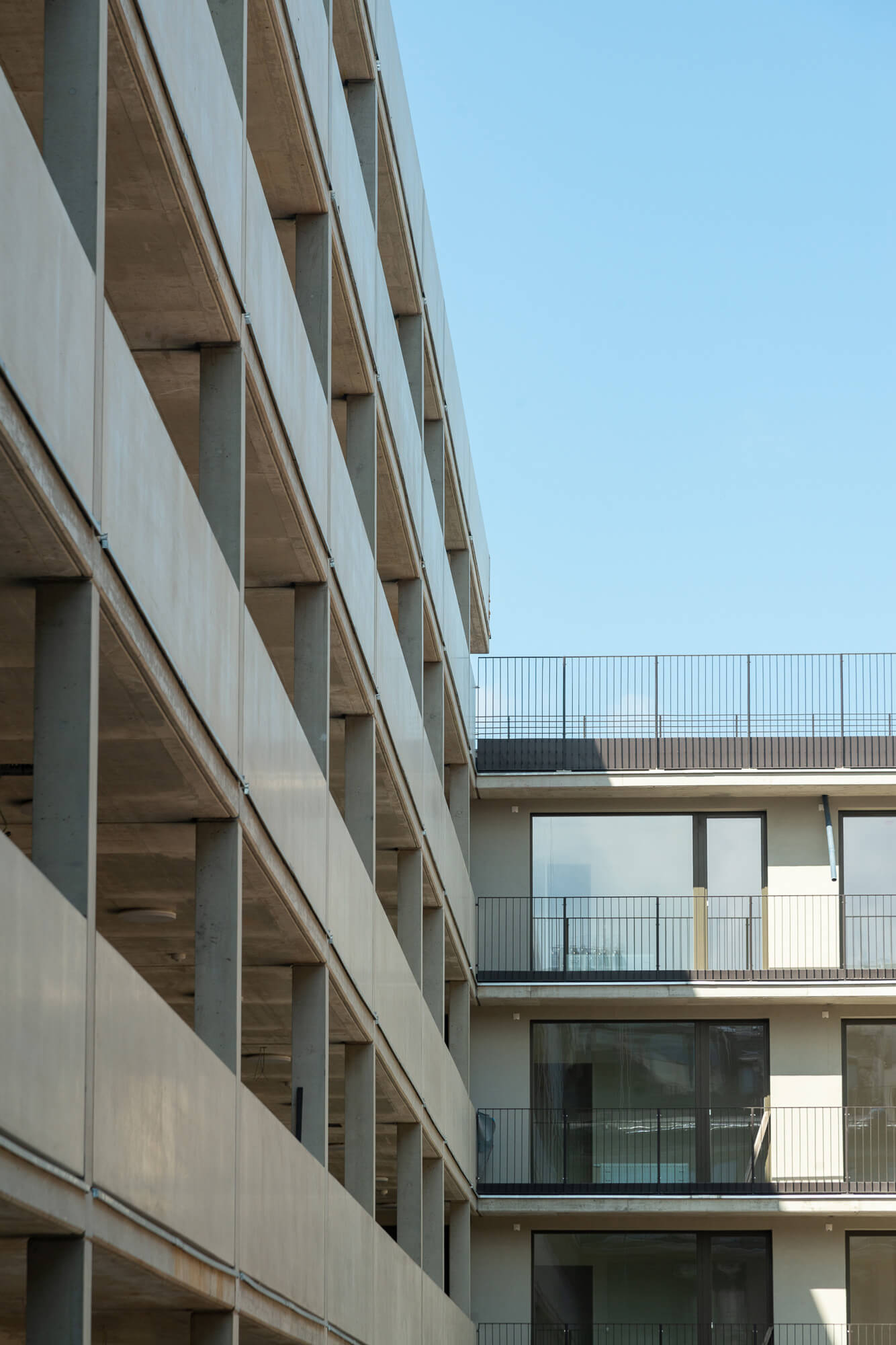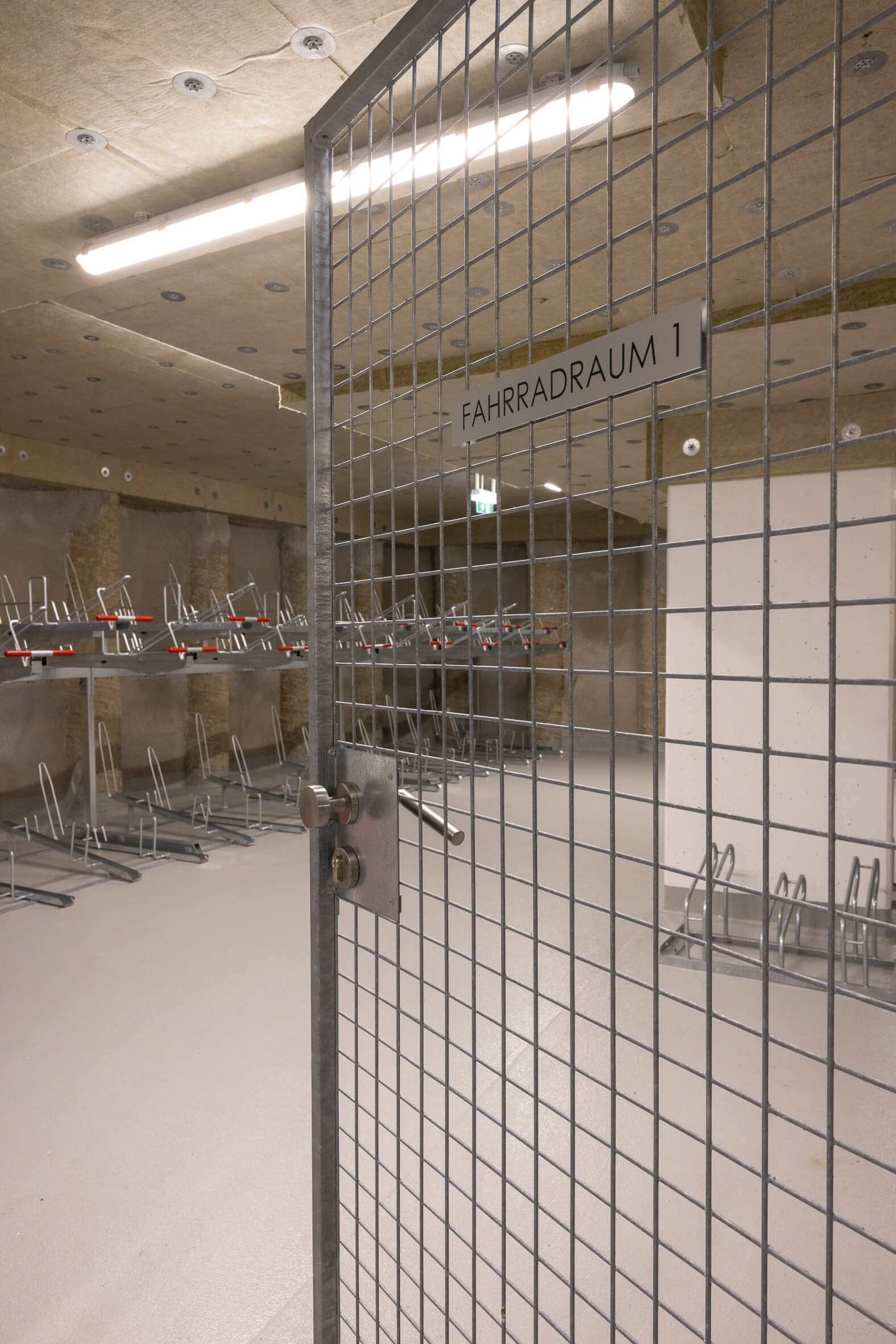Eine eingeschoßige Tiefgarage bietet Platz für 76 PKW-Stellplätze, Fahrradabstell-, Einlagerungs- und Technikräume. Im Erdgeschoß befinden sich zudem weitere Fahrrad- und Kinderwagenabstellräume, ein Müllraum und ein Gemeinschaftsraum.
