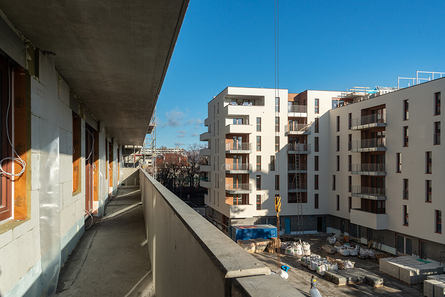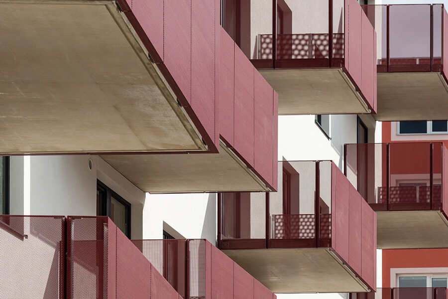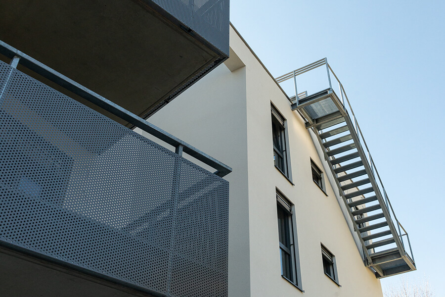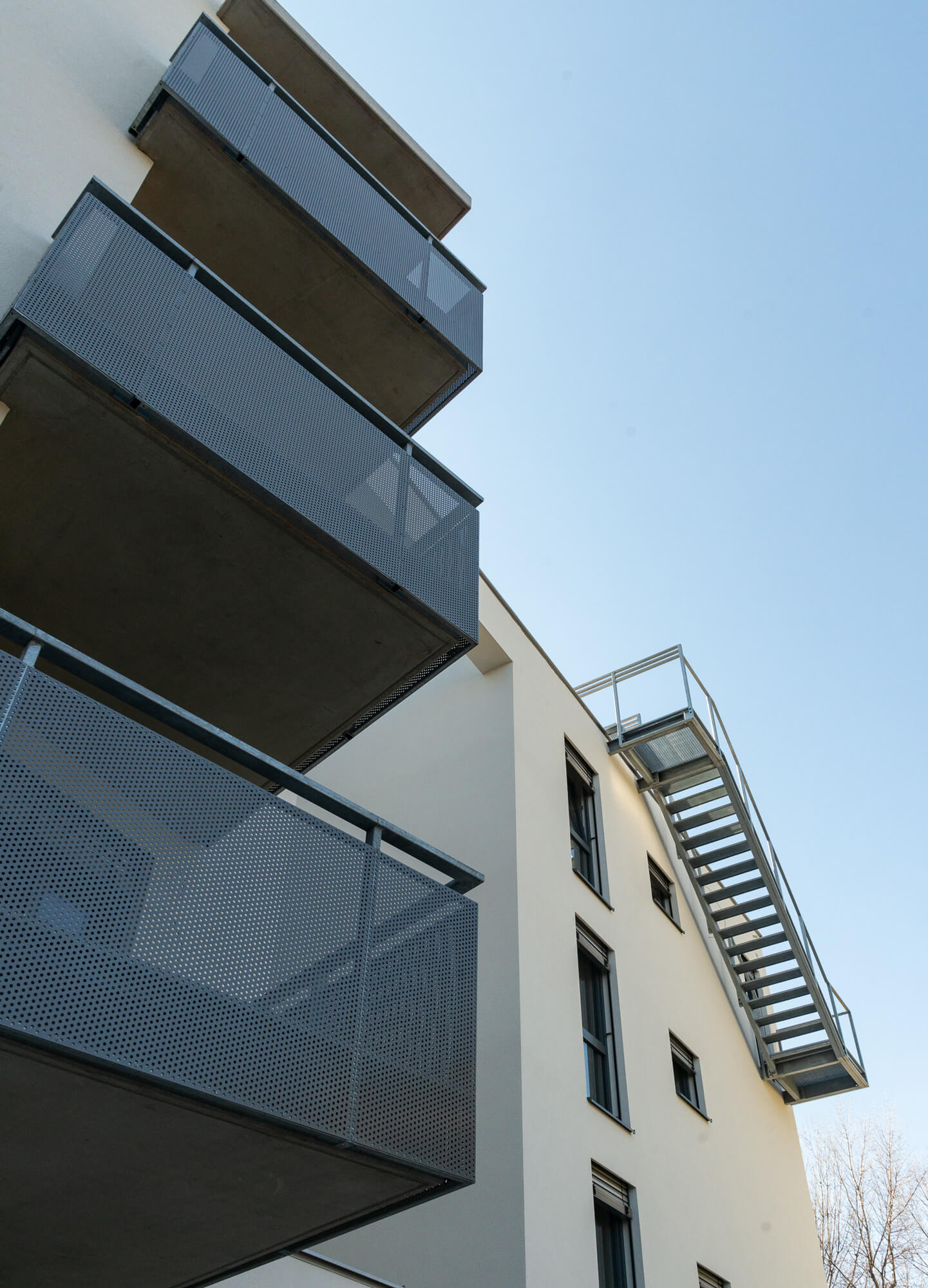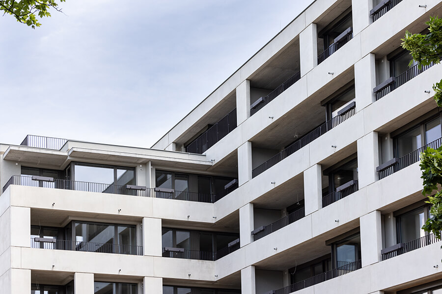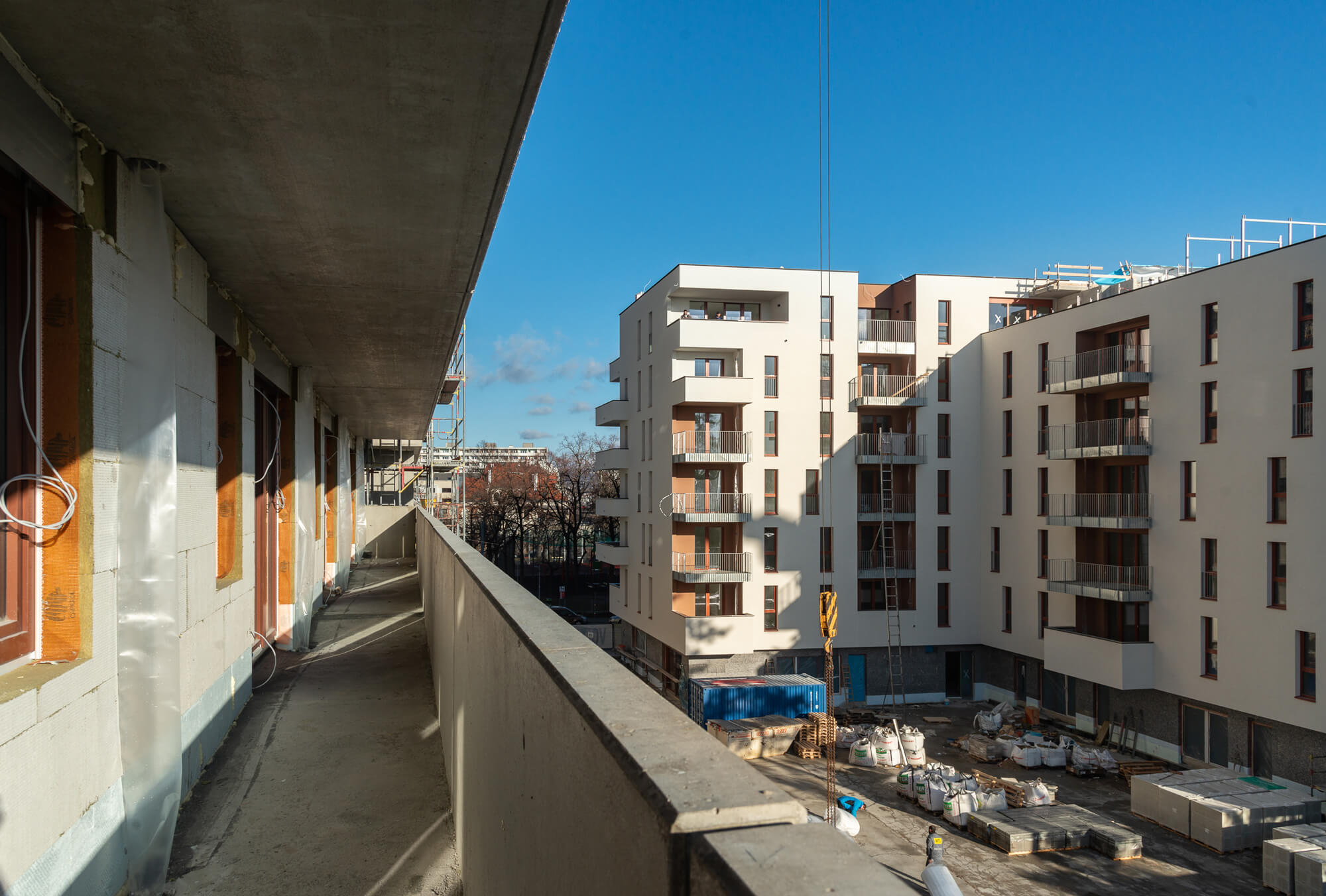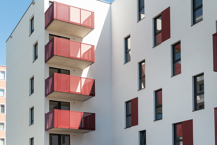 Sämtliche Wohnungen sind in den oberen Geschoßen mit Balkonen, Loggien oder Terrassen ausgestattet, ebenso steht auf beiden Baufeldern den Mietern eine allgemeine Dachterrasse zur Verfügung.