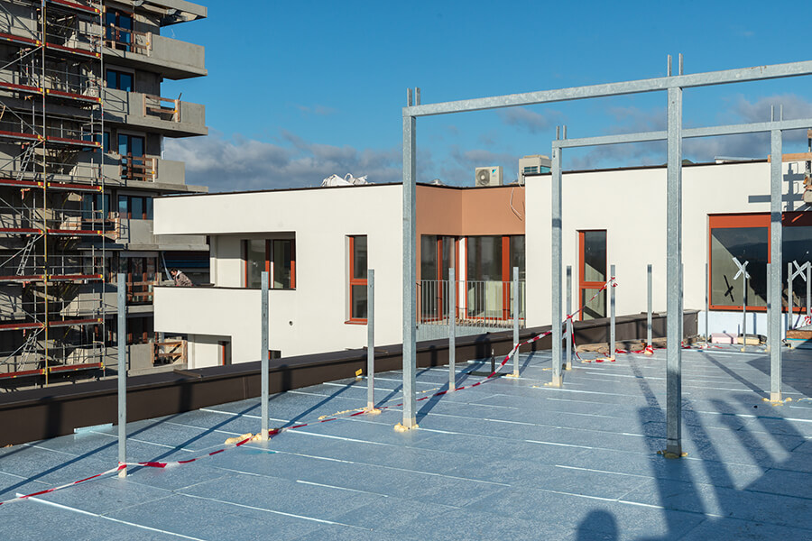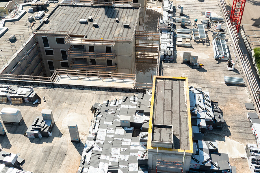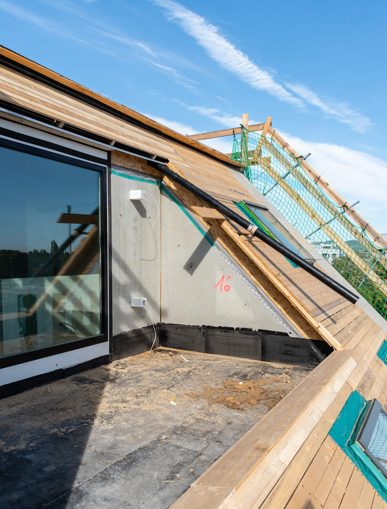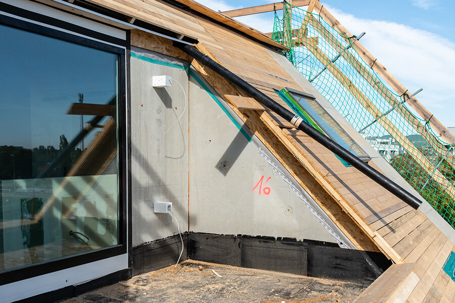 Am Dach des Gebäudes befinden sich sowohl Photovoltaikmodule als auch Luftwärmepumpen, mit denen das Warmwasser erzeugt und die Fußbodenheizung in den Wohnungen betrieben wird.