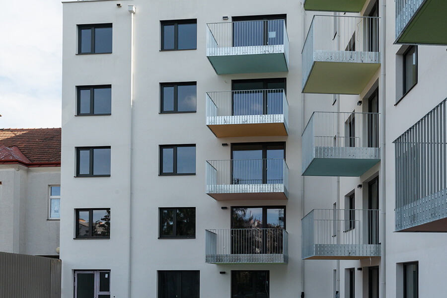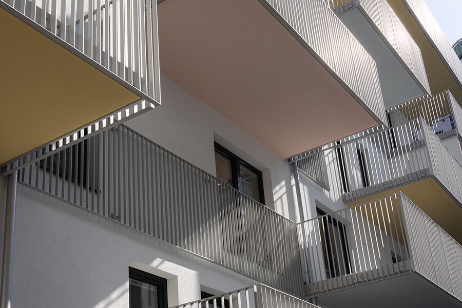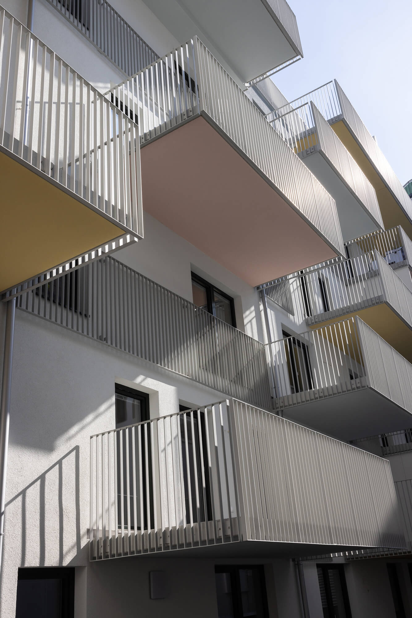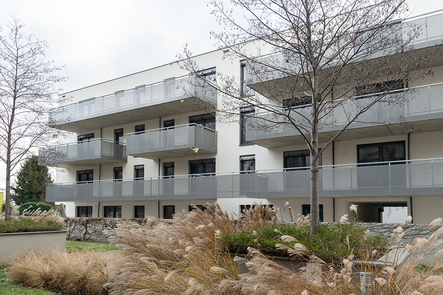 Die Wohnungen im Erdgeschoß verfügen über einen Garten, jene in den oberen Geschoßen sind mit Balkonen, Loggien oder Terrassen ausgestattet.