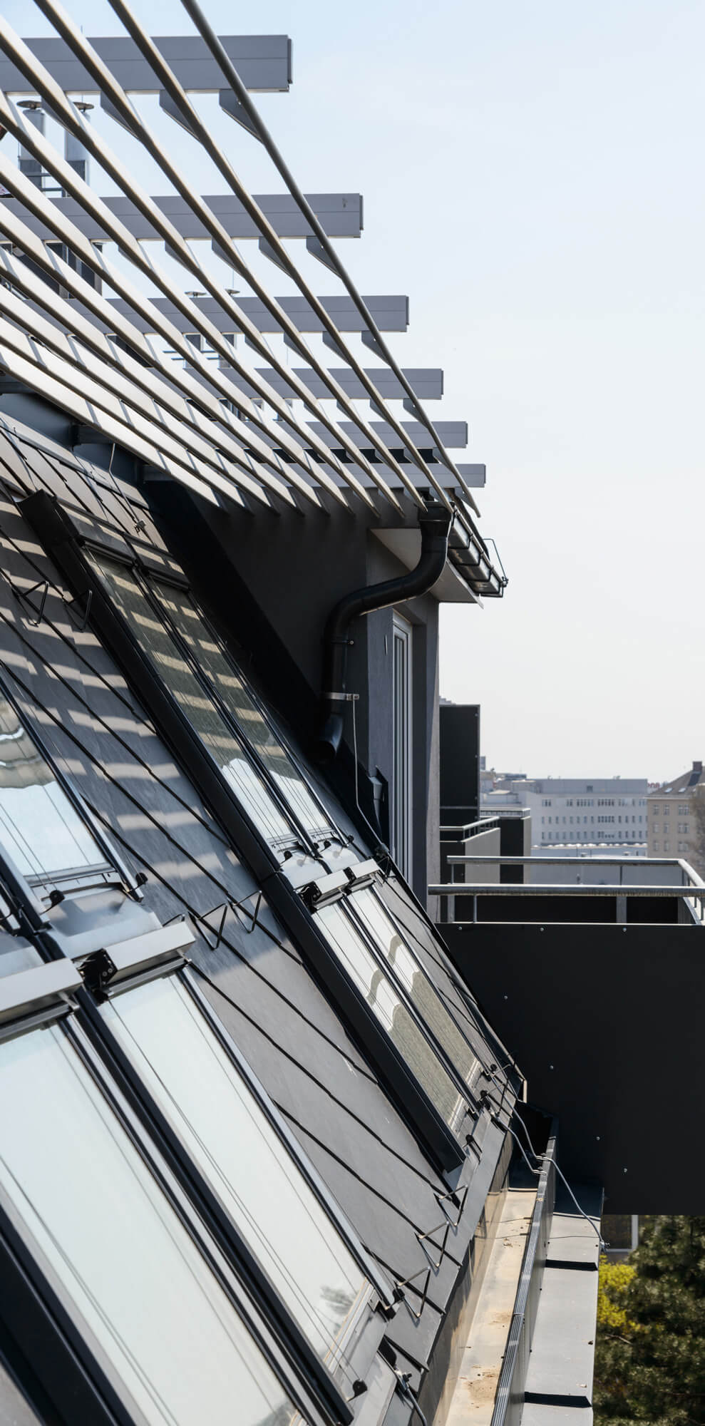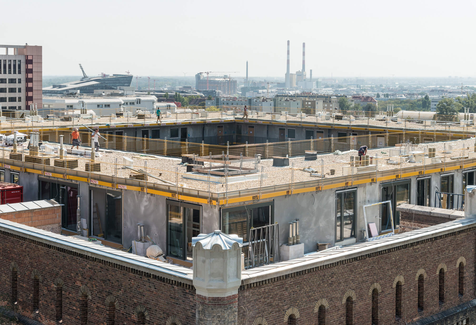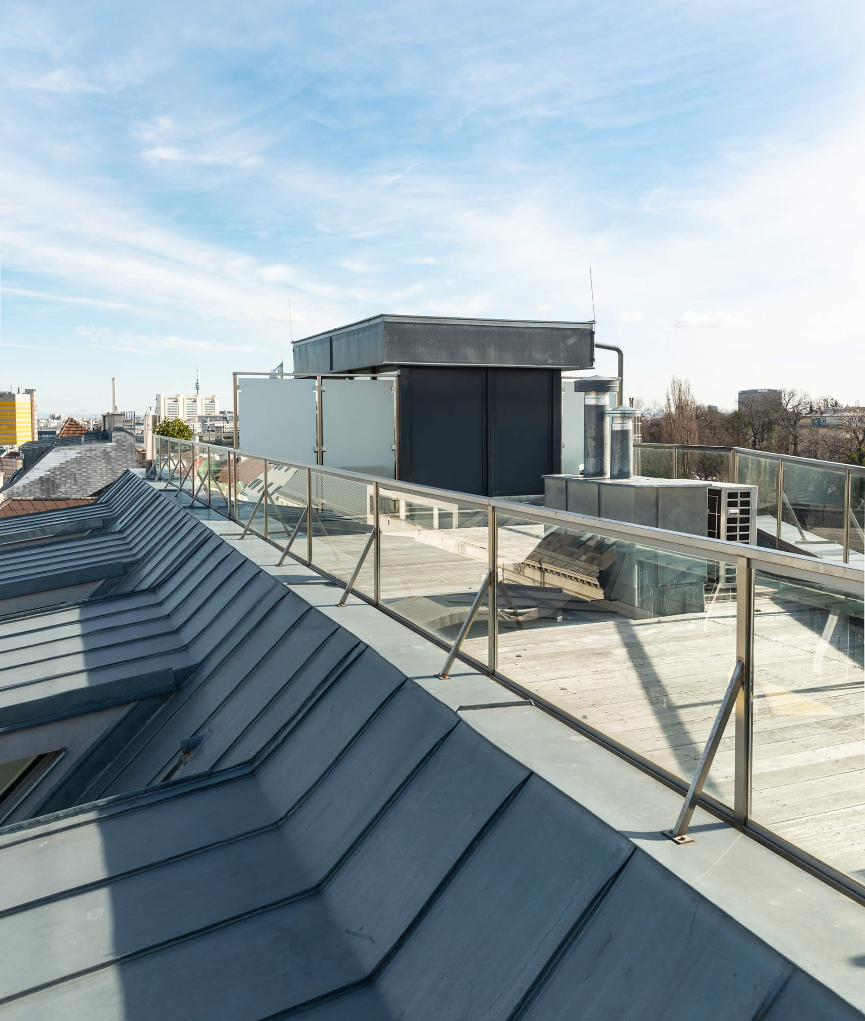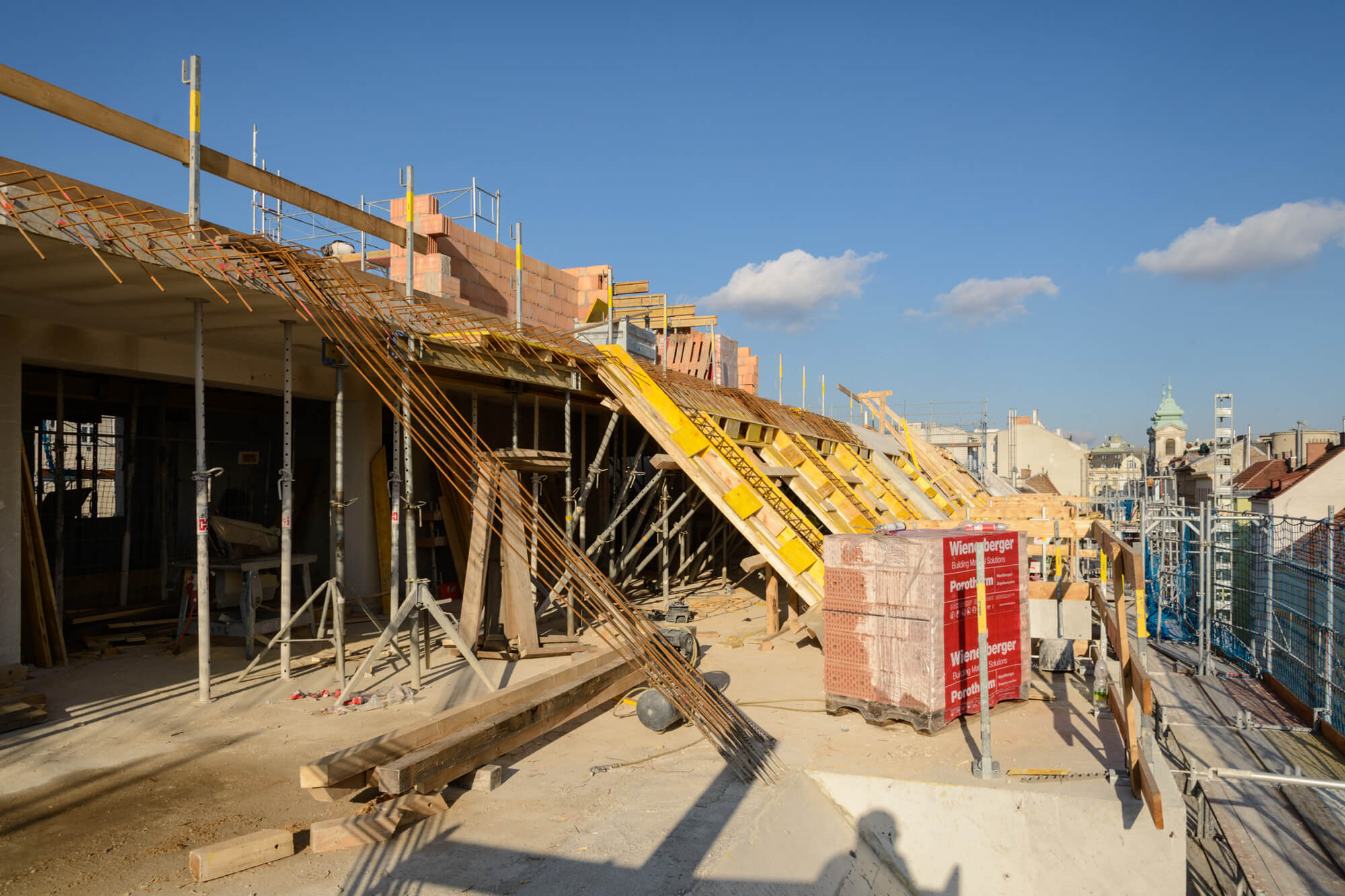 Nach dem Abtragen der über dem 3. Stock befindlichen Dachräume wird über die gesamte Fläche des Objektes 16 im Arsenal durch Voitl & Co. ein zweigeschoßiger Dachgeschossaufbau für insgesamt 32 neue Wohnungen mit straßenseitigen Terrassen und hofseitigen Loggien hergestellt.