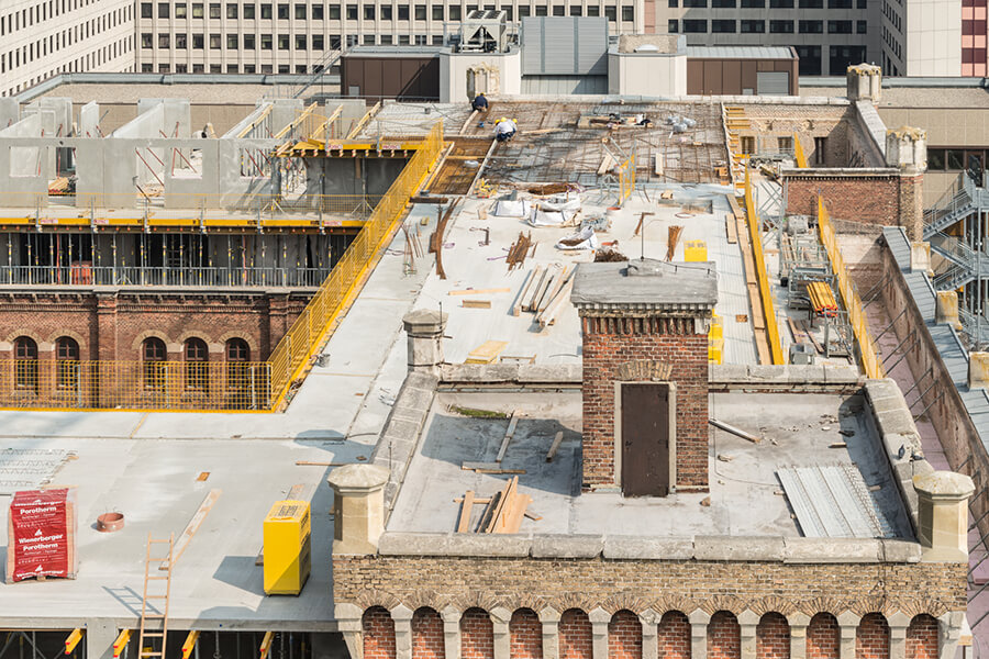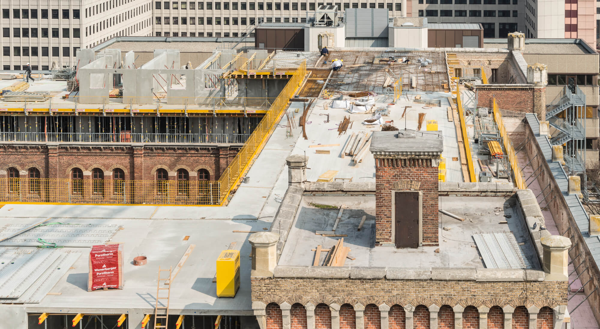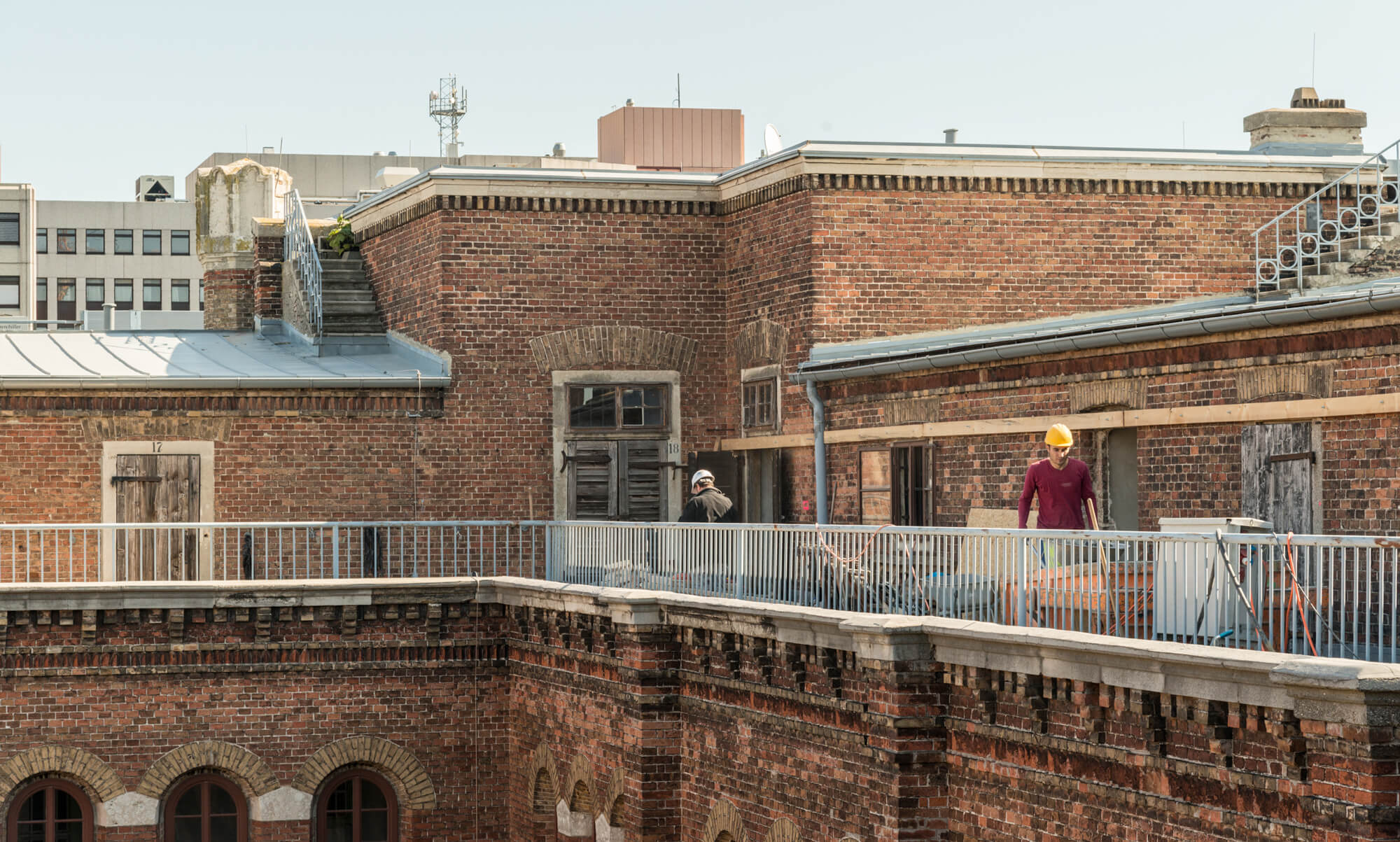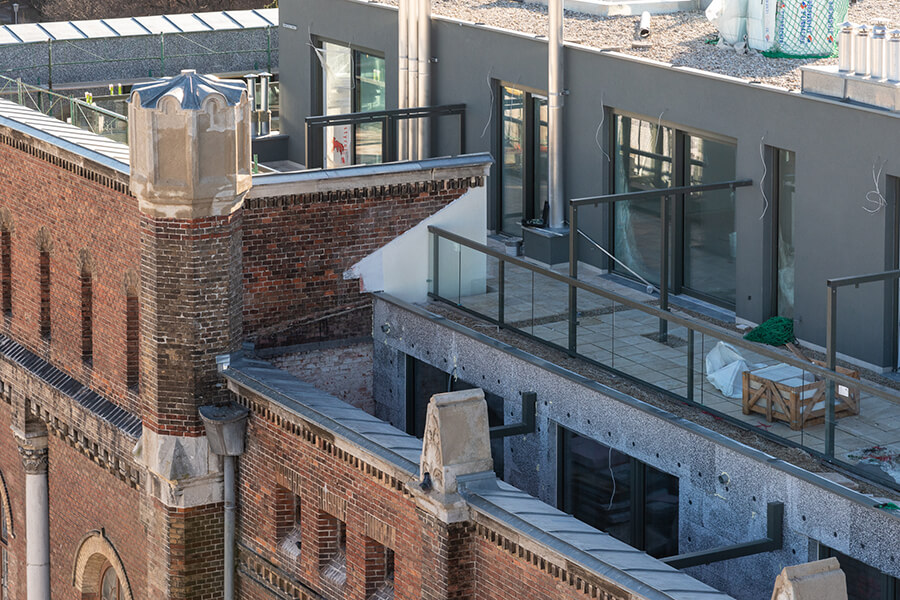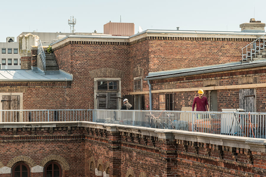 Nach dem Abtragen der über dem 3. Stock befindlichen Dachräume wird über die gesamte Fläche des Objektes 16 im Arsenal durch Voitl & Co. ein zweigeschoßiger Dachgeschossaufbau für insgesamt 32 neue Wohnungen mit straßenseitigen Terrassen und hofseitigen Loggien hergestellt.
