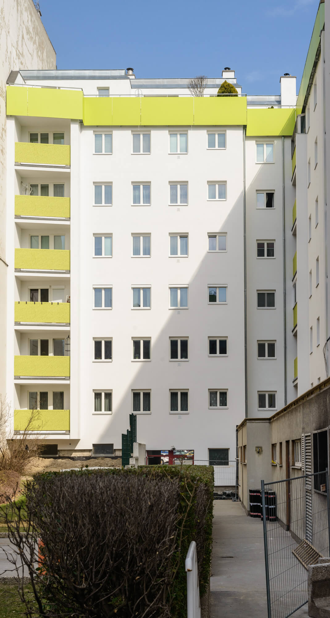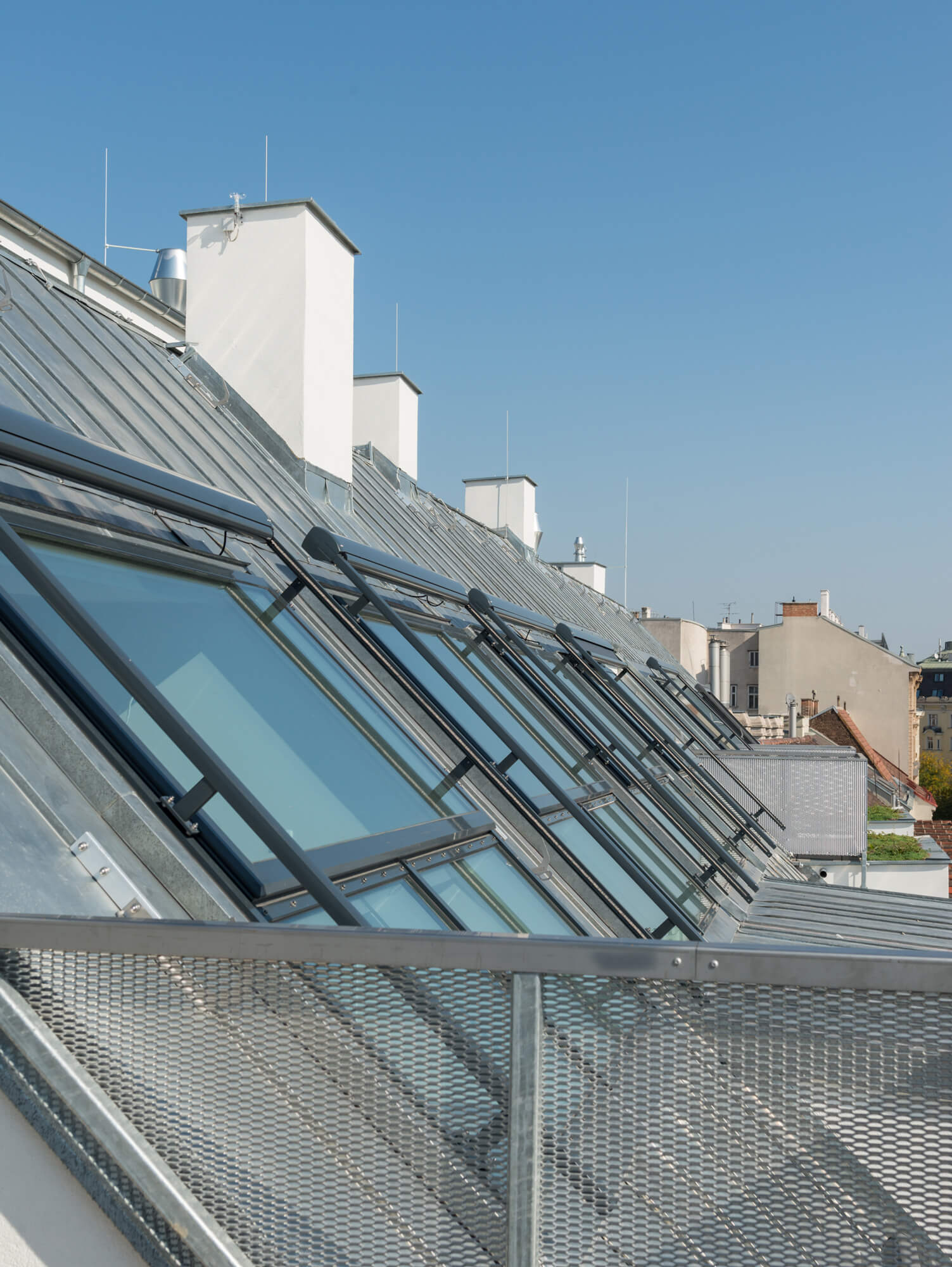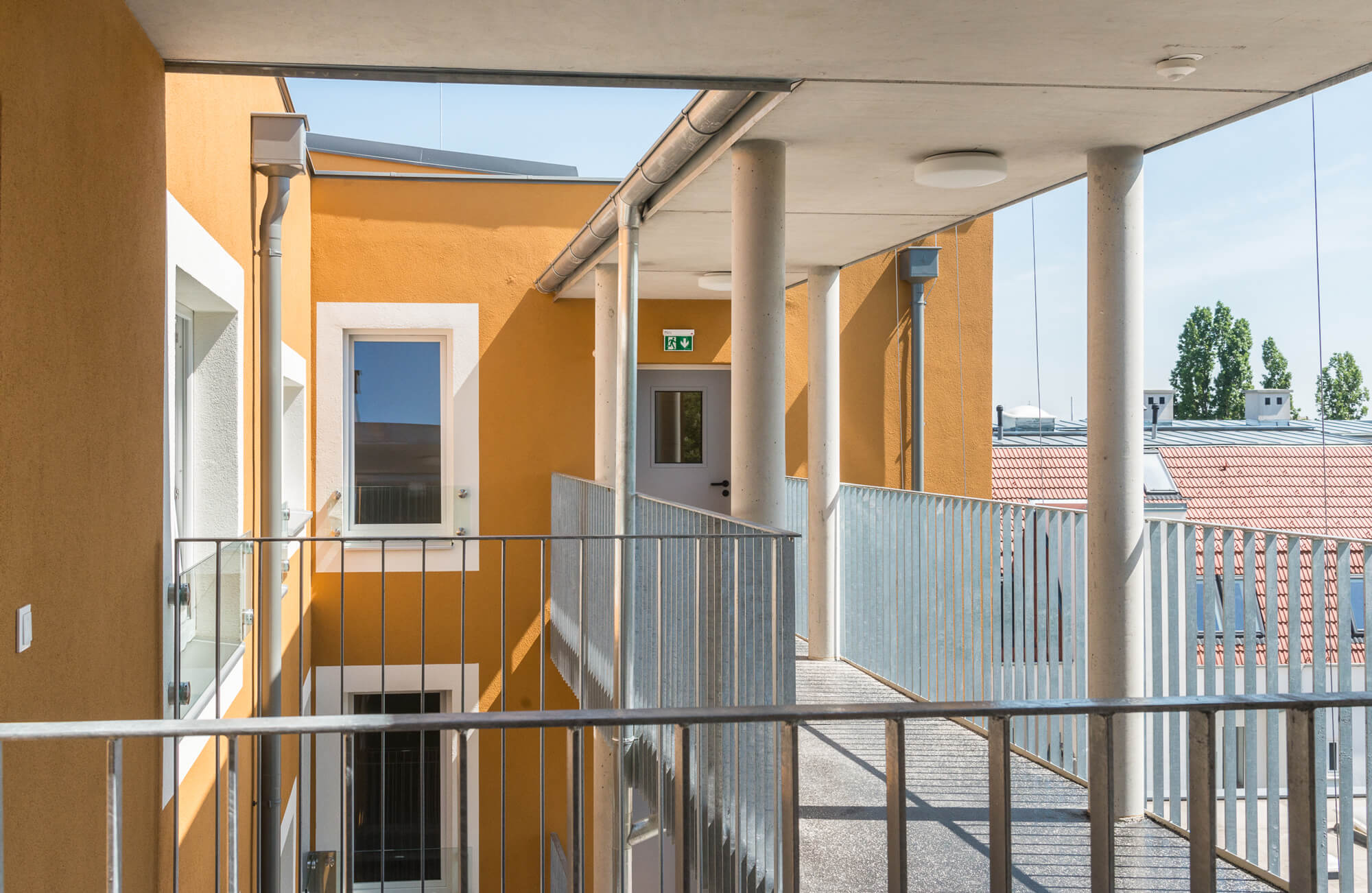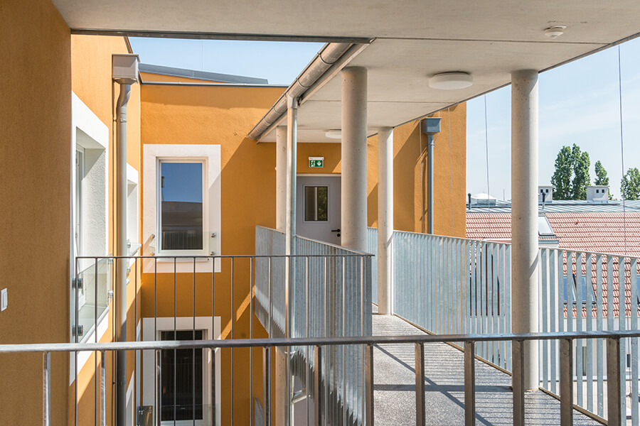 Die Erschließung der neuen Wohnungen erfolgt über einen hofseitigen Laubengang im 2 Dachgeschoß. Die bestehenden Stiegenhäuser werden mittels Druckbelüftungsanlagen, Schleusen und Brandschutzverglasungen auf den letzten Stand der Technik gebracht.