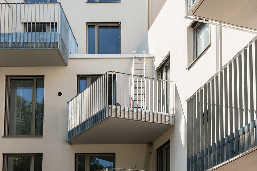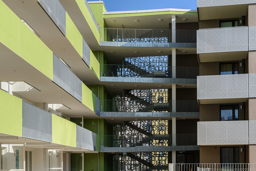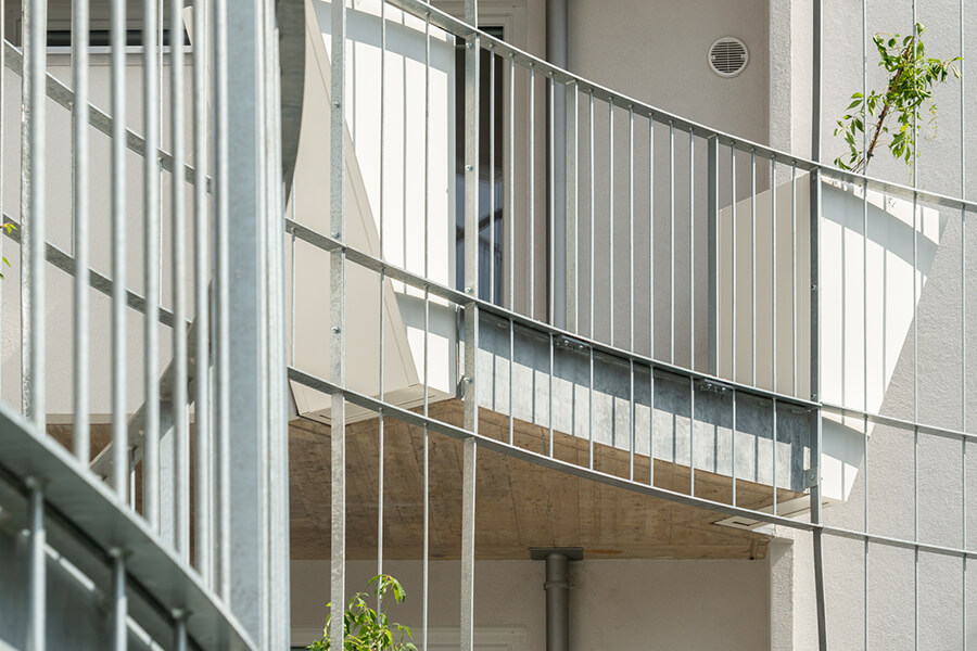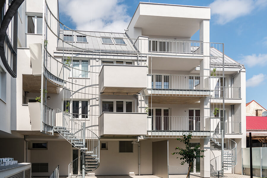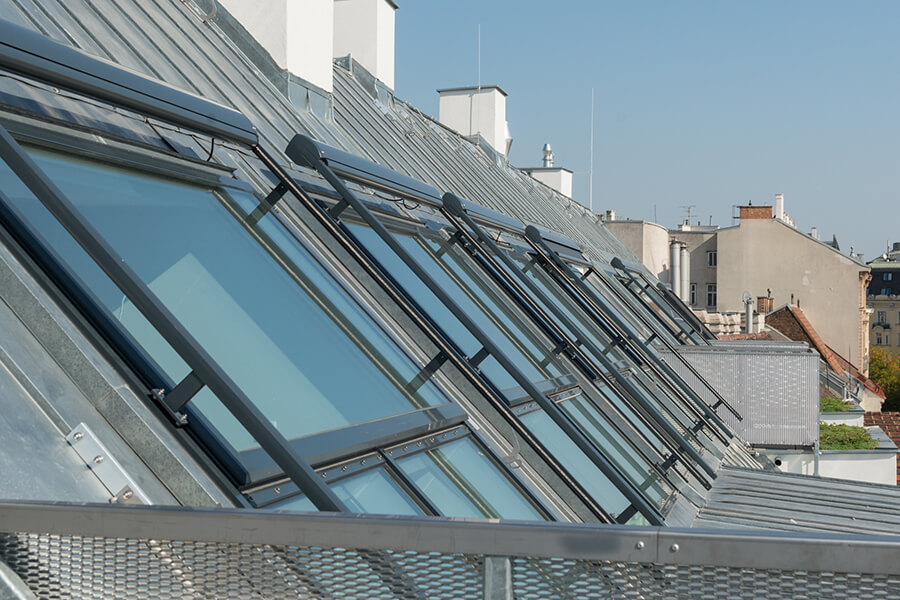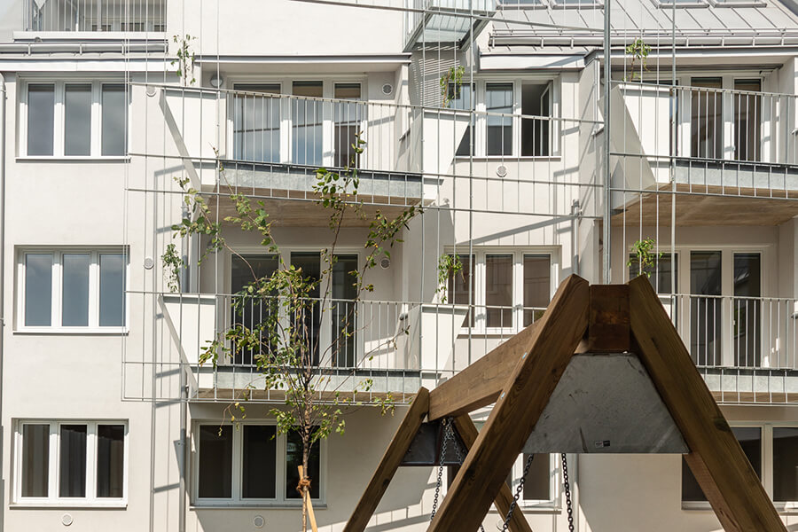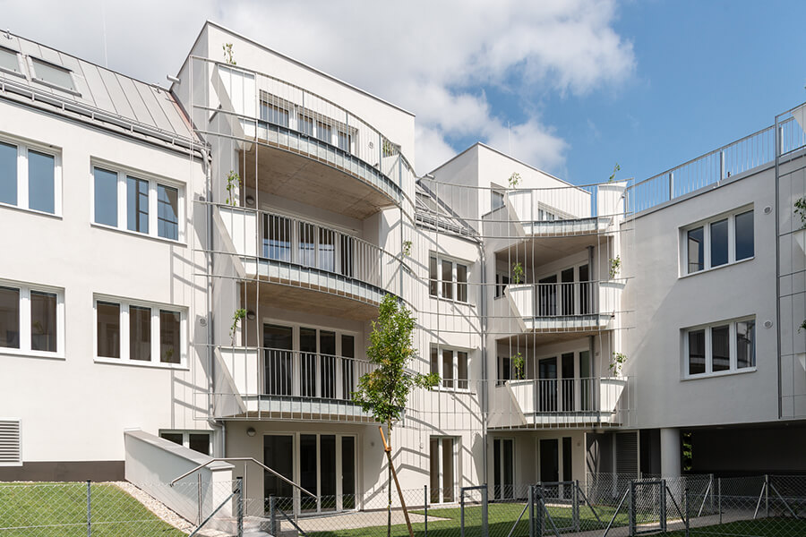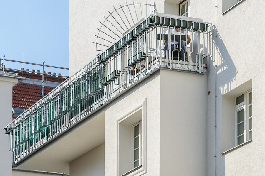 Die Erschließung der neuen Wohnungen erfolgt über einen hofseitigen Laubengang im 2 Dachgeschoß. Die bestehenden Stiegenhäuser werden mittels Druckbelüftungsanlagen, Schleusen und Brandschutzverglasungen auf den letzten Stand der Technik gebracht.