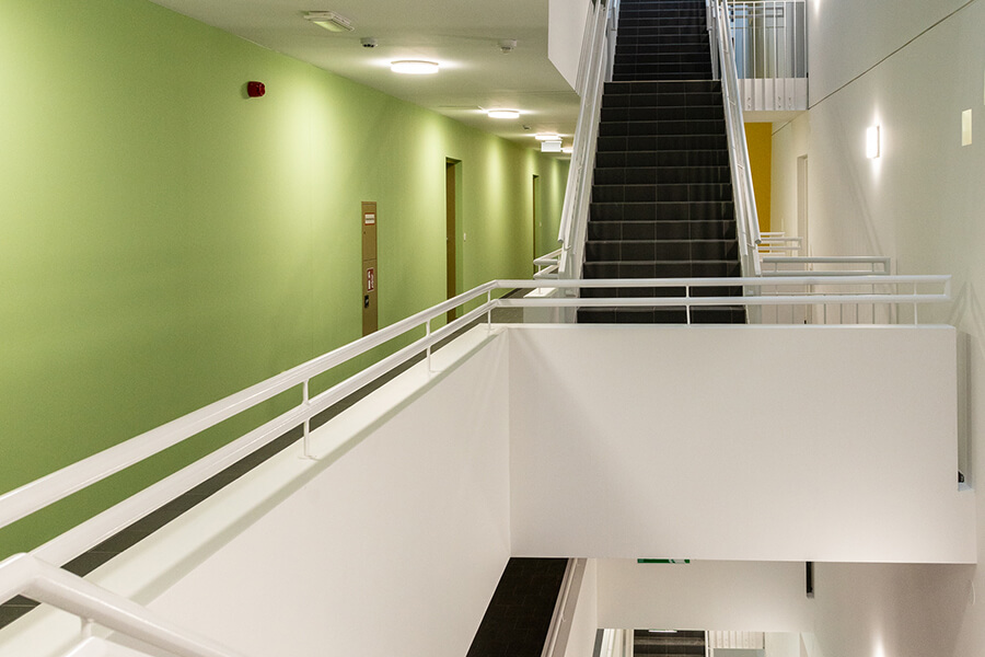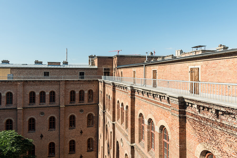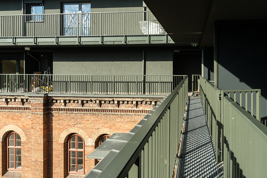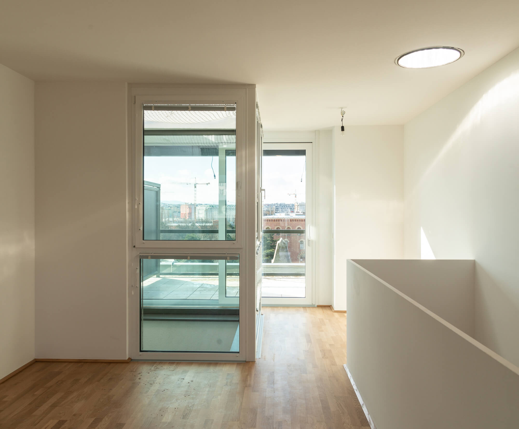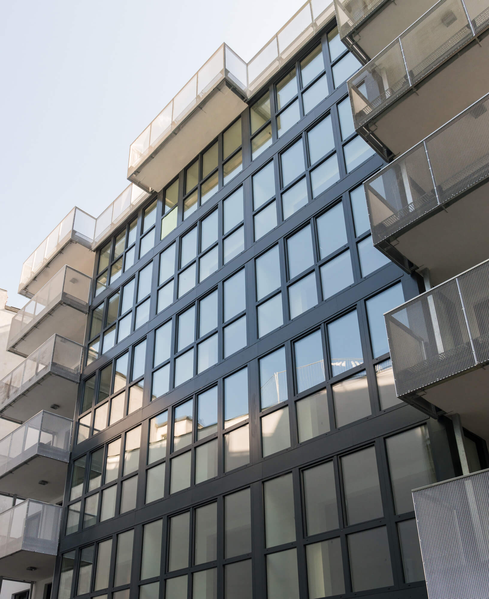 Die Erschließung der neuen Wohnungen erfolgt über einen hofseitigen Laubengang im 2 Dachgeschoß. Die bestehenden Stiegenhäuser werden mittels Druckbelüftungsanlagen, Schleusen und Brandschutzverglasungen auf den letzten Stand der Technik gebracht.