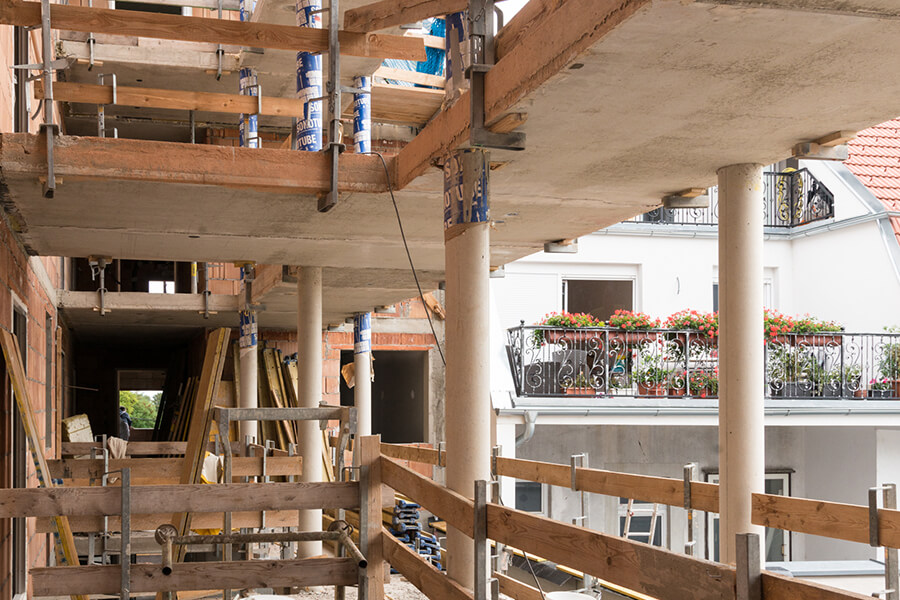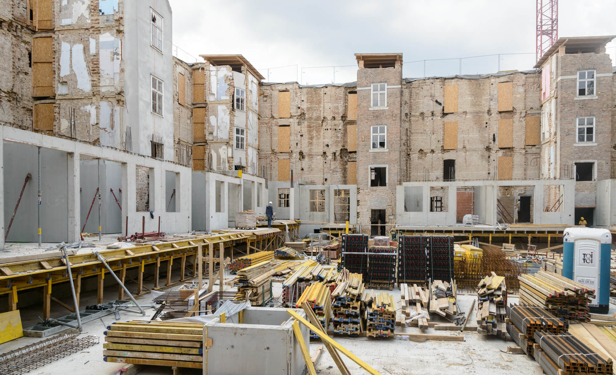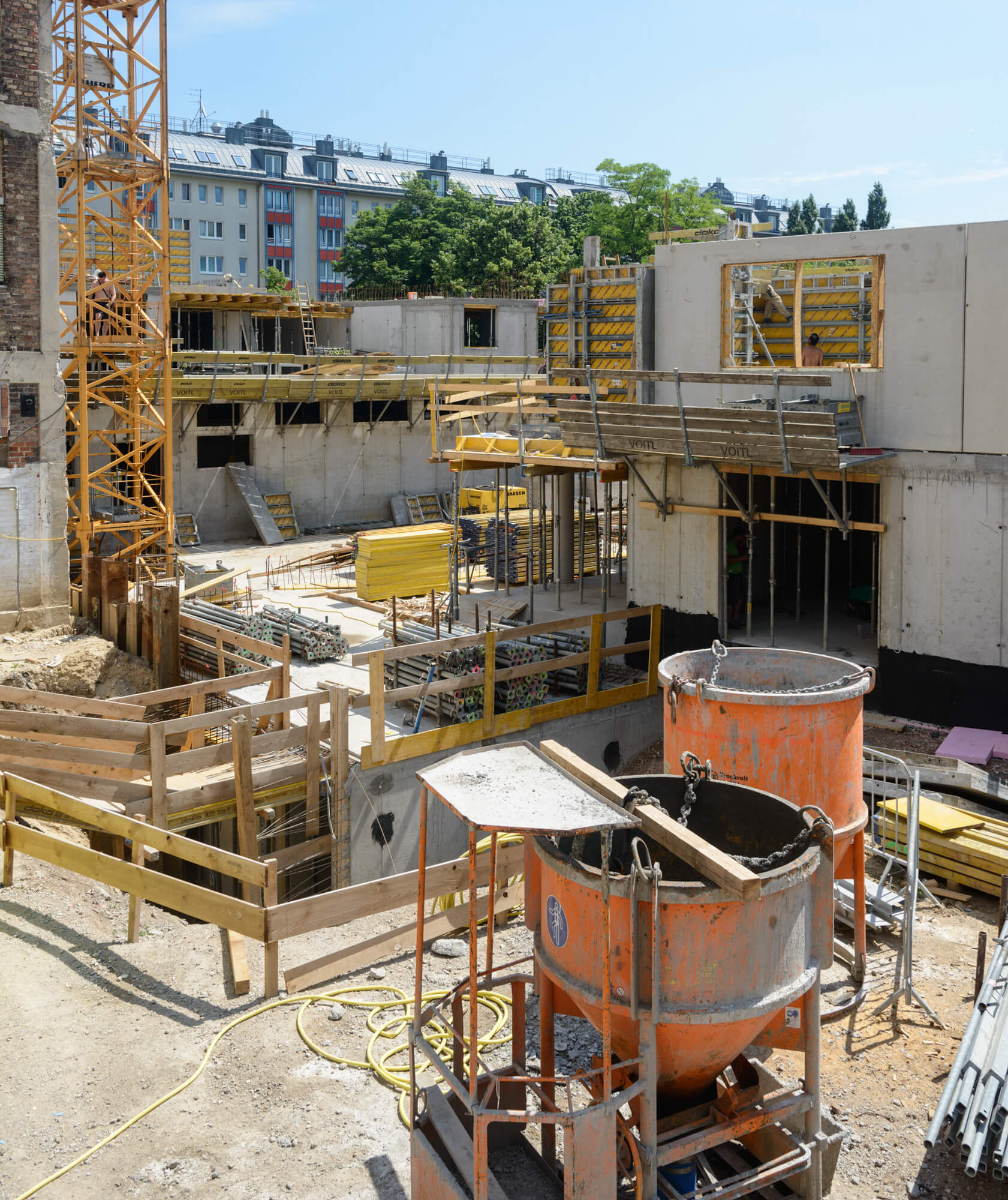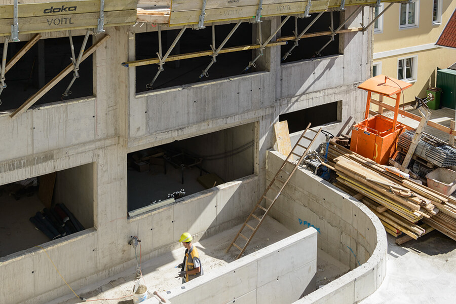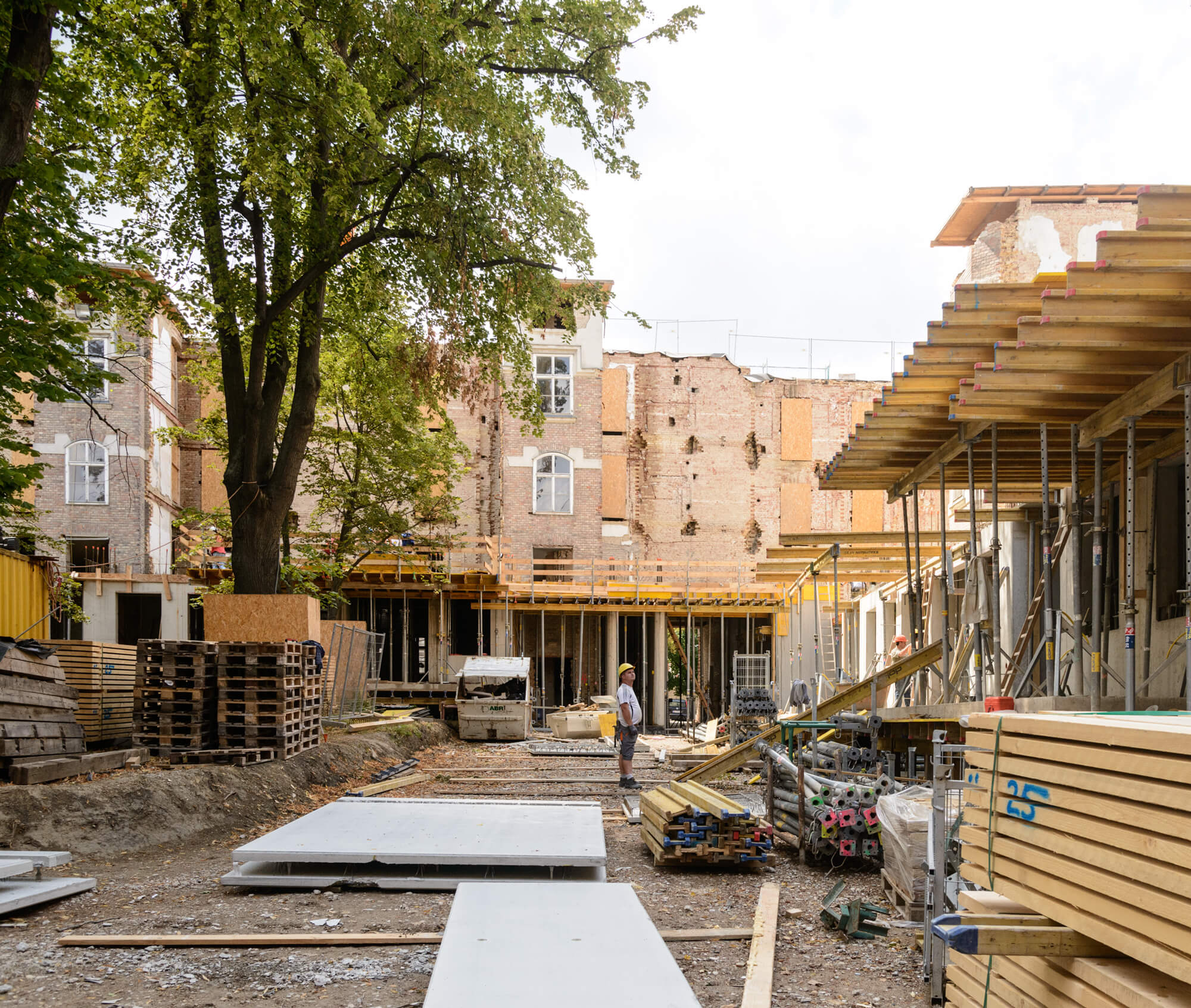 Der Neubau des Hoftraktes erfolgt als Stahlbetonkonstruktion, die kraftschlüssig mit dem Altbestand verbunden wird und so zu einer Einheit verschmilzt.