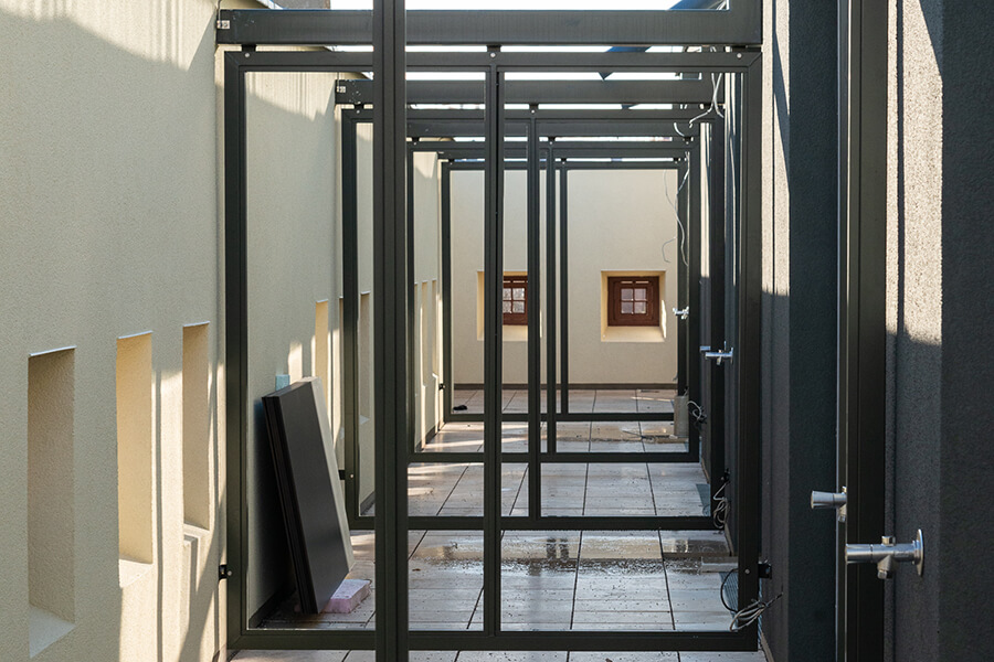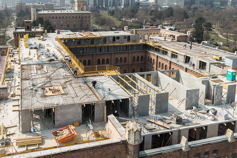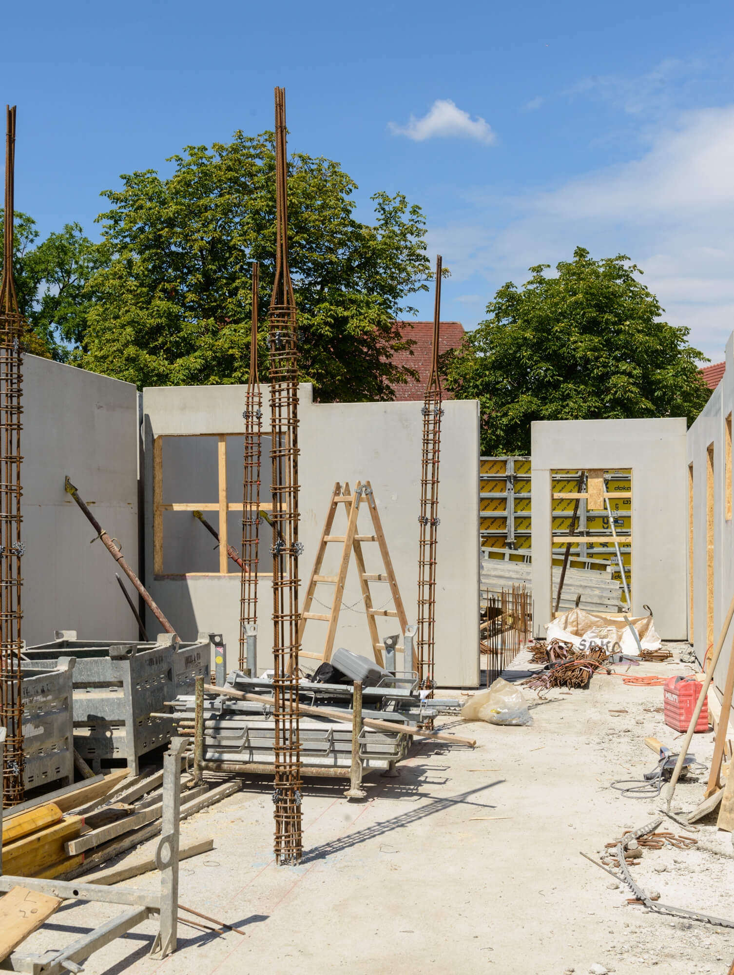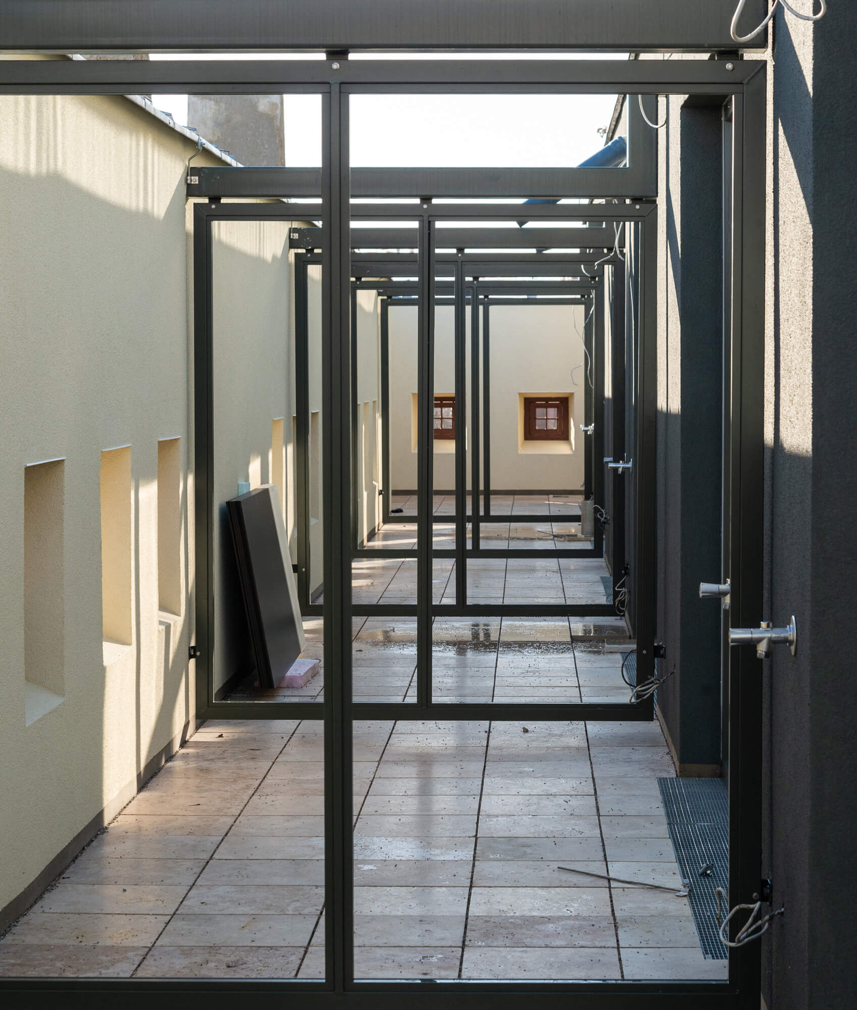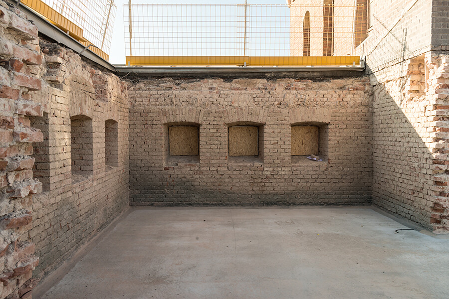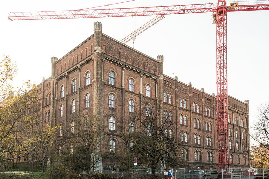 Der Neubau des Hoftraktes erfolgt als Stahlbetonkonstruktion, die kraftschlüssig mit dem Altbestand verbunden wird und so zu einer Einheit verschmilzt.