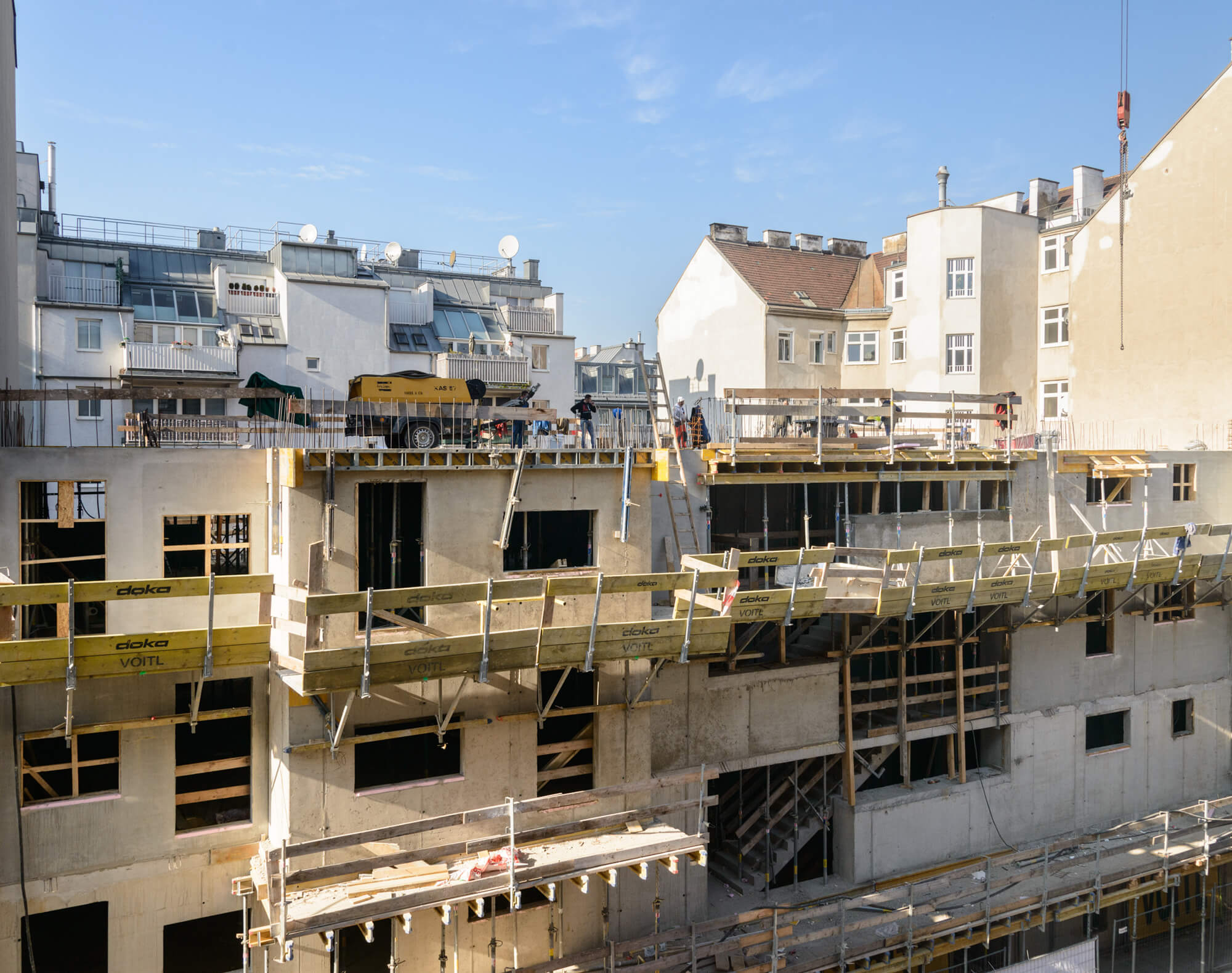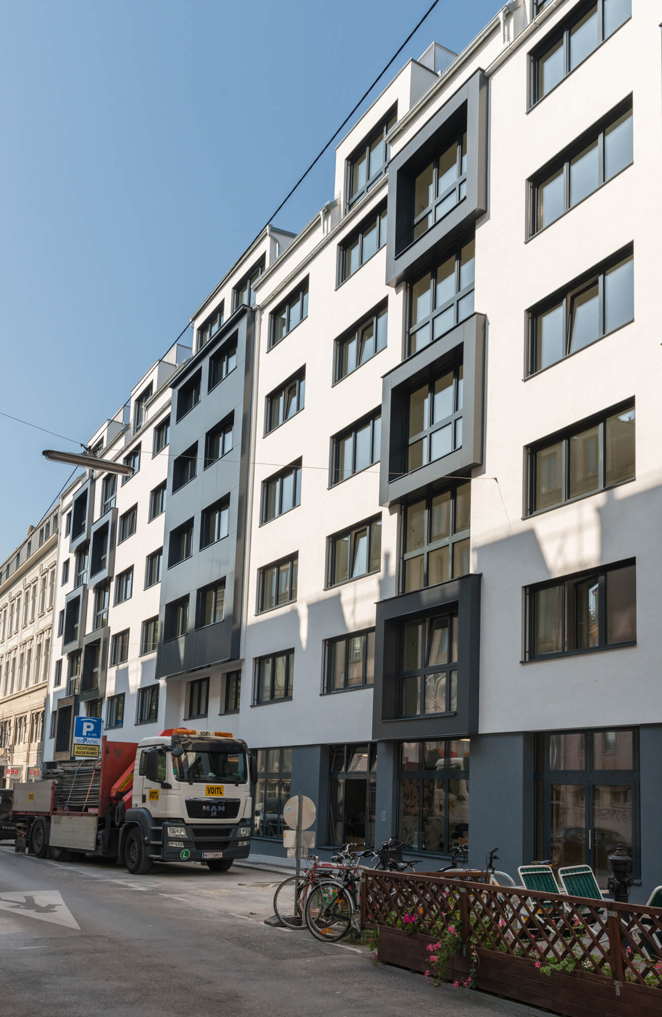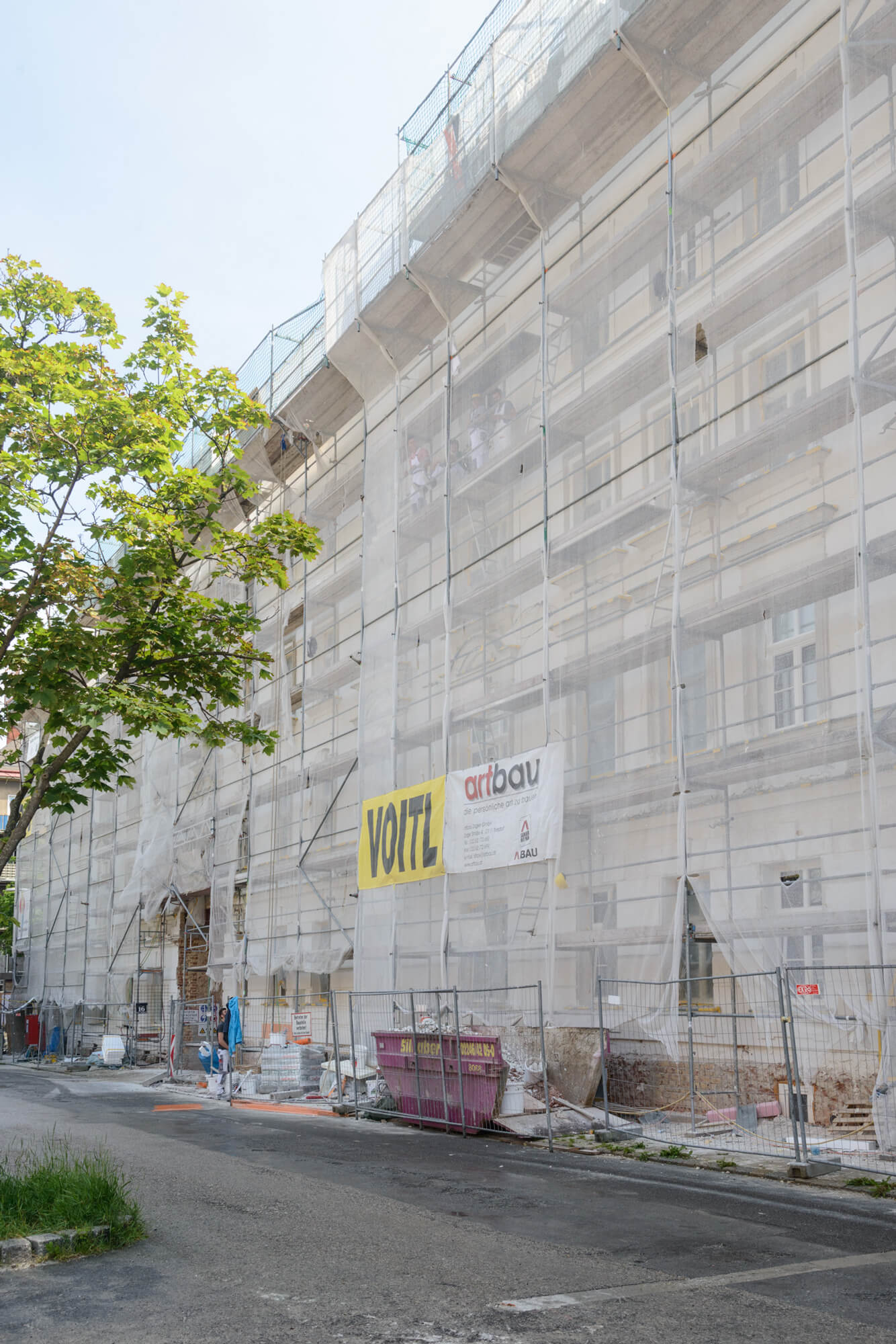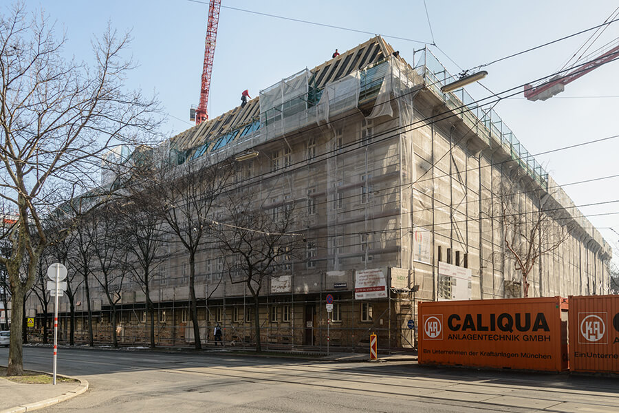 Die Arbeiten umfassen die Sanierung der denkmalgeschützten Straßenfassade, den Abbruch des gesamten Daches, den Abbruch des gesamten Hoftraktes bis zur Mittelmauer und das Vorziehen der Stiegenhäuser bzw. Geschoße auf die innere Baufluchtlinie. Zur Erhaltung der Bestandsbausubstanz wird das Mauerwerk trockengelegt.