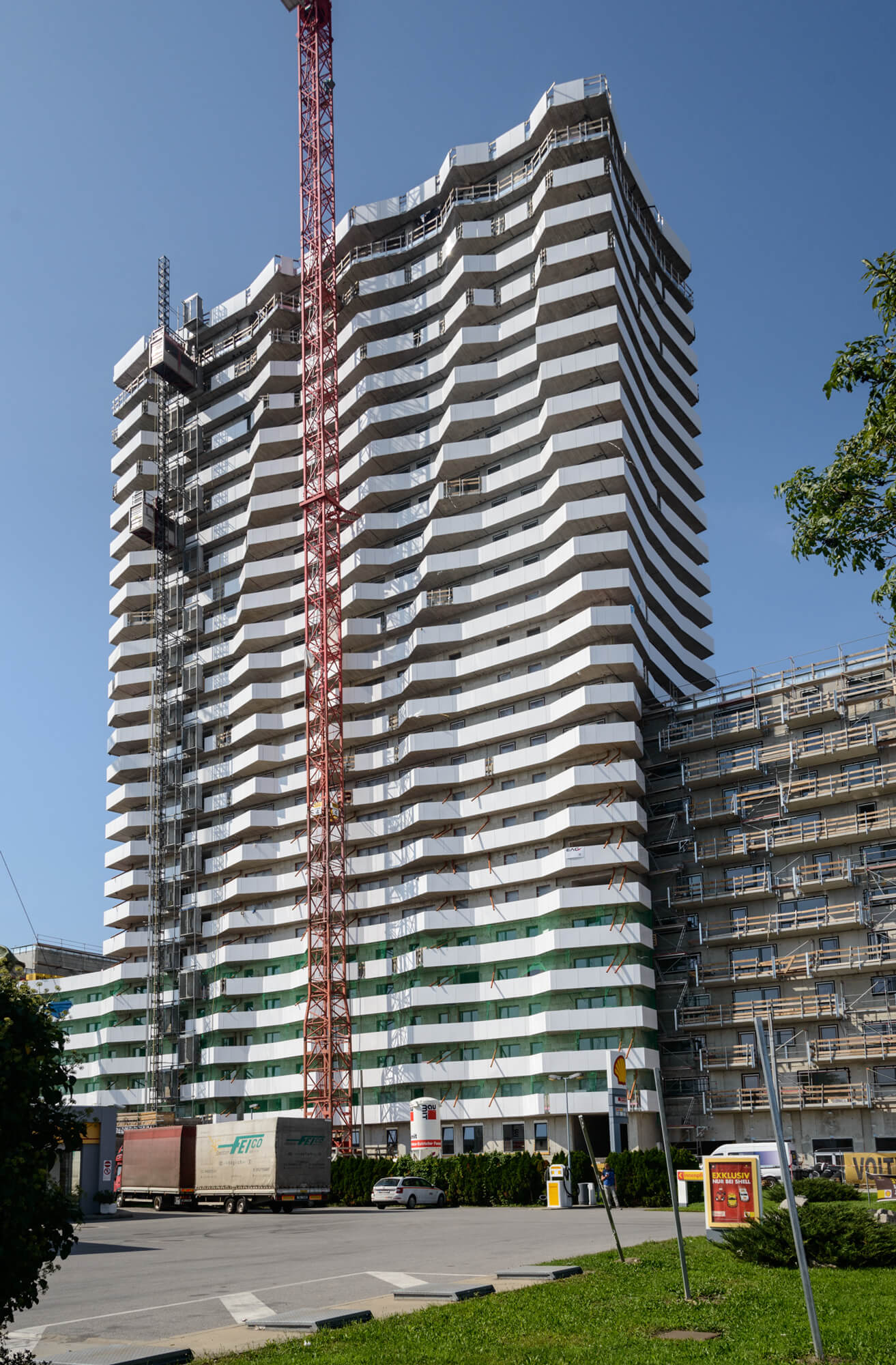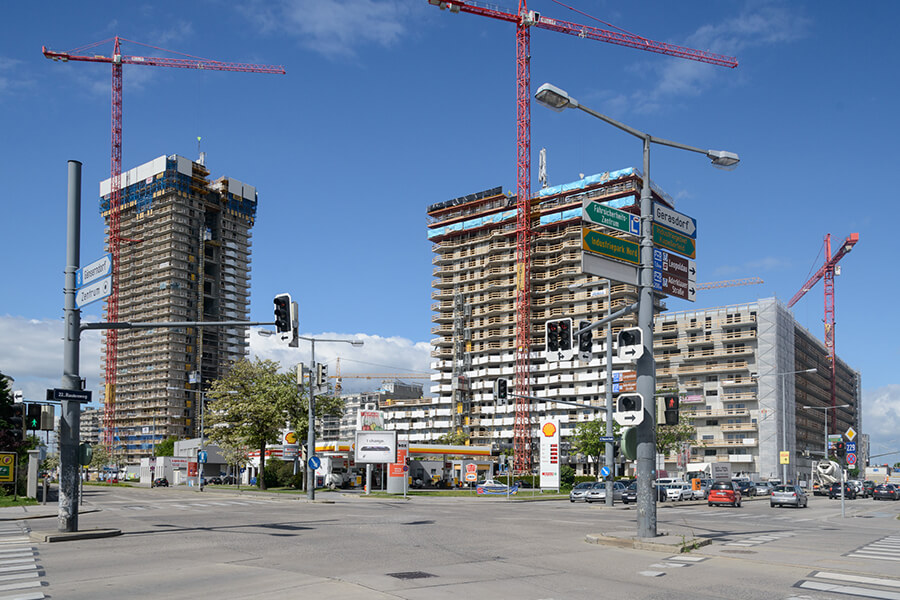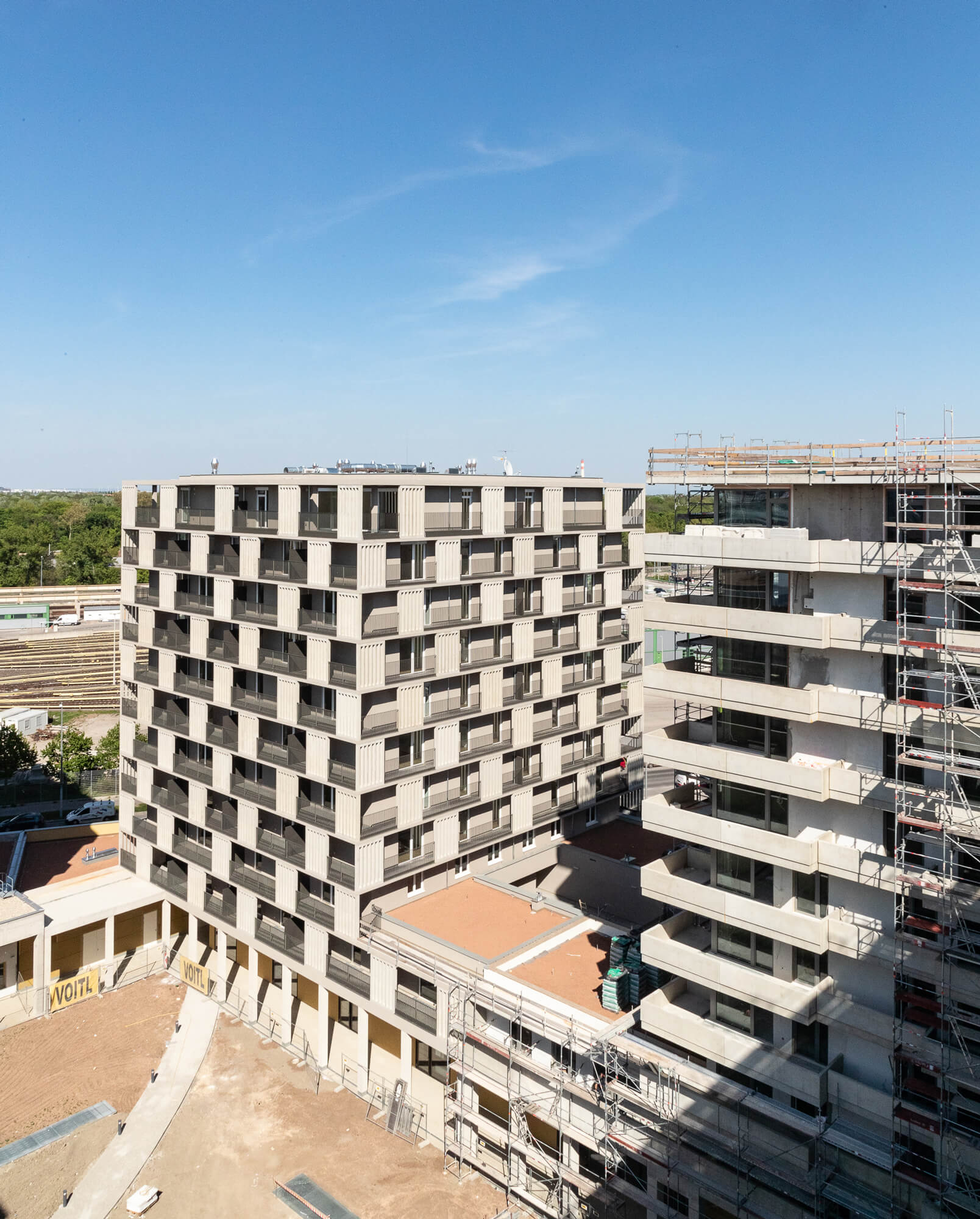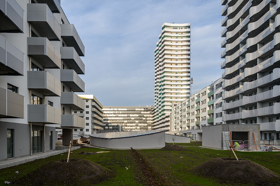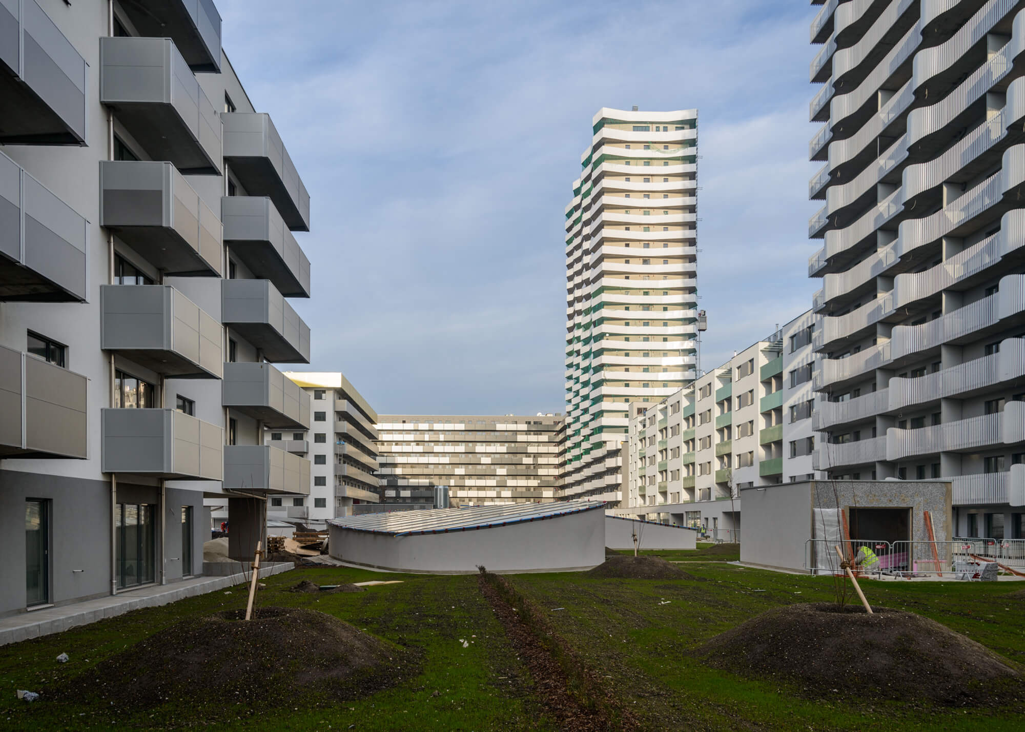 Der Einzelhandelsfachmarkt erstreckt sich über das gesamte Erdgeschoß. Entlang der Wagramer Straße erfolgt die Gliederung darüber in zwei 7- bis 8-geschoßige Riegelbauten und ein 35-geschoßiges Hochhaus. Angrenzend daran, entlang der Seyinger Straße, entsteht ein 27-geschoßiges Hochhaus und an der Julius Ficker Straße entsteht ein 11-geschoßiger Riegelbau. Weiters werden auf dem Einzelhandelsfachmarkt fünf weitere Bauteile freistehend 9 bis 10-geschoßig errichtet.