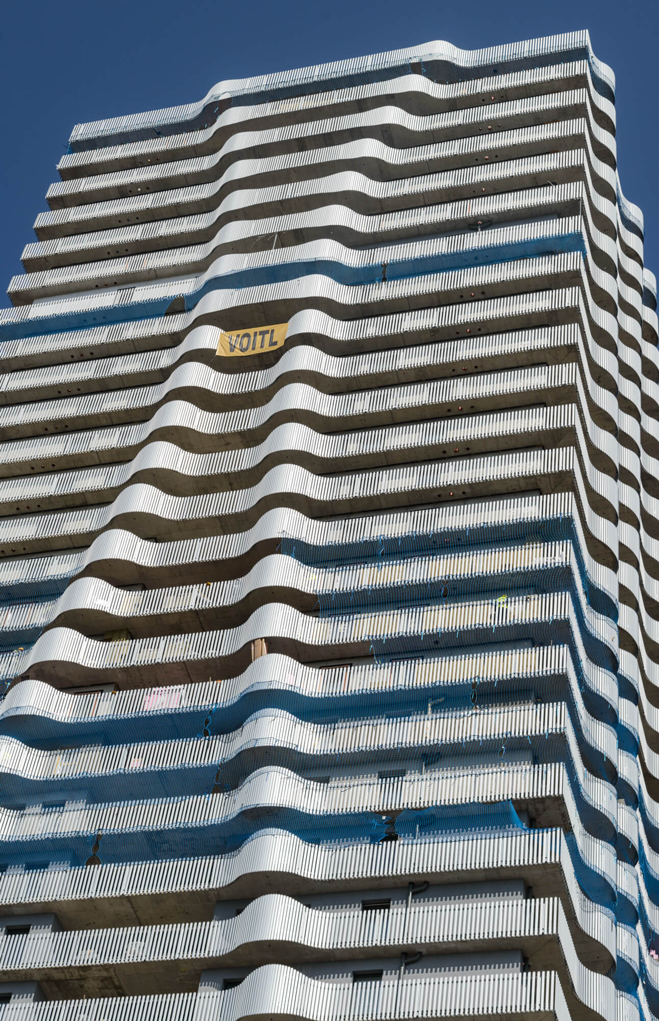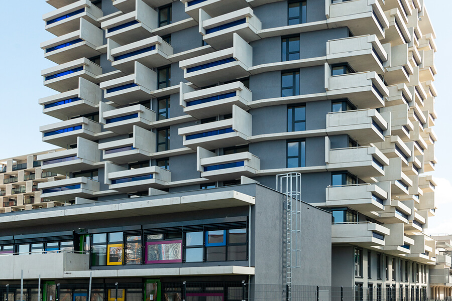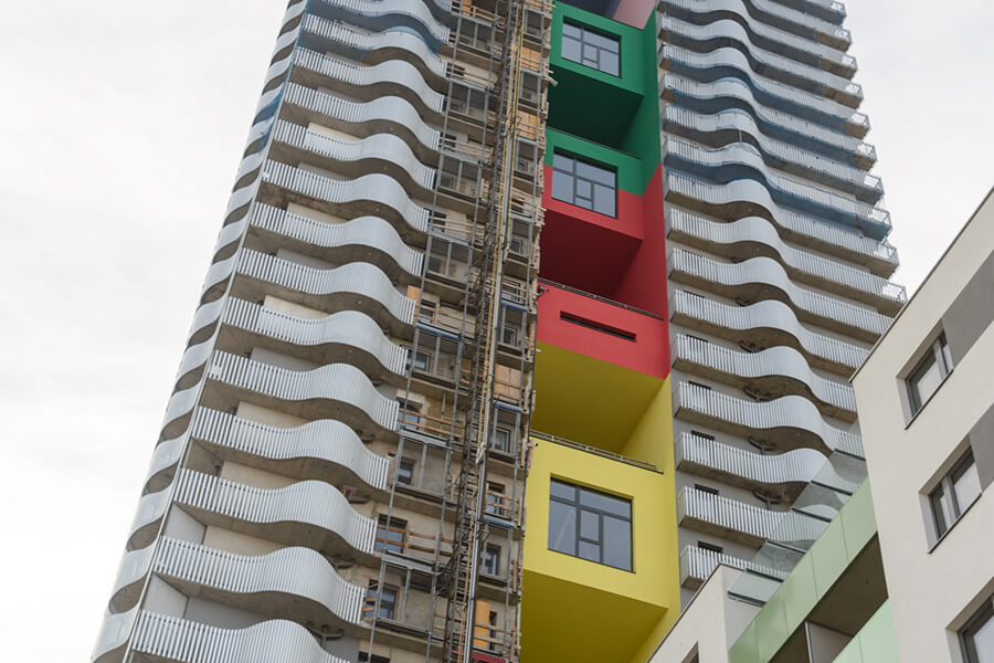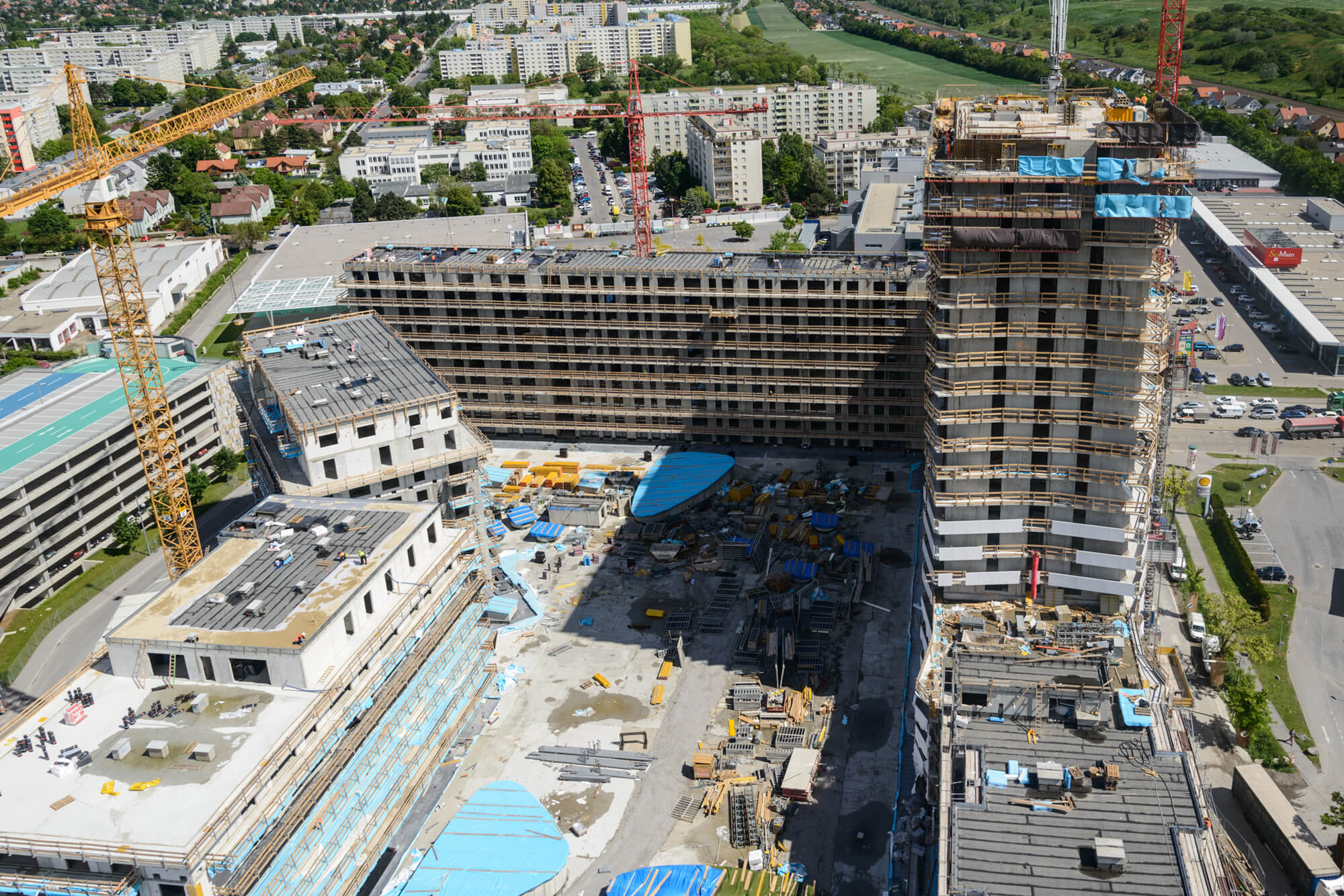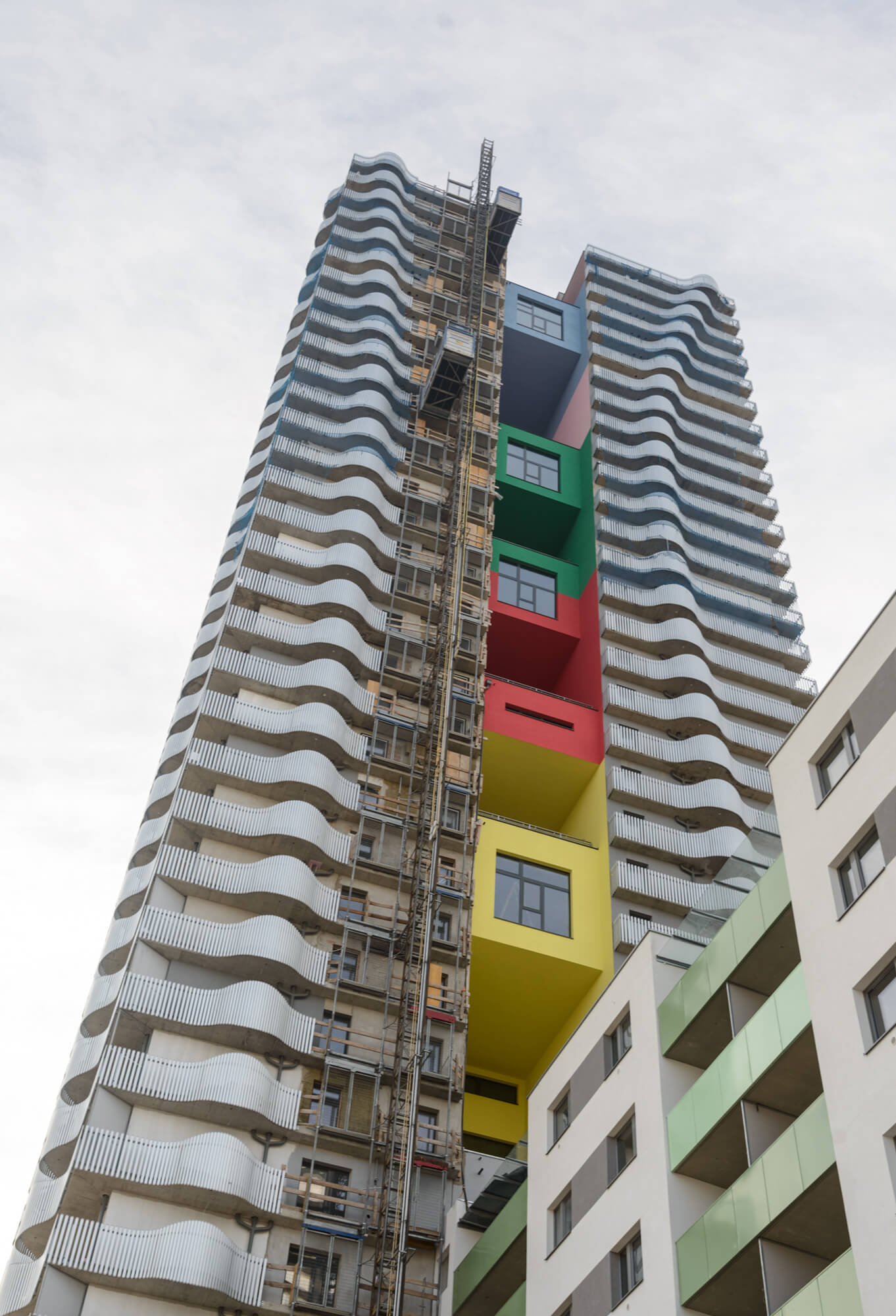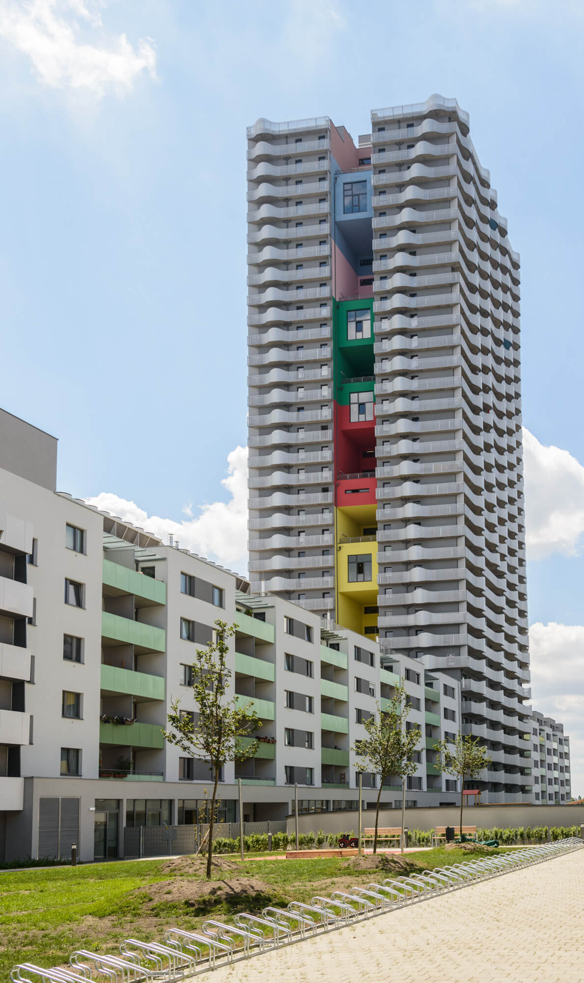 Der Einzelhandelsfachmarkt erstreckt sich über das gesamte Erdgeschoß. Entlang der Wagramer Straße erfolgt die Gliederung darüber in zwei 7- bis 8-geschoßige Riegelbauten und ein 35-geschoßiges Hochhaus. Angrenzend daran, entlang der Seyinger Straße, entsteht ein 27-geschoßiges Hochhaus und an der Julius Ficker Straße entsteht ein 11-geschoßiger Riegelbau. Weiters werden auf dem Einzelhandelsfachmarkt fünf weitere Bauteile freistehend 9 bis 10-geschoßig errichtet.