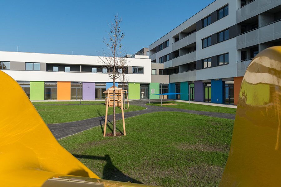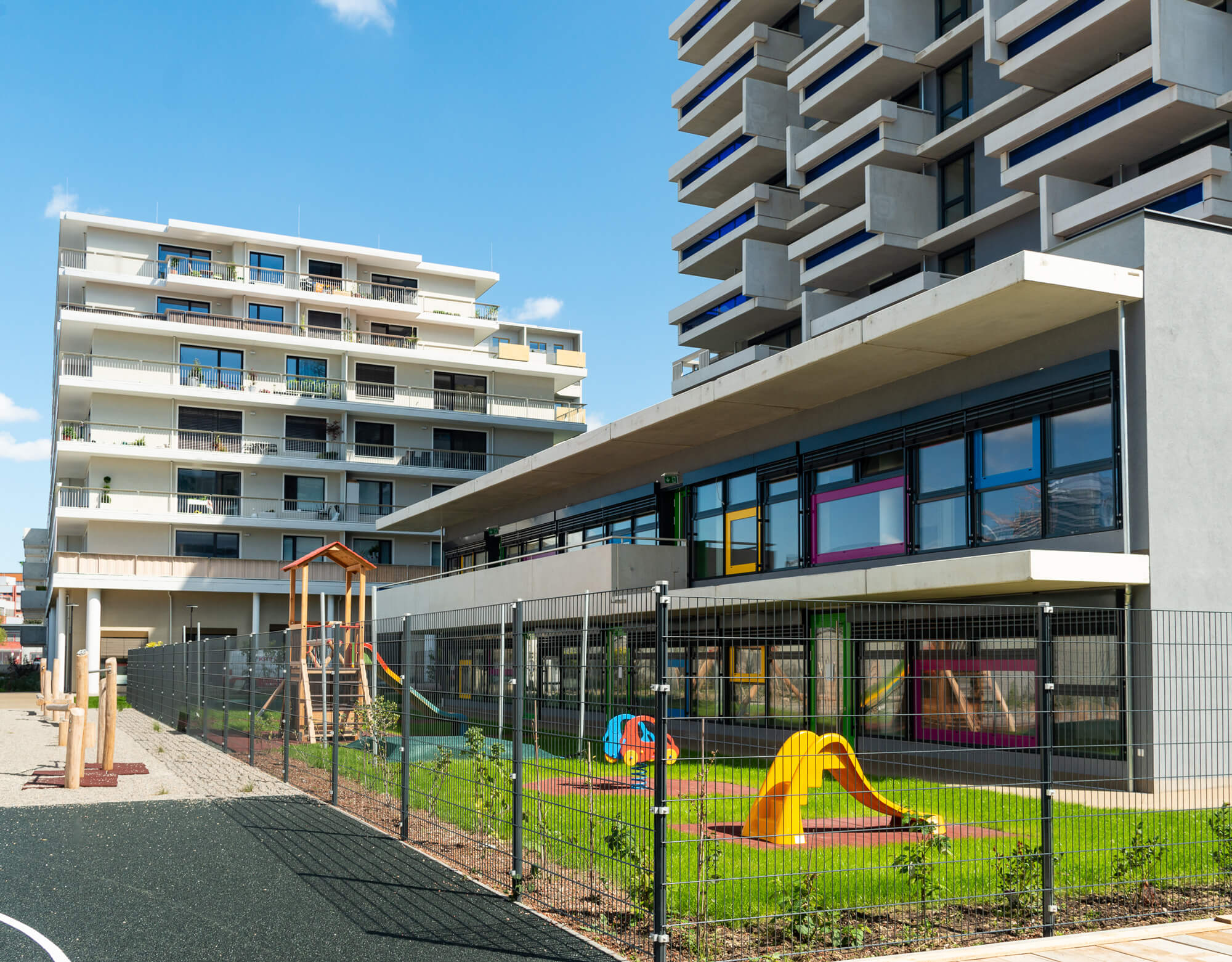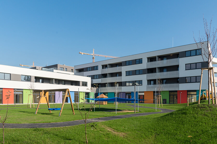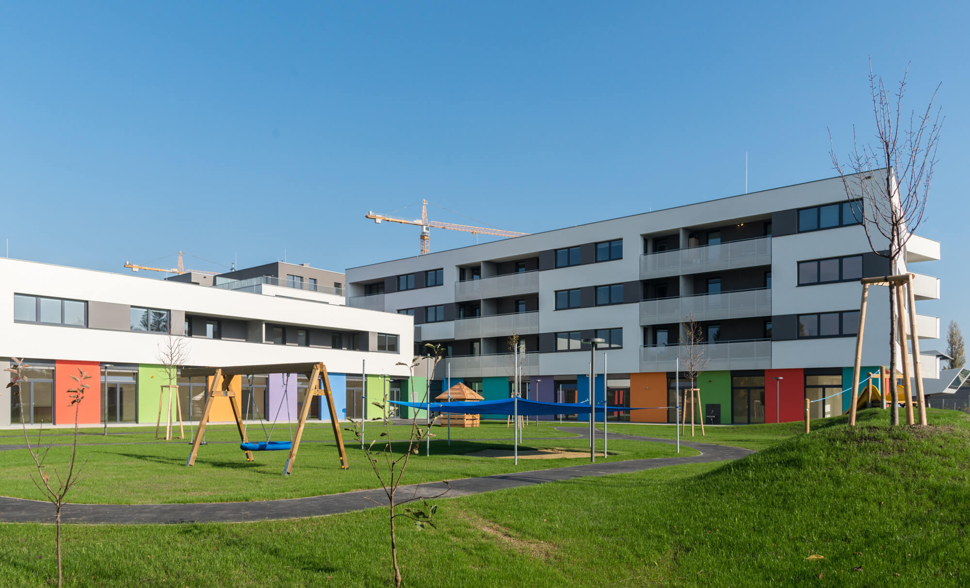Im Grün- und Freibereich werden ein Jugendspielplatz und drei Kleinkinderspielplätze errichtet.