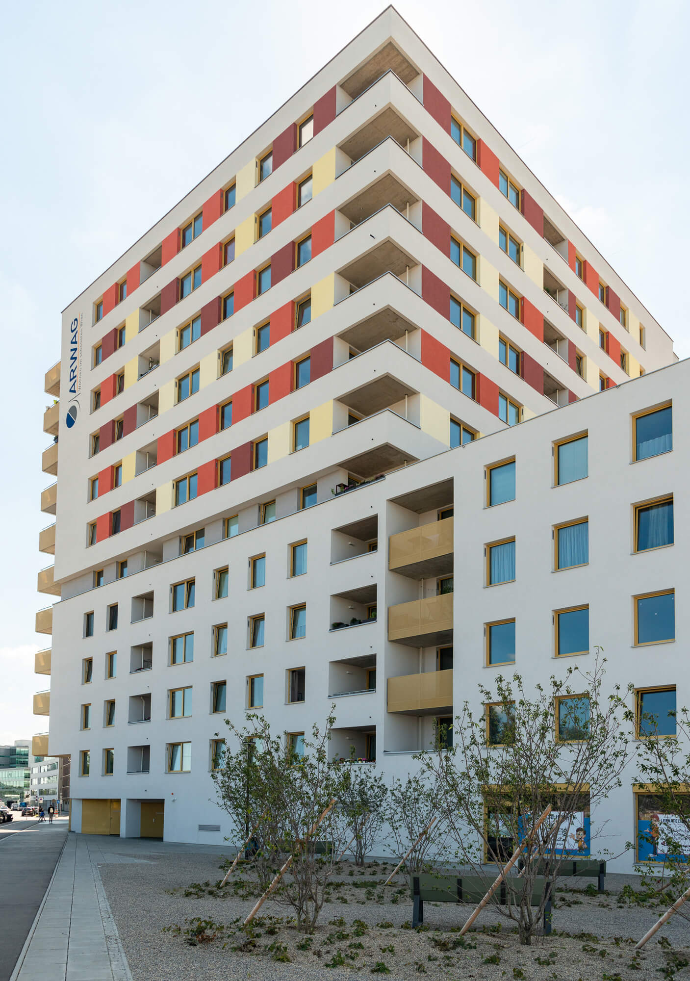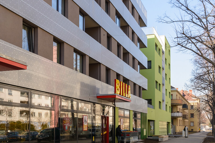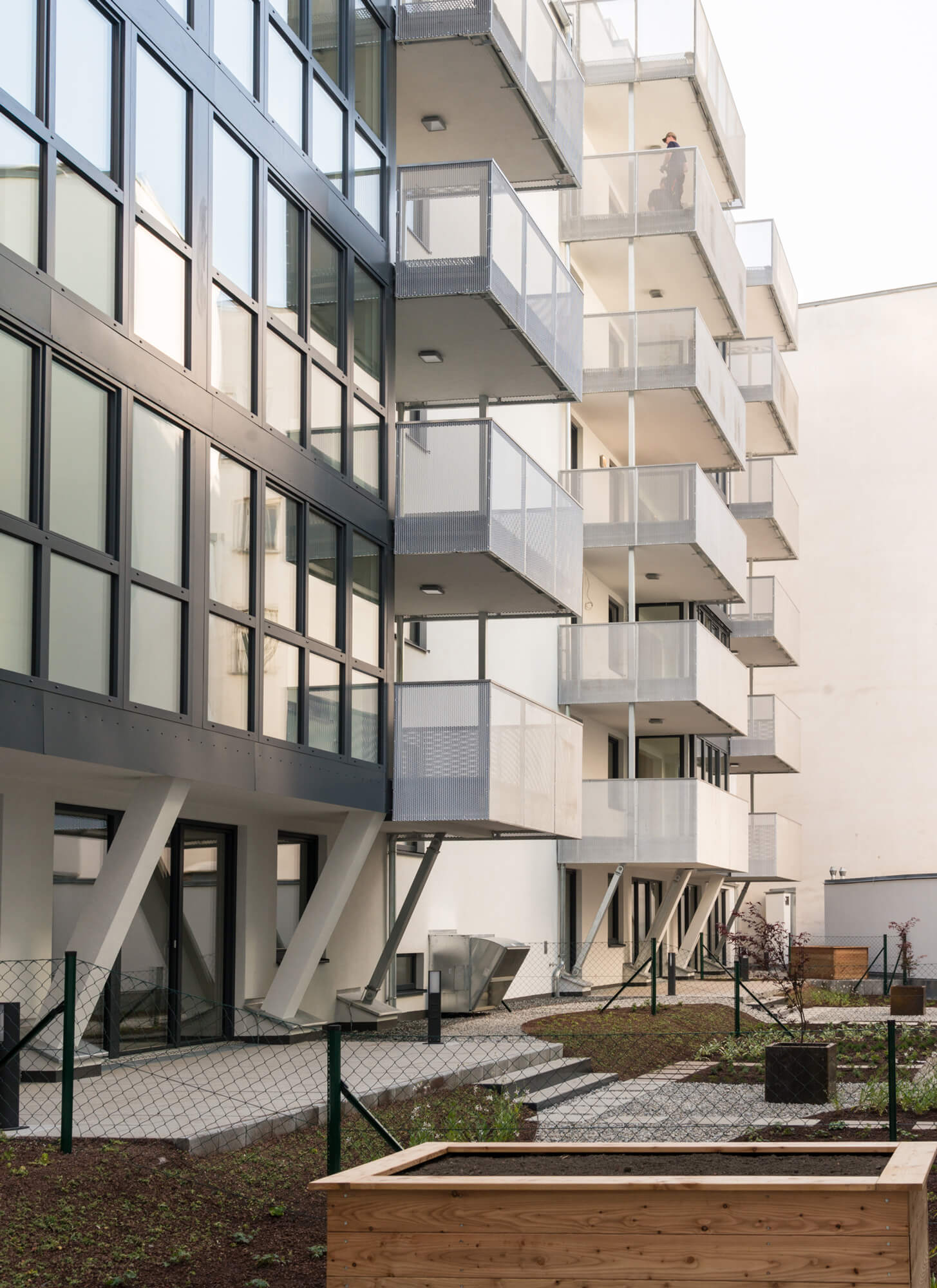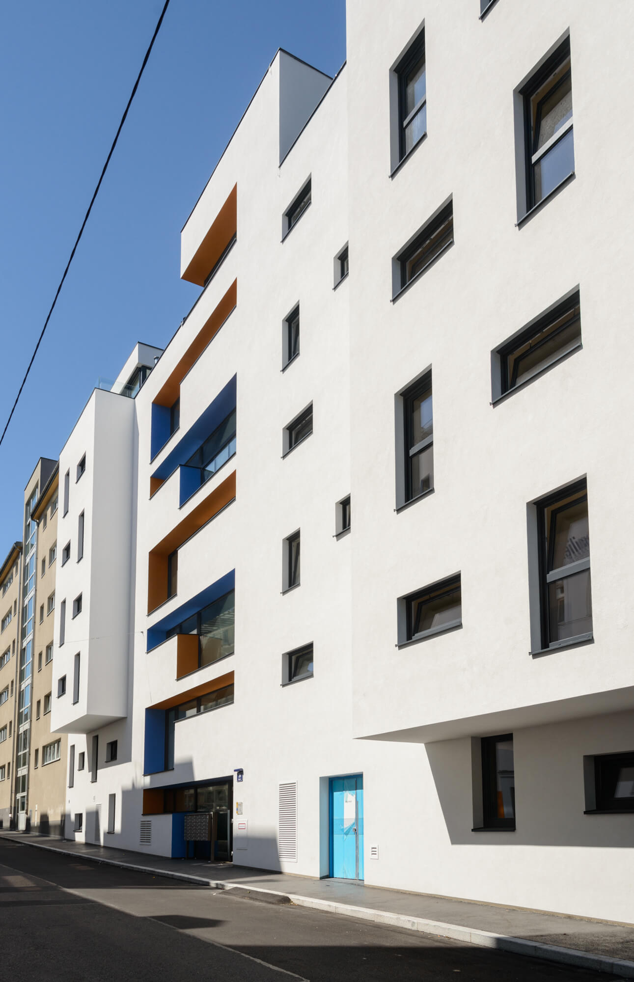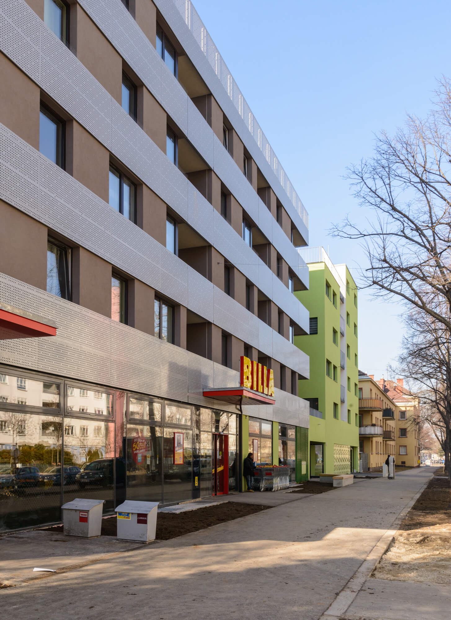 Im mit 11 Obergeschoßen (EG, 1–10 OG) und einem Untergeschoß errichteten Wohngebäude entstehen insgesamt 79 geförderte Wohnungen. Im Erdgeschoß und Teilen der ersten beiden Obergeschoße entstehen zudem ein Ambulatorium, eine Wohngemeinschaft und Gewerbeeinheiten.