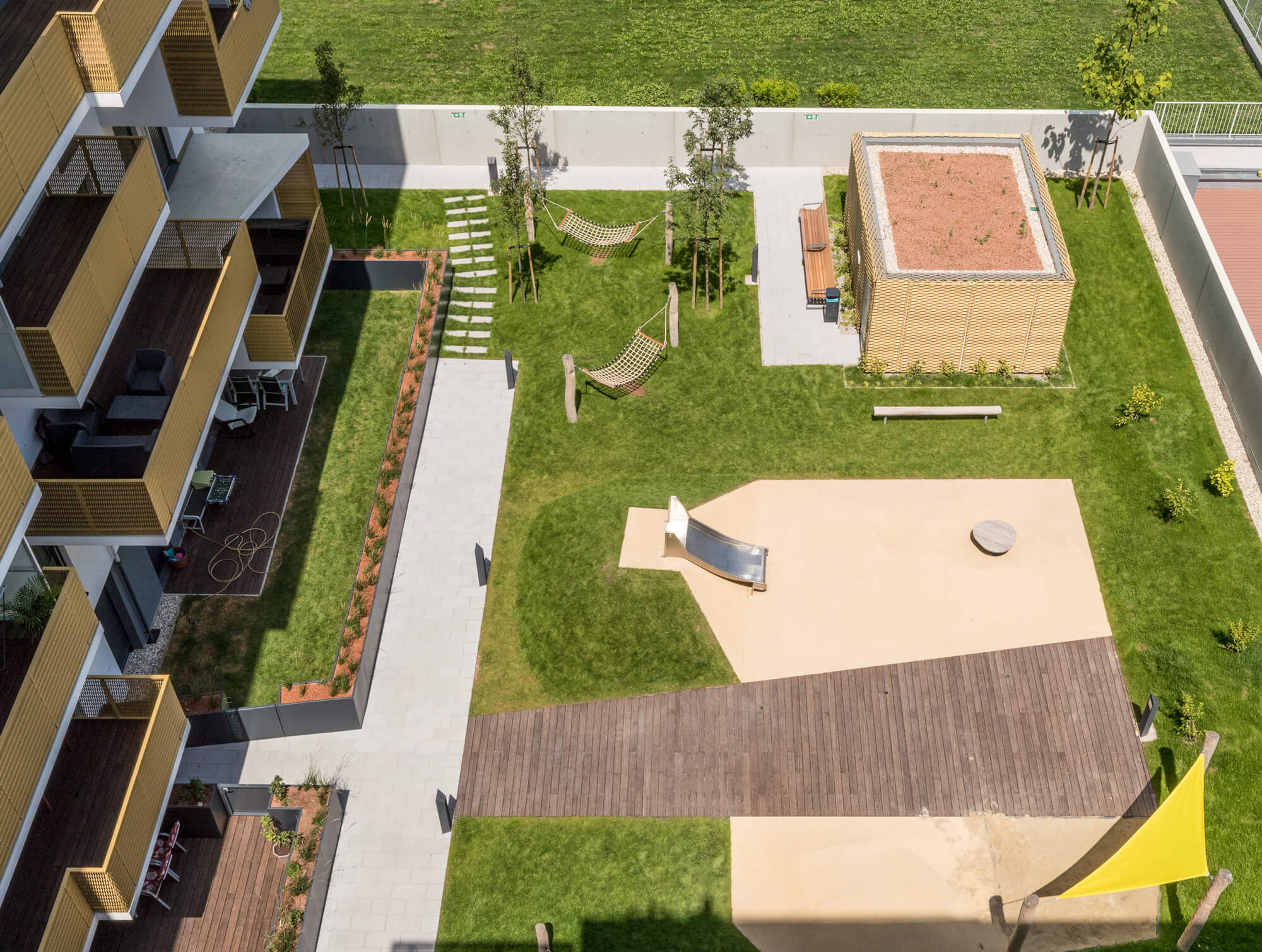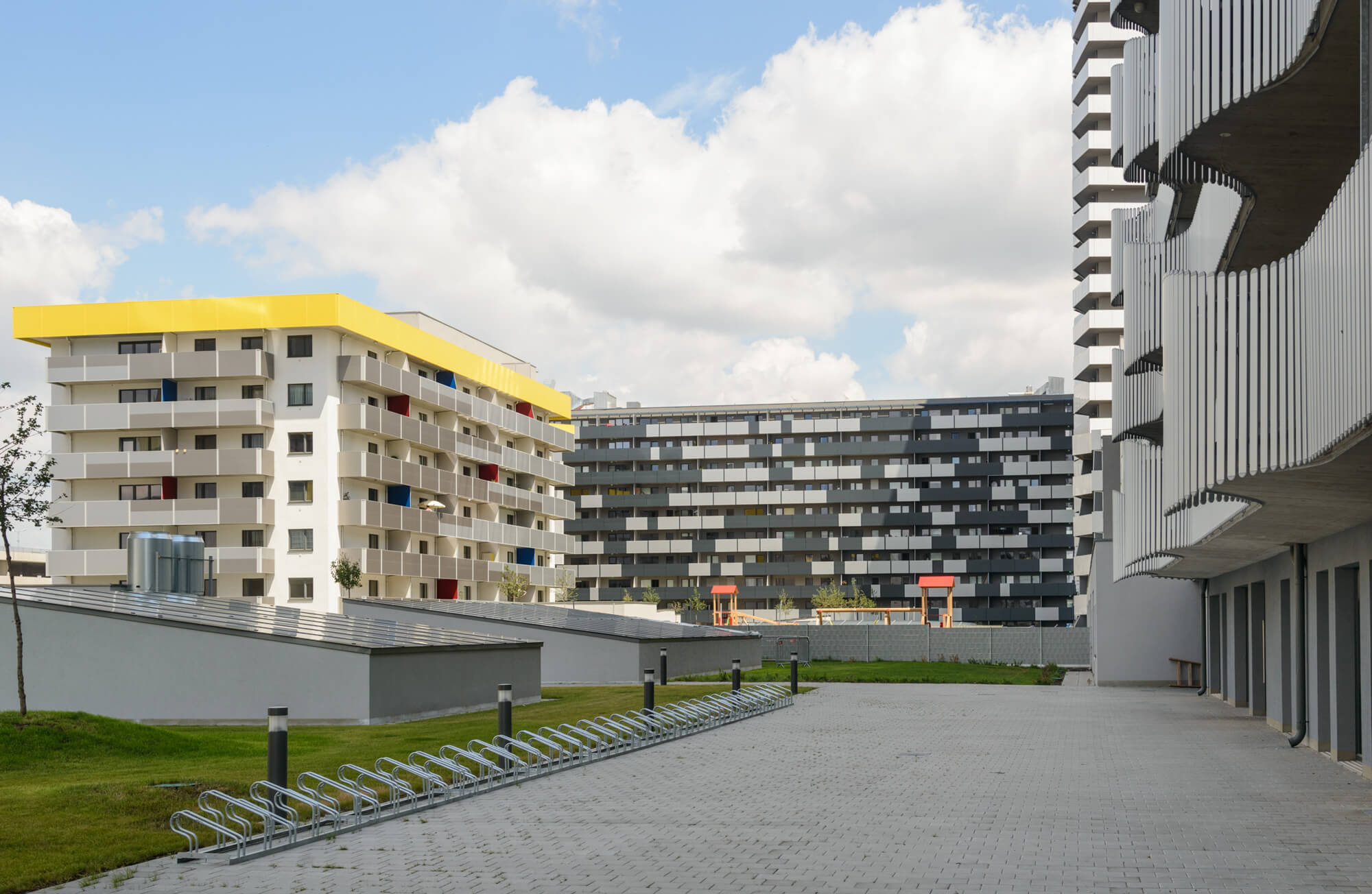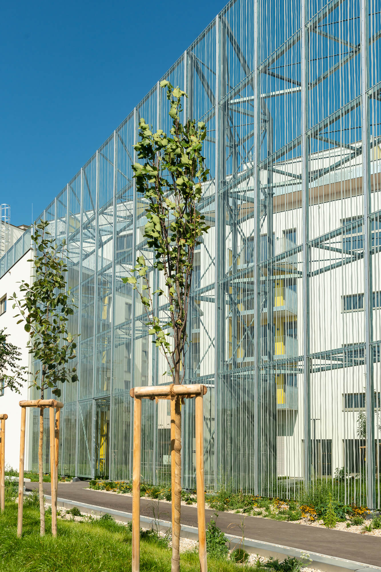 Das Projekt bietet ein großzügiges Angebot an Fahrrad- und Motorradstellplätzen, die teilweise ebenerdig zugänglich sind. Den Kern der Anlage bilden die bauplatzübergreifenden Grün- und Freiflächen für das gesamte Wohngebiet und die internen Wegenetze zu den benachbarten Bauplätzen.