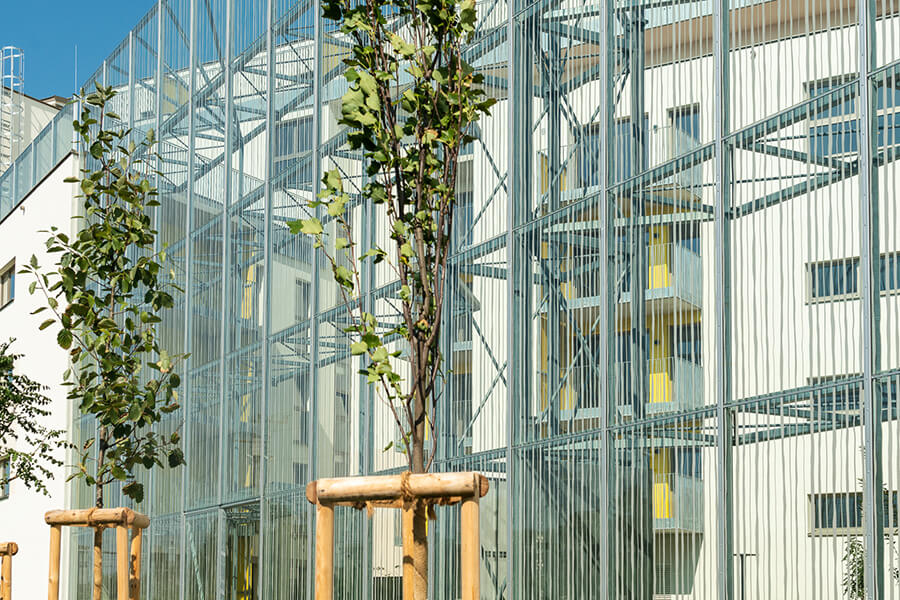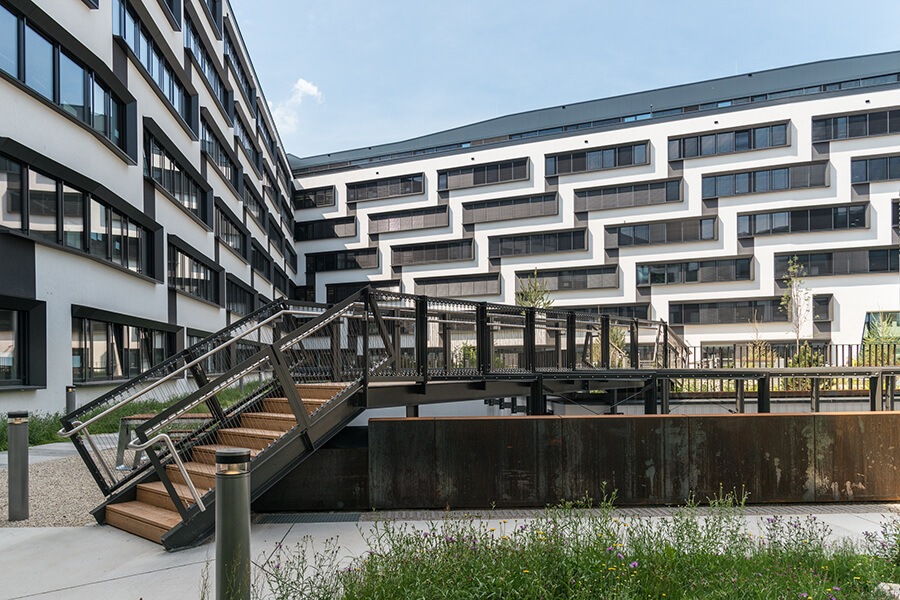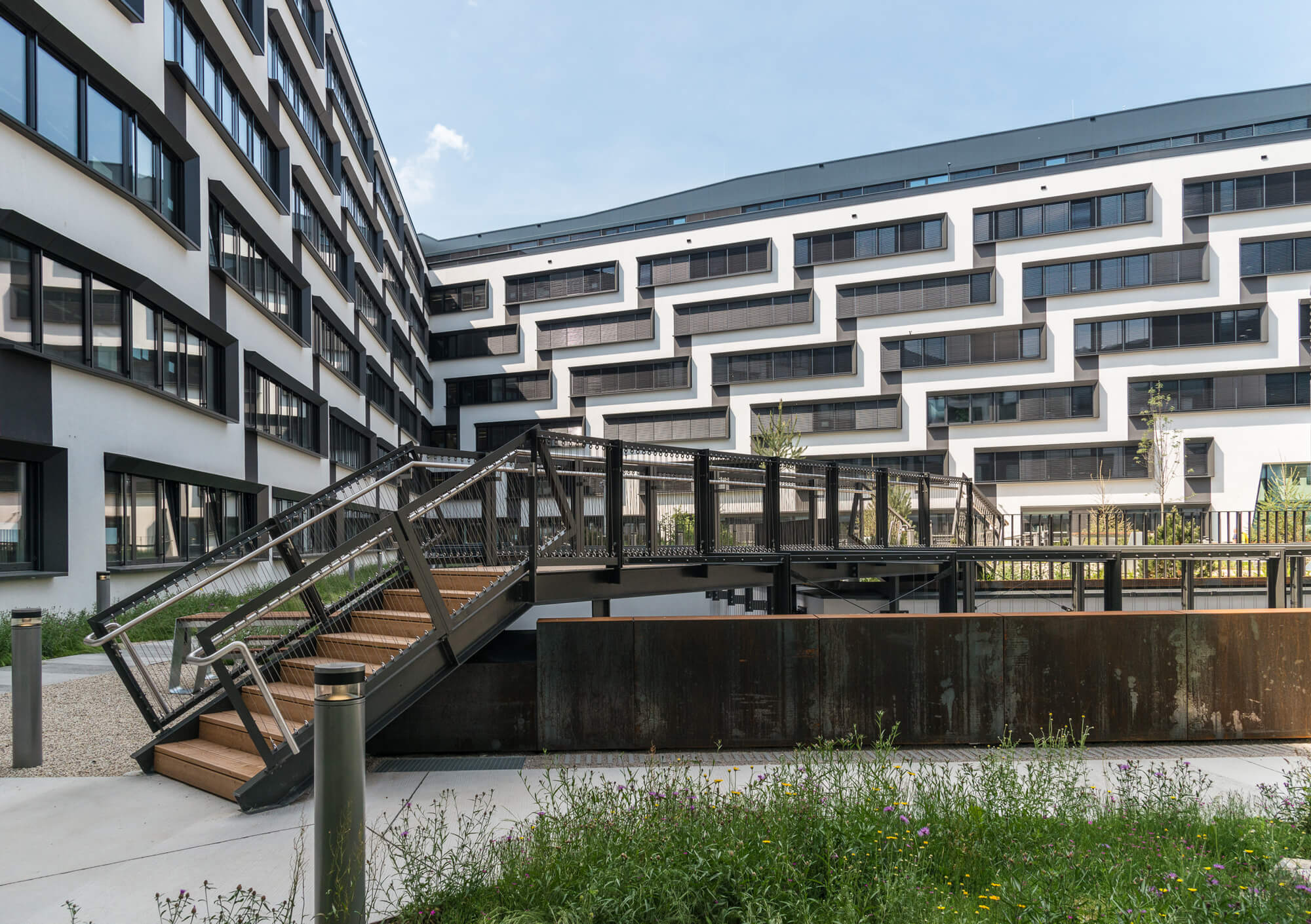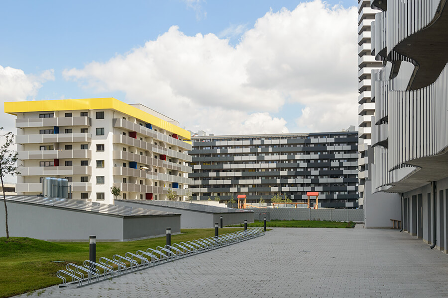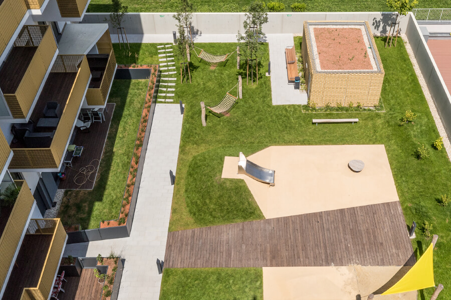 Das Projekt bietet ein großzügiges Angebot an Fahrrad- und Motorradstellplätzen, die teilweise ebenerdig zugänglich sind. Den Kern der Anlage bilden die bauplatzübergreifenden Grün- und Freiflächen für das gesamte Wohngebiet und die internen Wegenetze zu den benachbarten Bauplätzen.