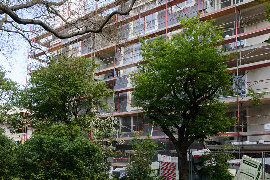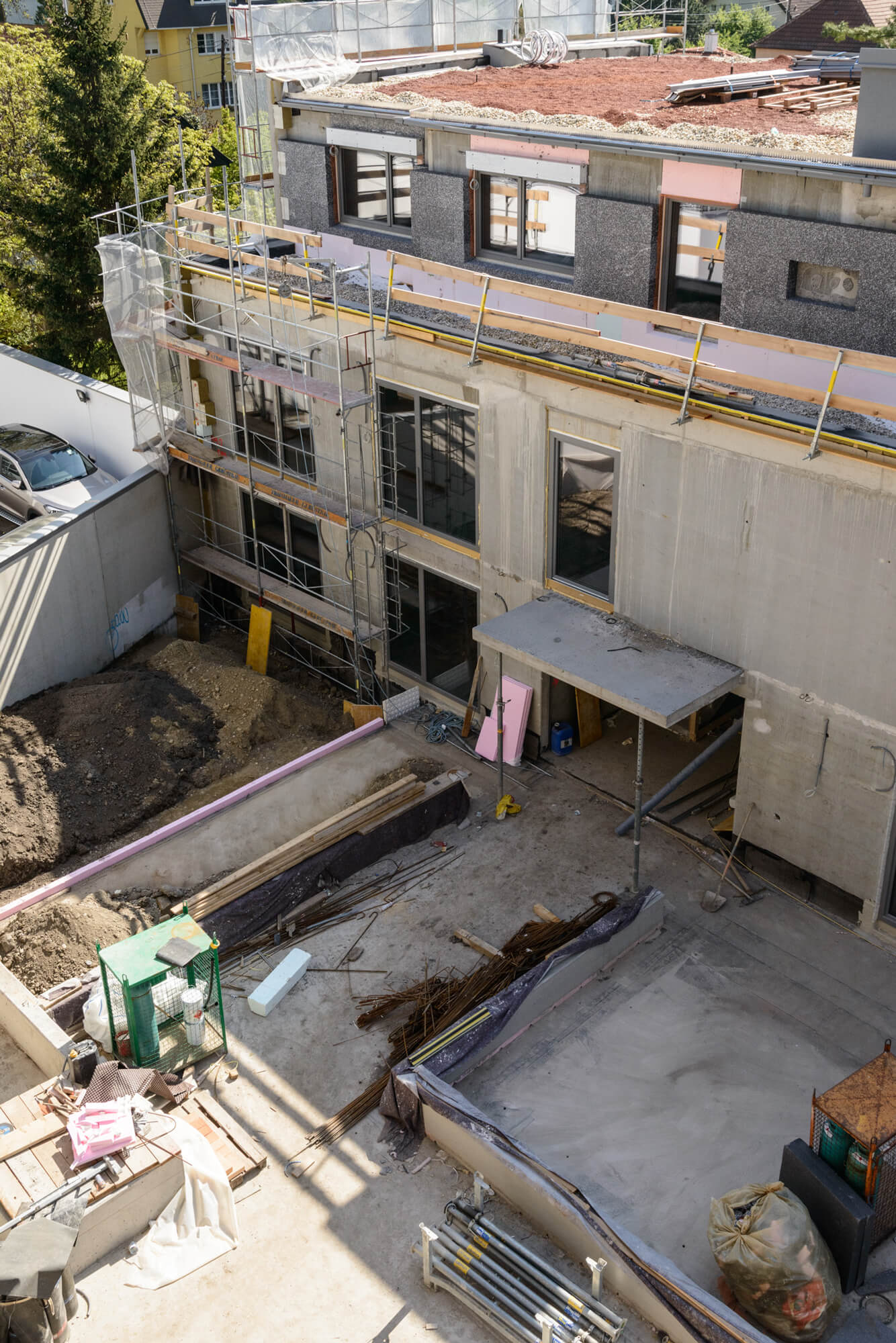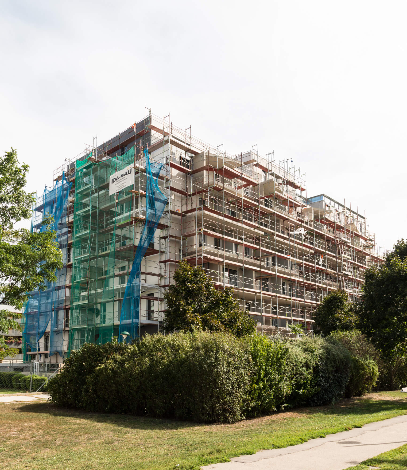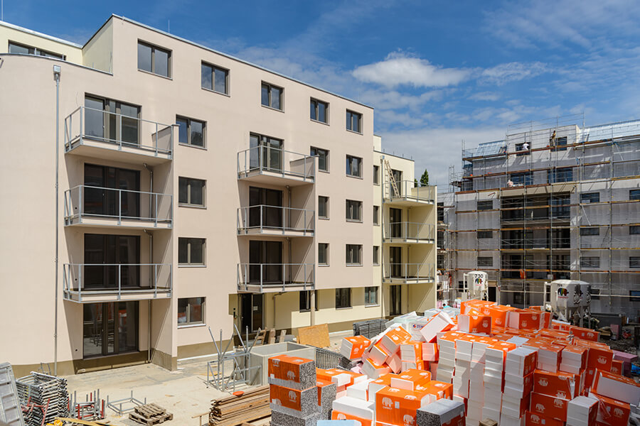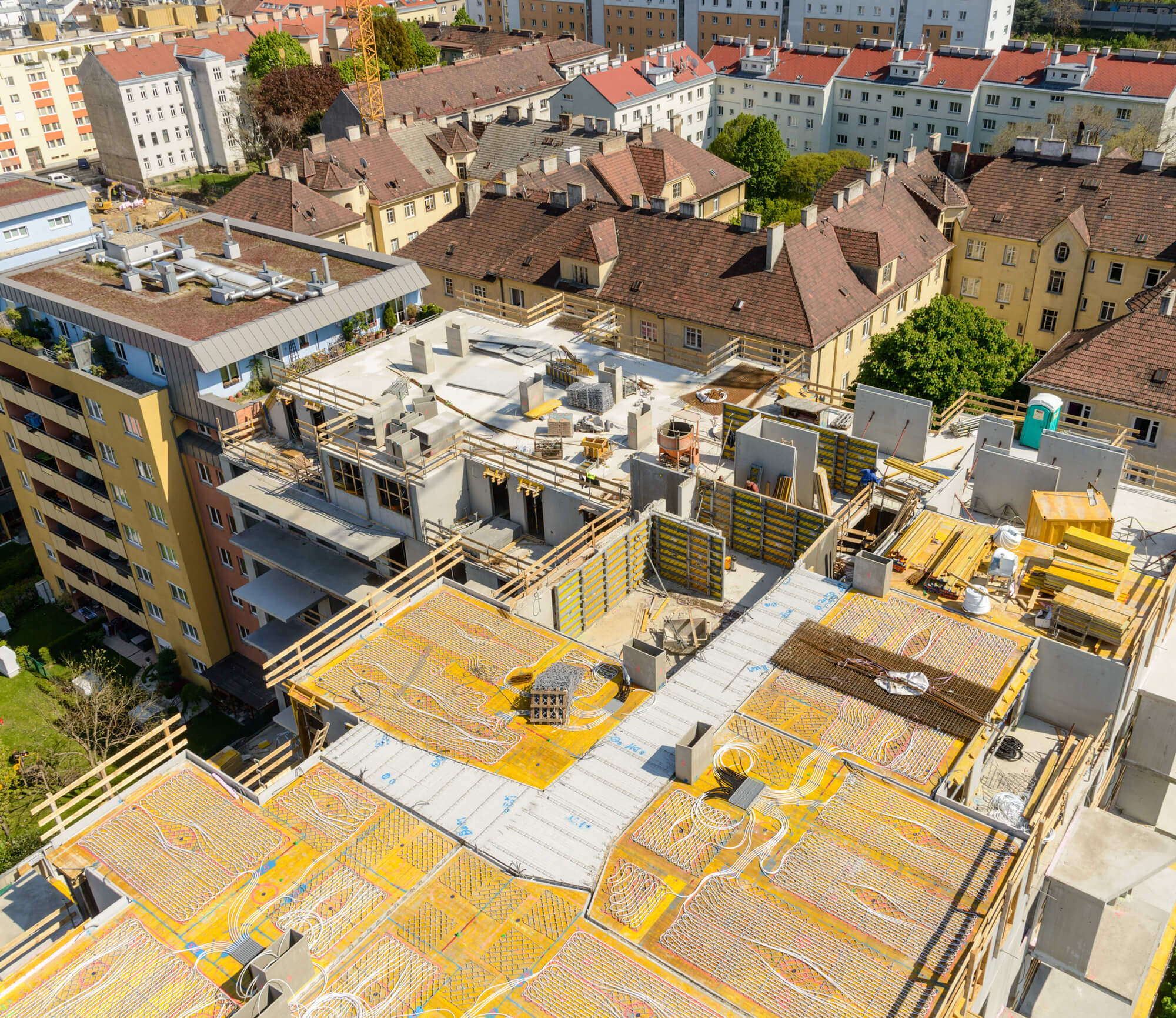 An den Bestandsobjekten werden sowohl die Stiegenhäuser als auch die kompletten Fassaden saniert. Zur Durchführung der Aufstockung müssen vorab die bestehenden Dächer abgebrochen werden und eine provisorische Abdichtung an der letzten Geschoßdecke aufgebracht werden, da die Bestandsobjekte während der gesamten Bauzeit bewohnt bleiben. Neben allen statisch konstruktiven Maßnahmen ist auch die Verlängerung der bestehenden Aufzüge ein weiteres technisches Highlight. Bei den Bestandswohnungen werden weiters die Balkone durch Einbau einer zusätzlichen Stahlkonstruktion und der Herstellung neuer Geländer saniert.