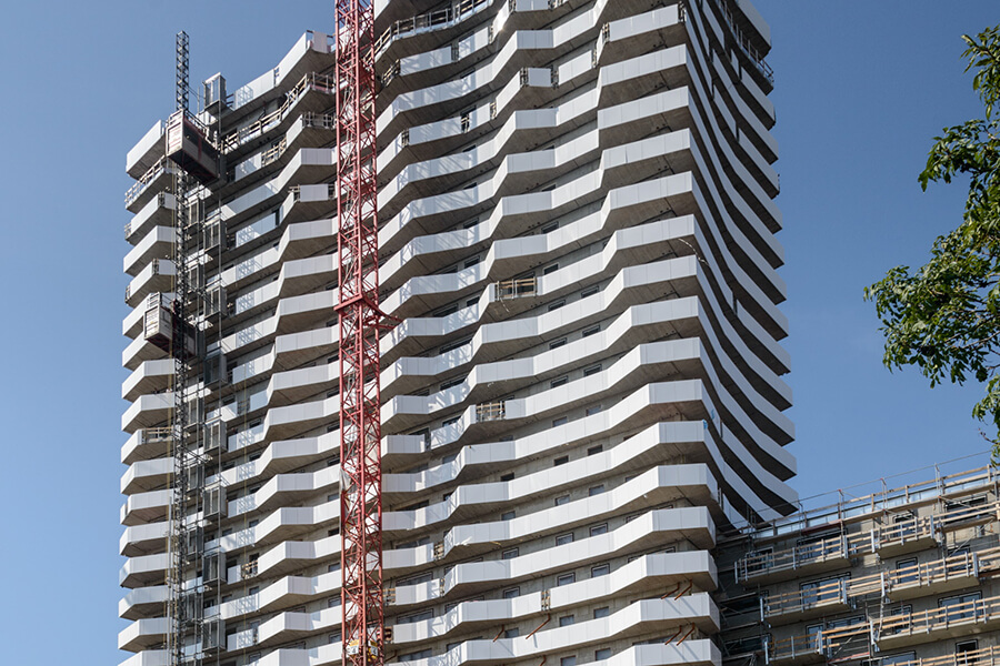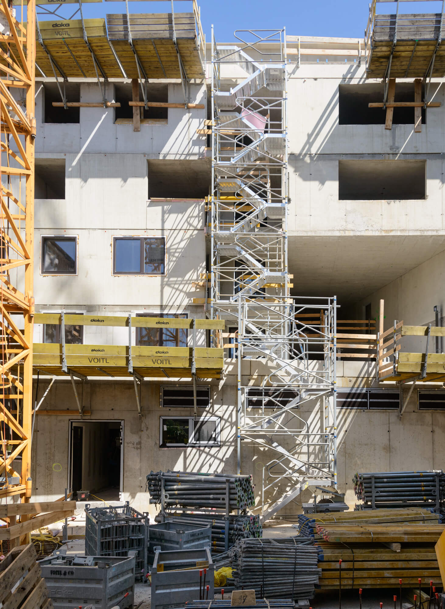 Jede der 12 Stiegen erhält einen Aufzugszubau mit Schächten in massiver Bauweise.