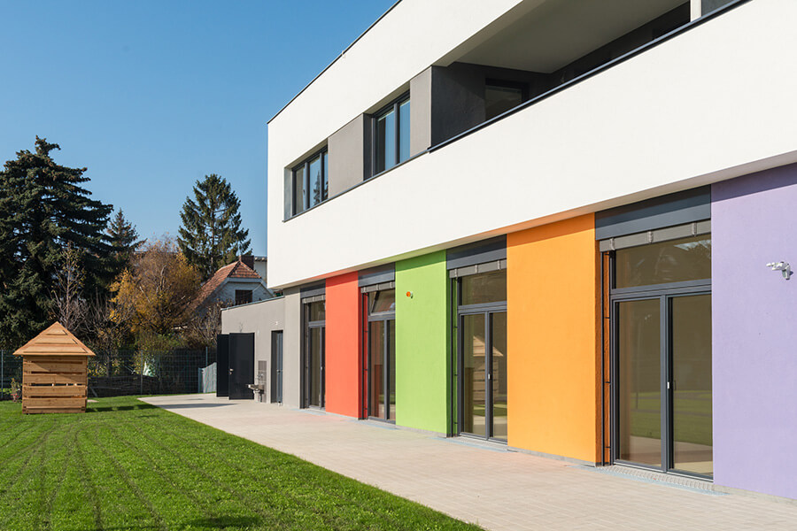 Ein Kleinkinderspielplatz sowie ein Kinder- und ein Jugendspielraum runden das Raumprogramm ab.