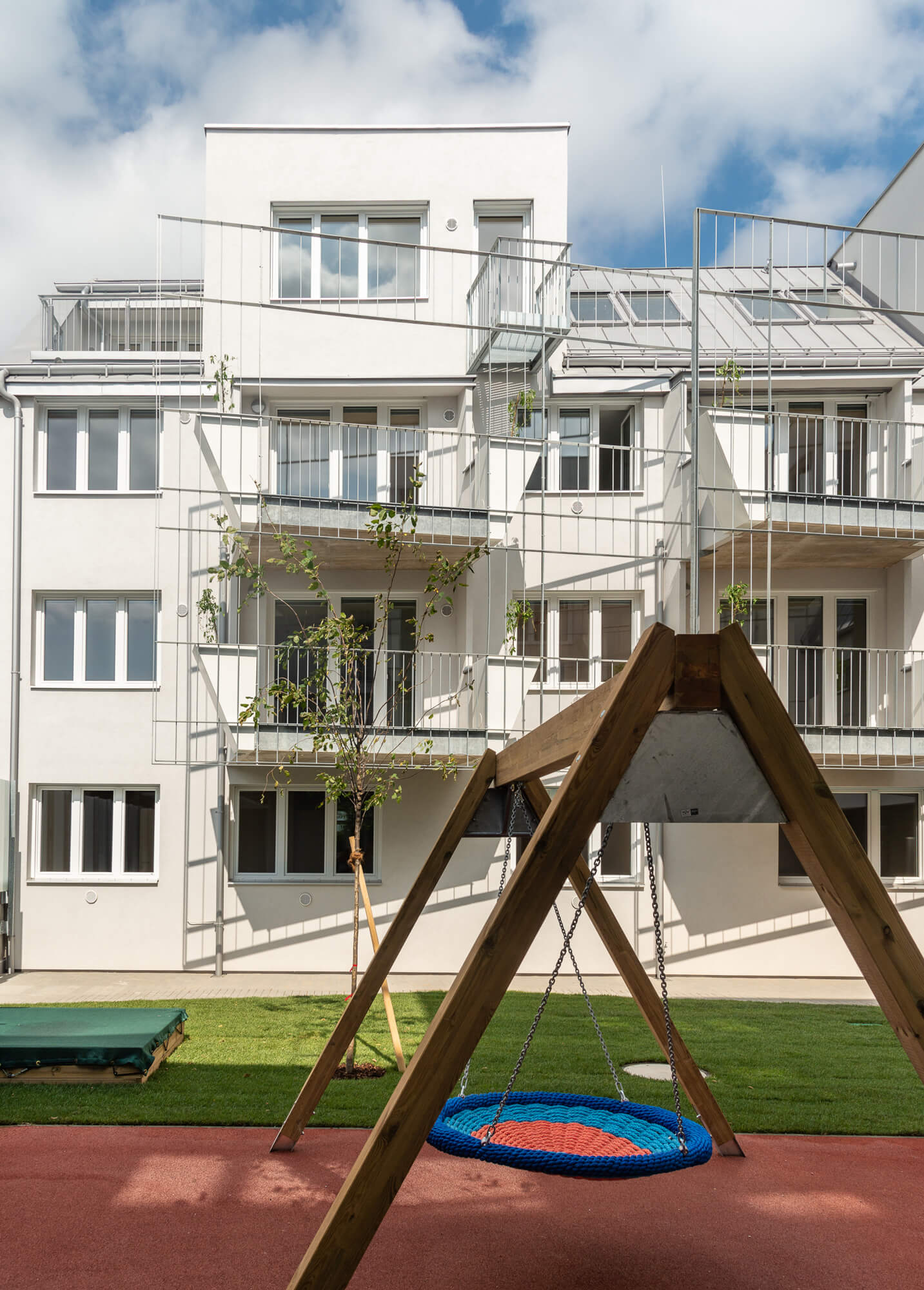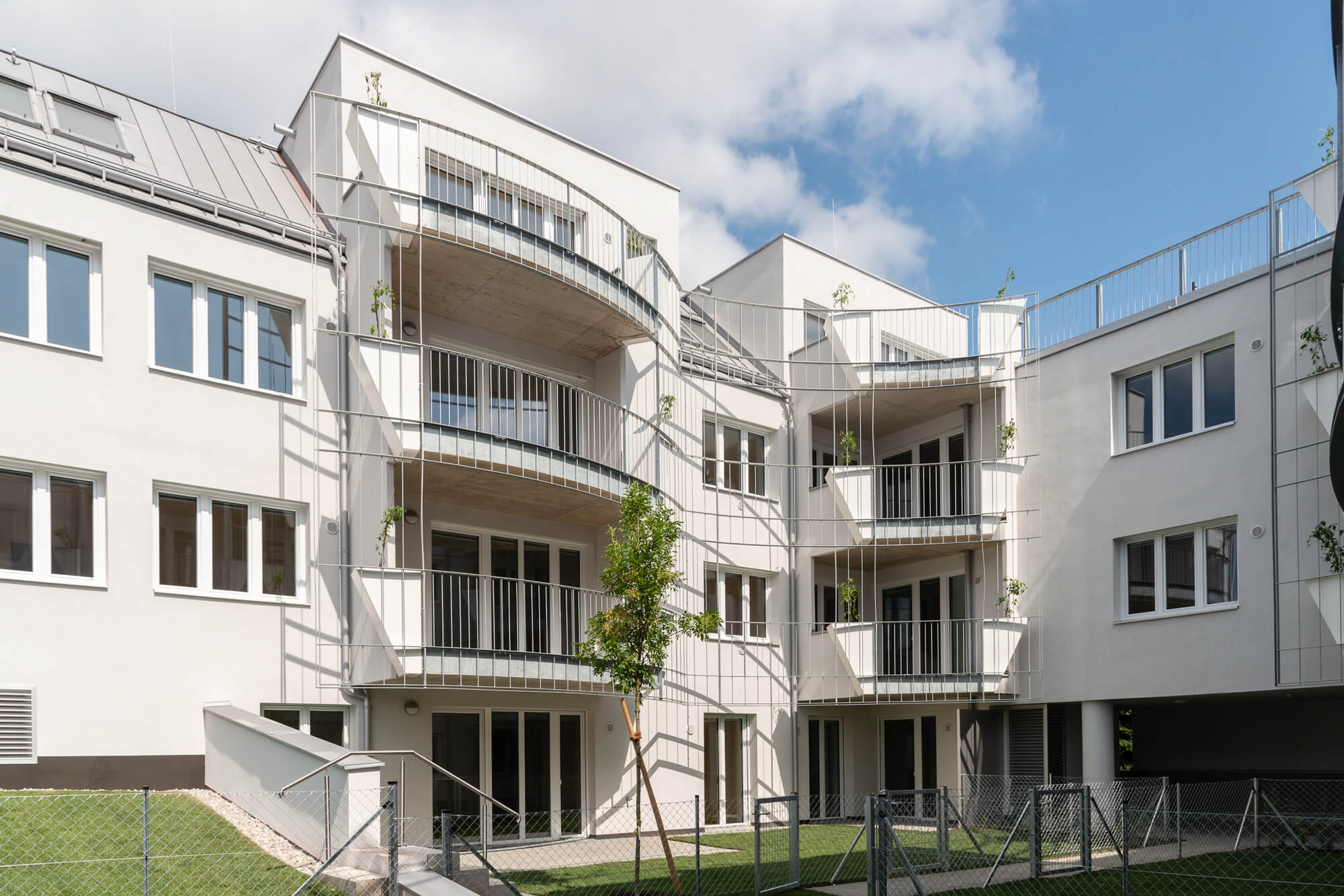 Die 36 Wohnungen teilen sich auf die fünf oberirdischen Geschoße auf, wobei alle Erdgeschoßwohnungen über Eigengärten verfügen. Sämtliche Wohnungen sind über ein von oben natürlich belichtetes, zentral situiertes Stiegenhaus erreichbar.