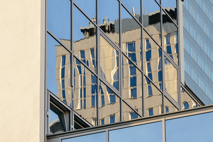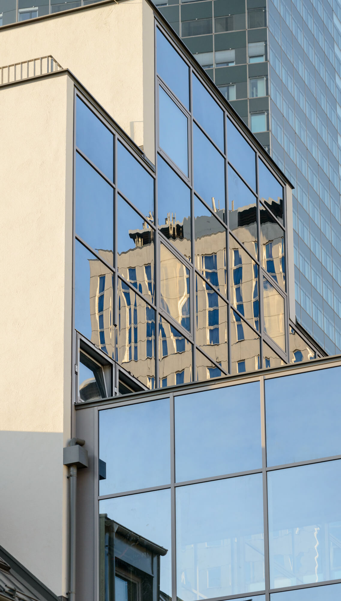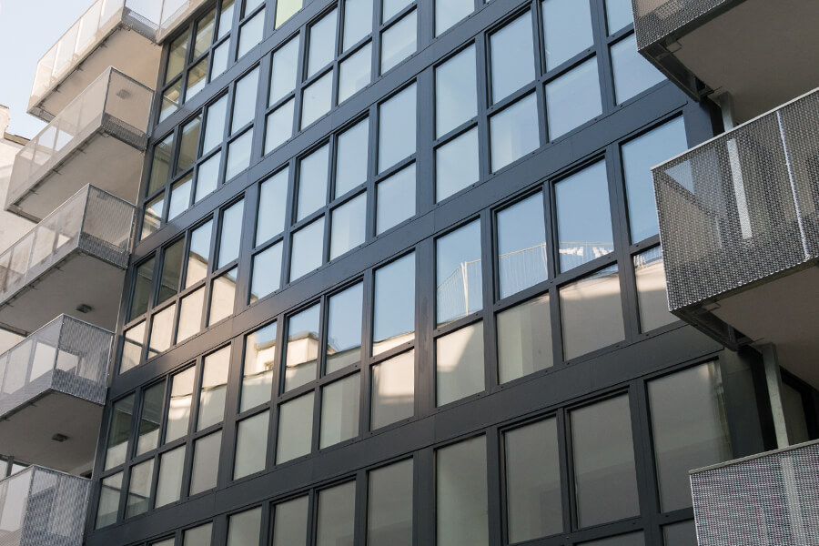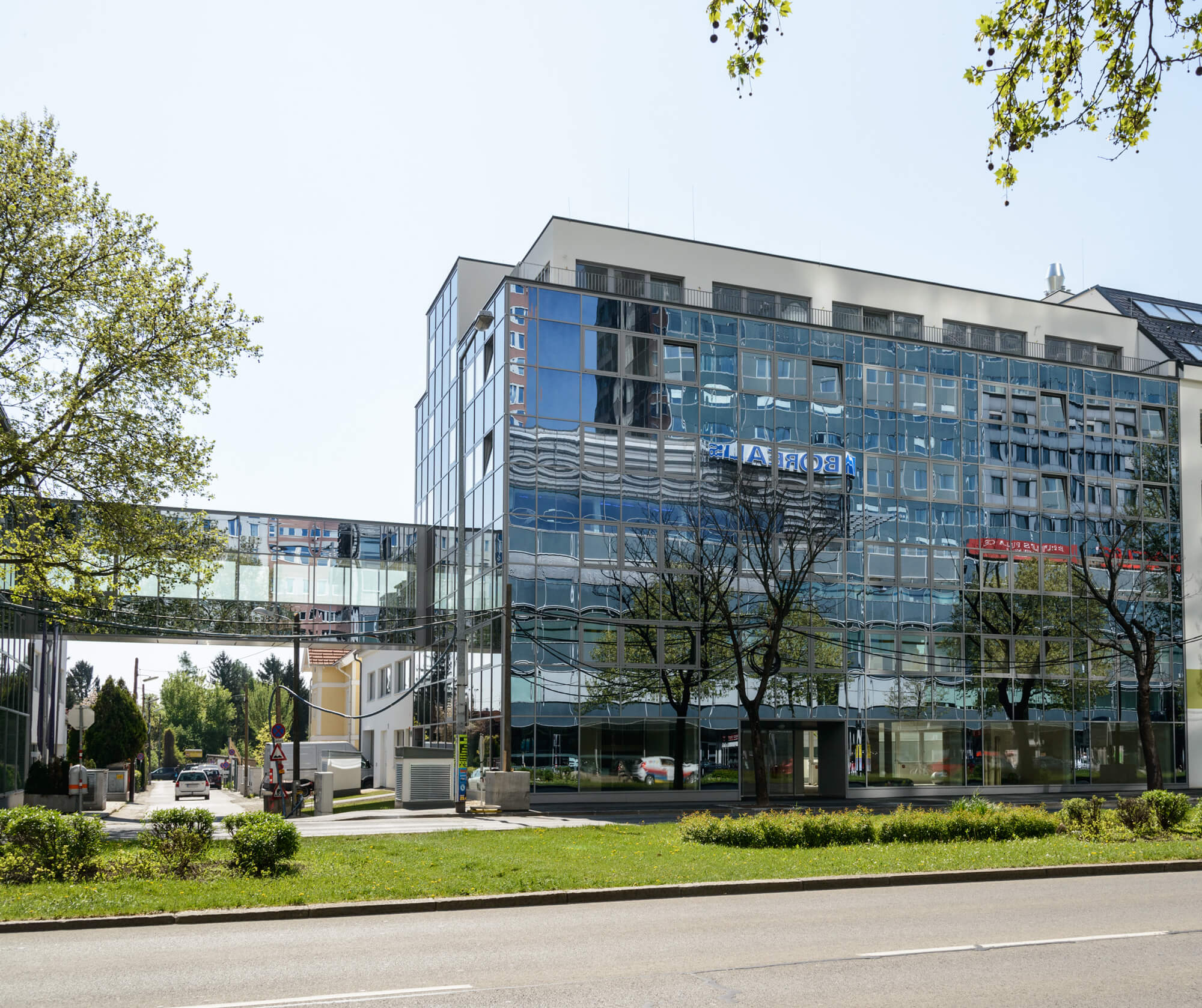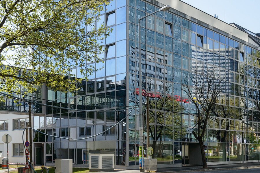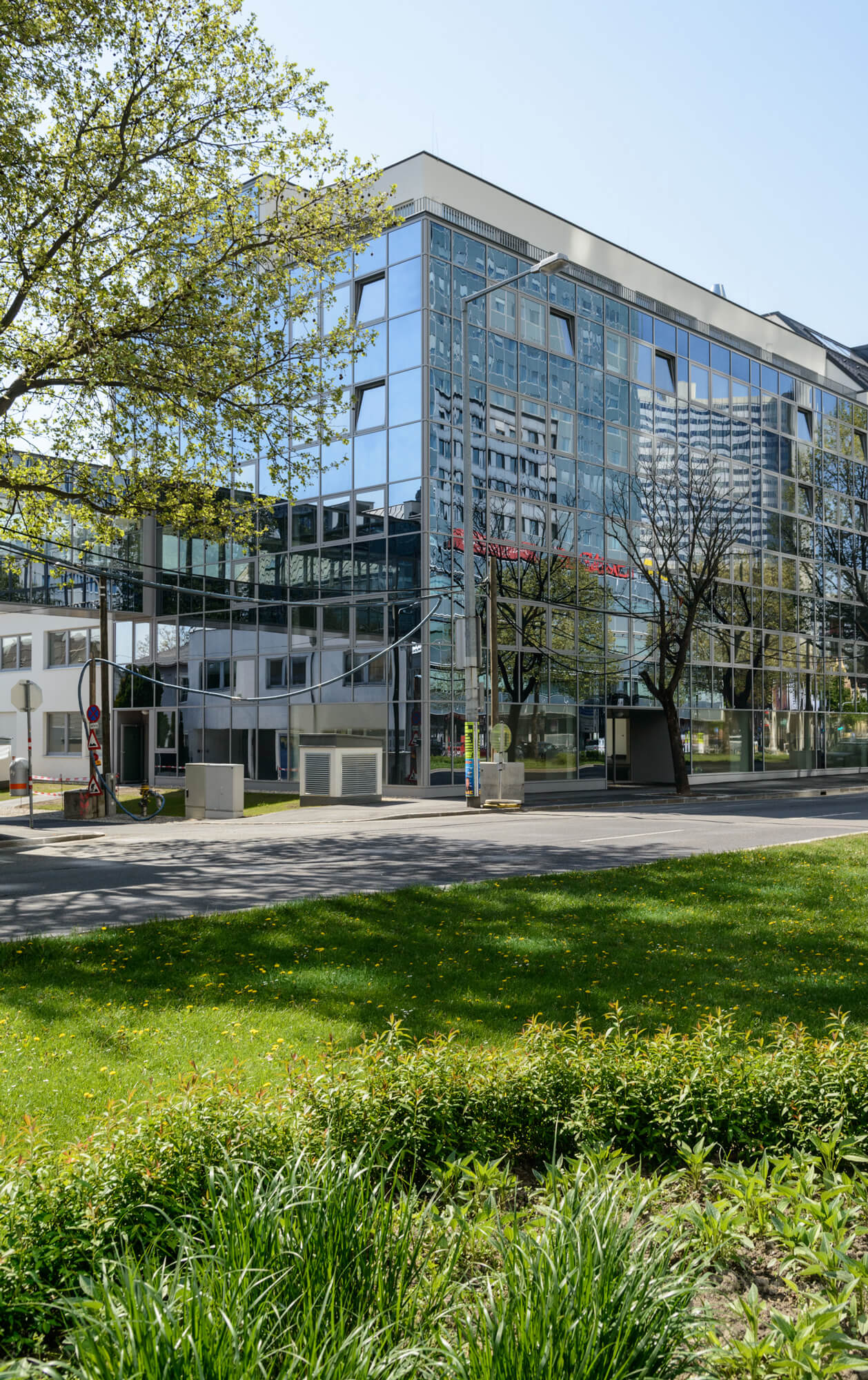 Das bestehende Bürogebäude in der Wagramer Straße 28-30 wird mittels einer Verbindungsbrücke im 2.OG angebunden. Die Fassade des Neubaus wird in Konstruktion und Farbgestaltung an das bestehende Bürogebäude angepasst.