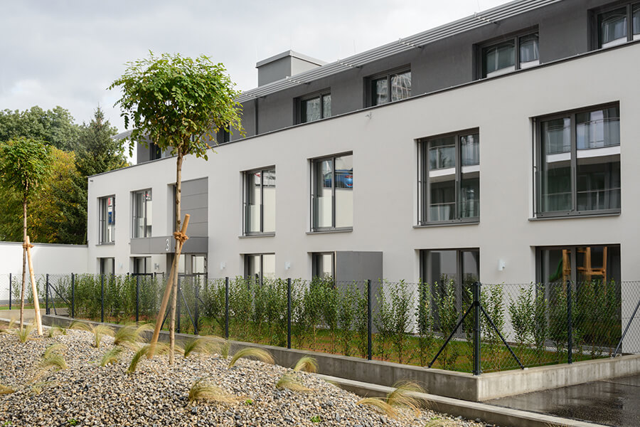Die Außenanlagen werden gärtnerisch ausgestaltet, das Zentrum bildet ein Parkbereich mit großzügigen Erholungsflächen und Kinderspielplätzen.