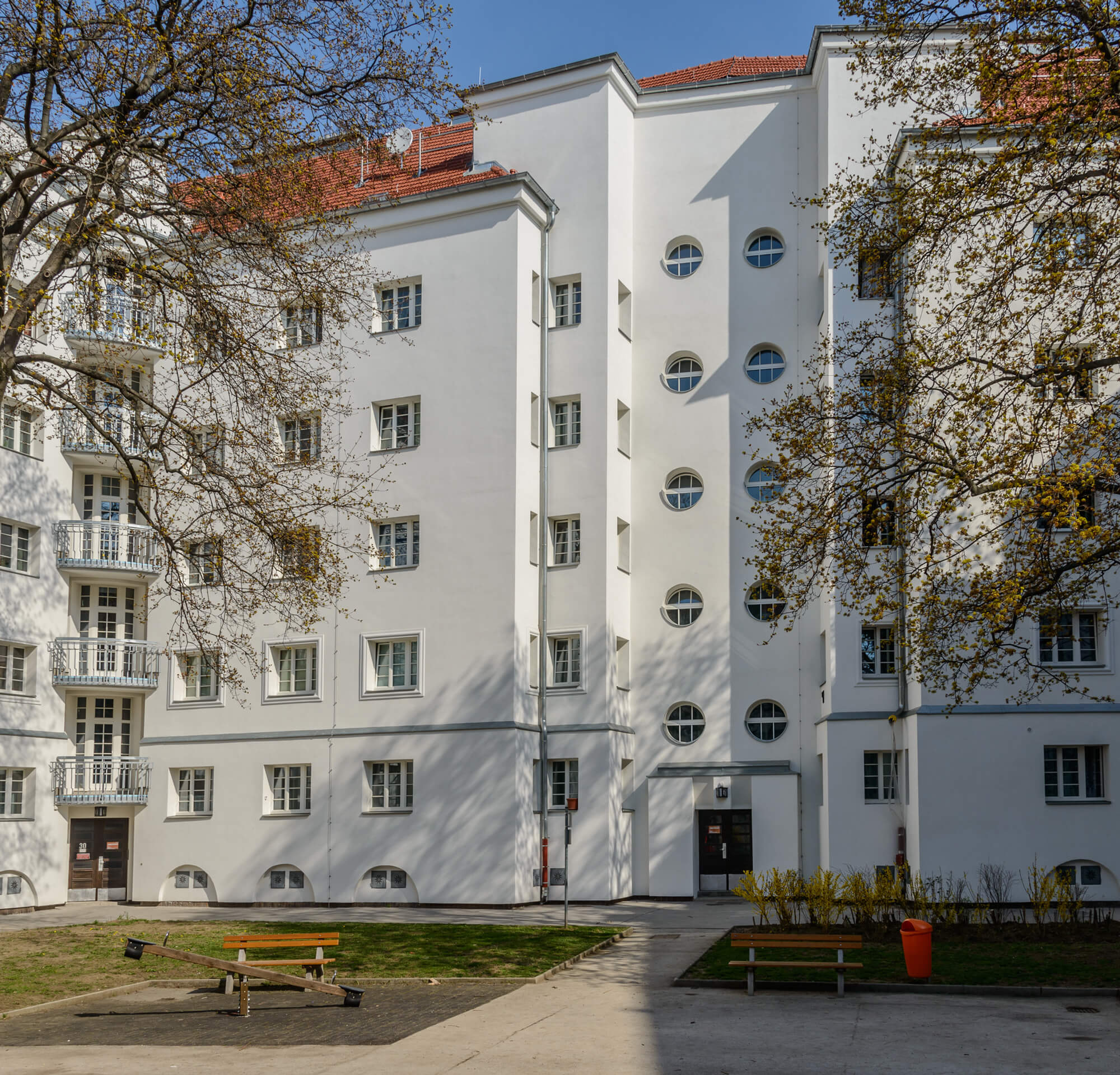 Diese städtische Wohnhausanlage wurde 1954-1955 errichtet. Sie umfasst 164 Wohnungen und wurde seinerzeit von den Architekten Johann (Hans) Stöhr und Wilhelm Kaiser geplant. Nun wird sie von Voitl & Co. in Arbeitsgemeinschaft mit der Firma Praher & Mathä Malereibetriebsges.m.b.H. unter Verwendung einer Sockelsanierungsförderung saniert.